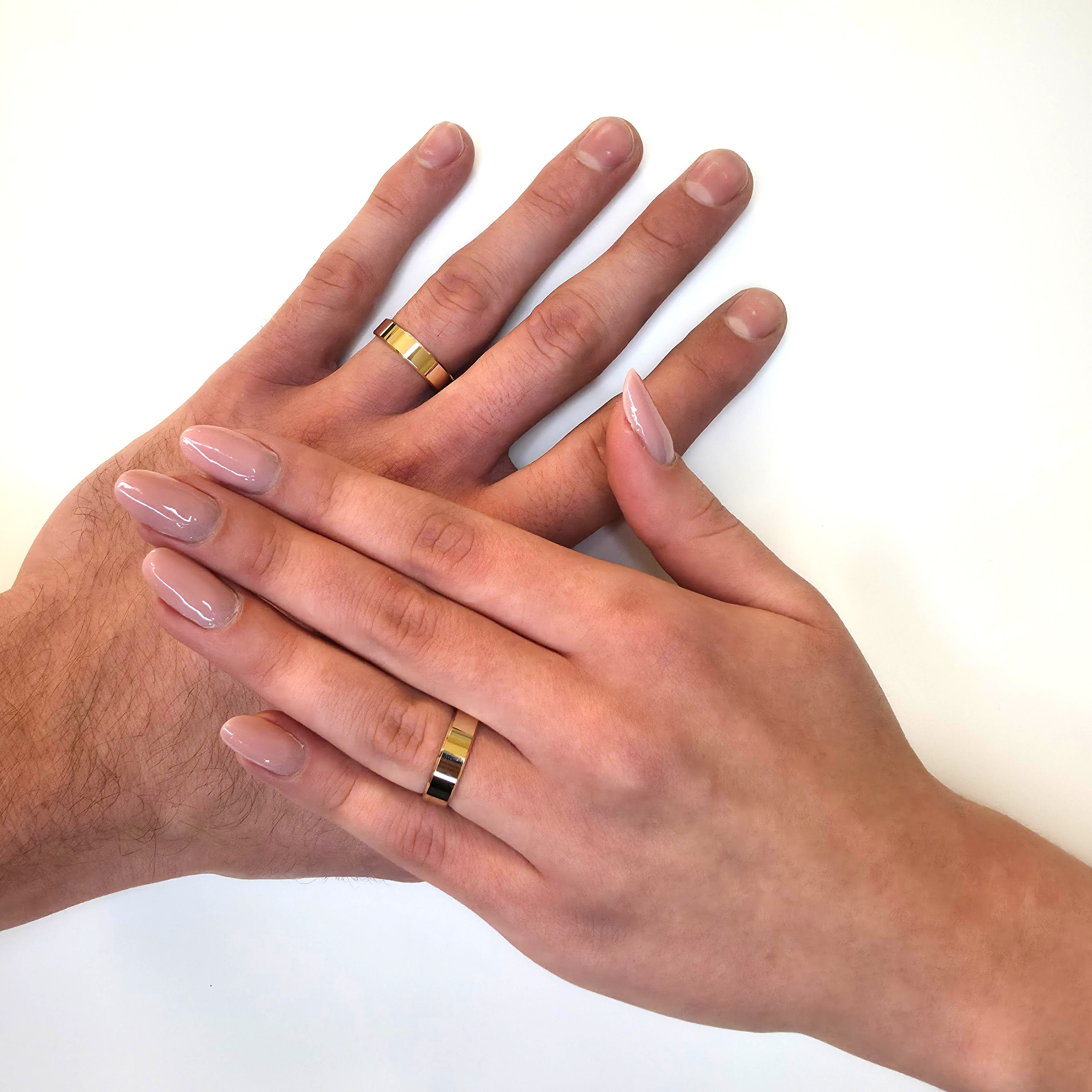 W komplecie znajdują się dwie obrączki – męska i damska – wykonane w wybranych przez Państwa rozmiarach. Na życzenie możliwa jest indywidualna konfiguracja szerokości każdej obrączki w zestawie.