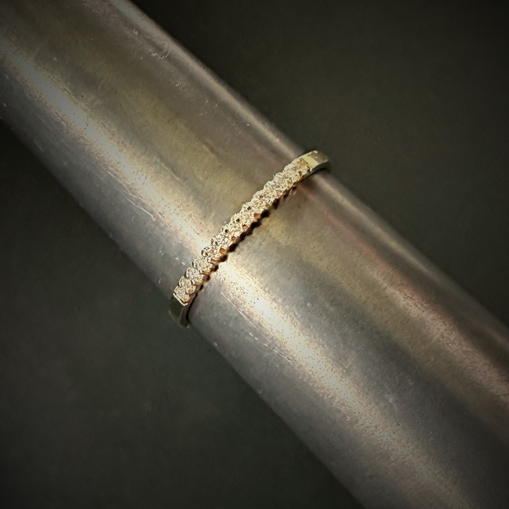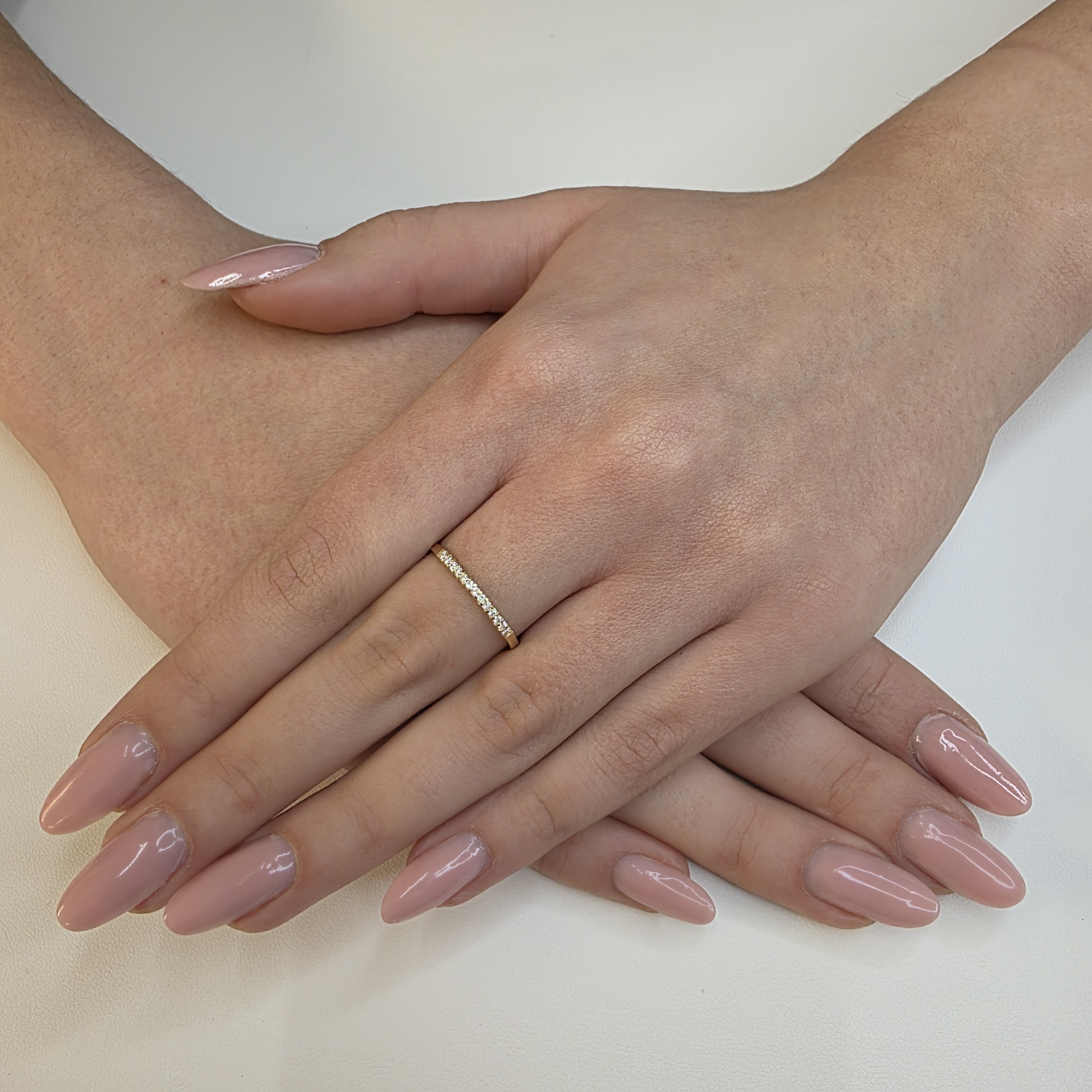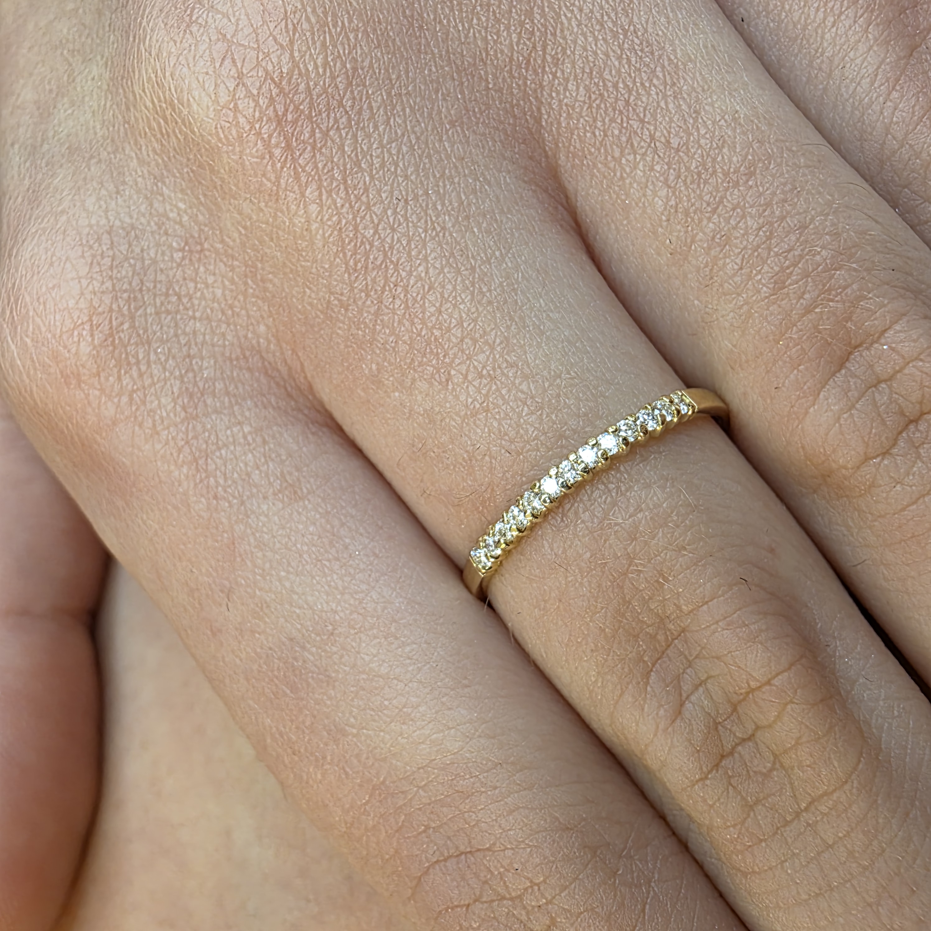 Każdy z 13 diamentów został osadzony w równych odstępach, tworząc linię jasnych, świetlistych punktów biegnących przez całą górną część obrączki. Delikatne brylanty o średnicy 1,25 mm dają efekt eleganckiego, dyskretnego połysku — idealnego do codziennego noszenia i łączenia z innymi pierścionkami.
