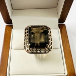 W centralnej części oprawiono naturalny kwarc dymny w szlifie emerald o wymiarach ok. 13,70 × 16,80 mm. Kamień stanowi dominujący, elegancki akcent całej kompozycji.