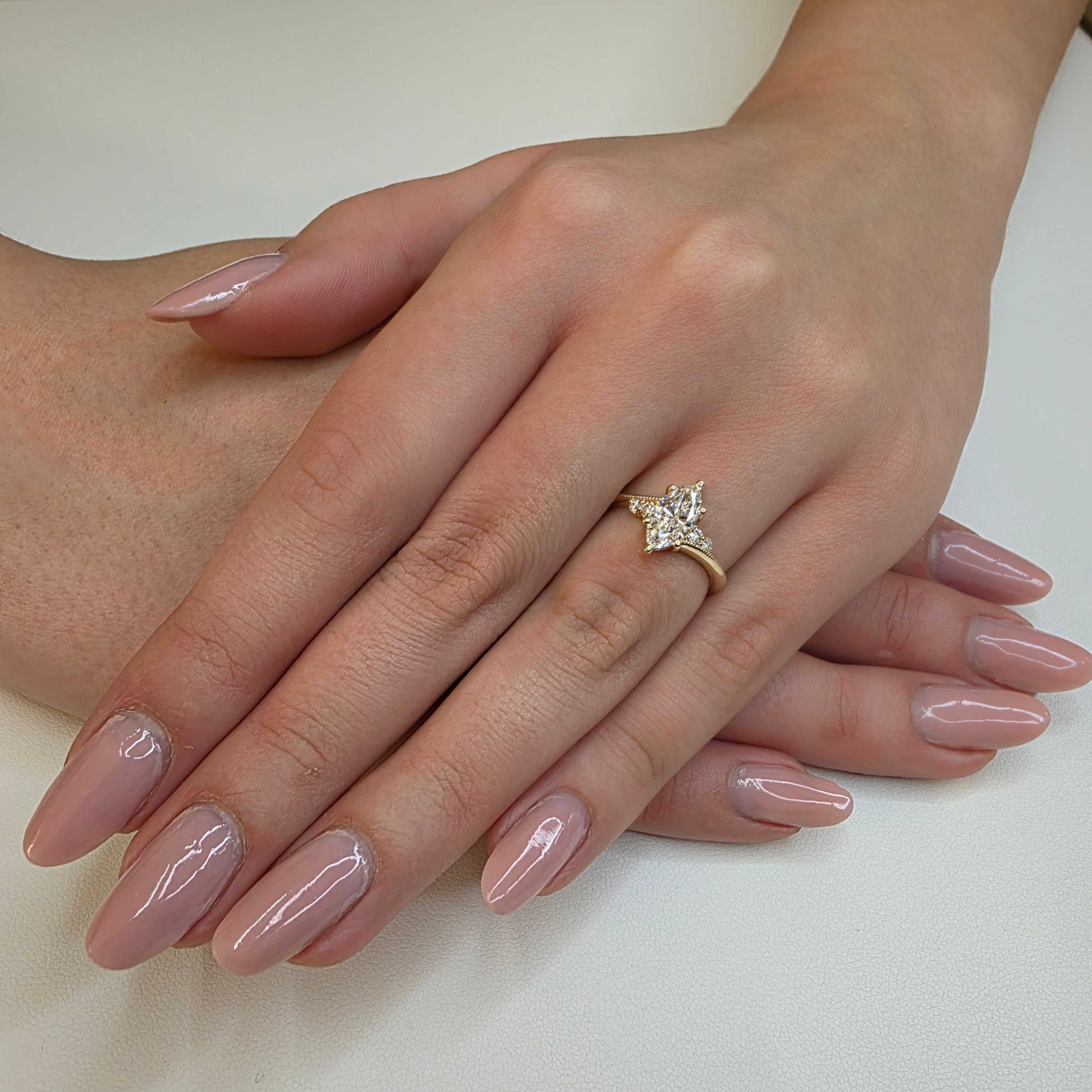 Kompozycję zdobią diamenty laboratoryjne o łącznej masie 1,00 ct. Centralnym elementem jest wyjątkowy diament w szlifie markiza o wymiarach 10,30 × 5,10 mm, który optycznie wydłuża palec i nadaje całości luksusowego charakteru.