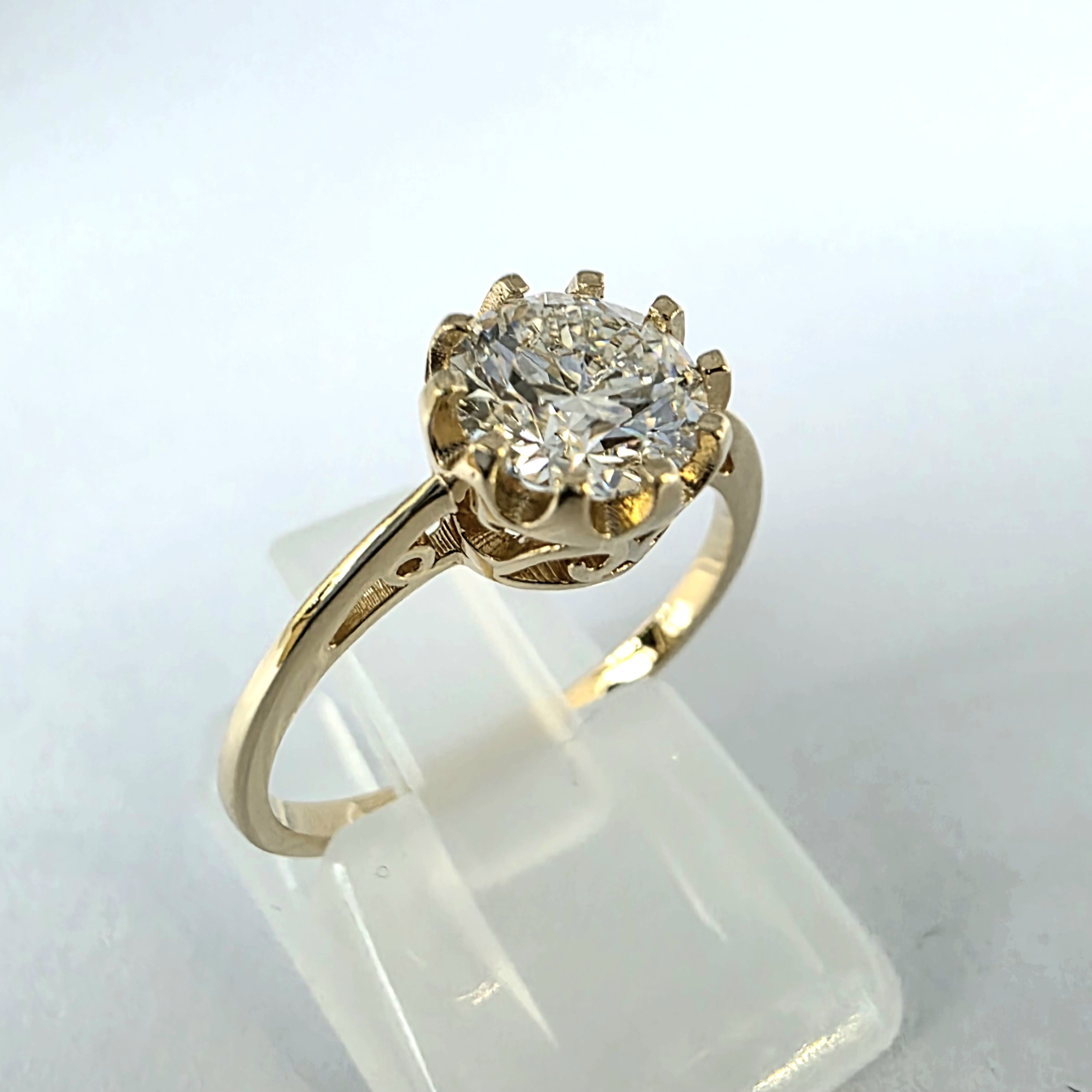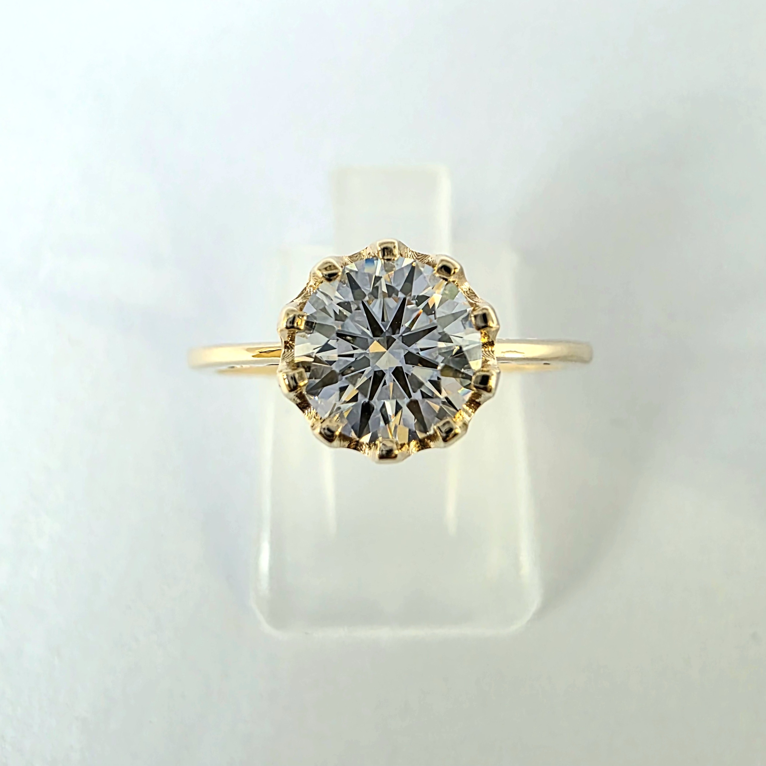 Całość tworzy harmonijną kompozycję, w której luksusowy blask diamentu doskonale kontrastuje z dekoracyjną, stylizowaną oprawą.