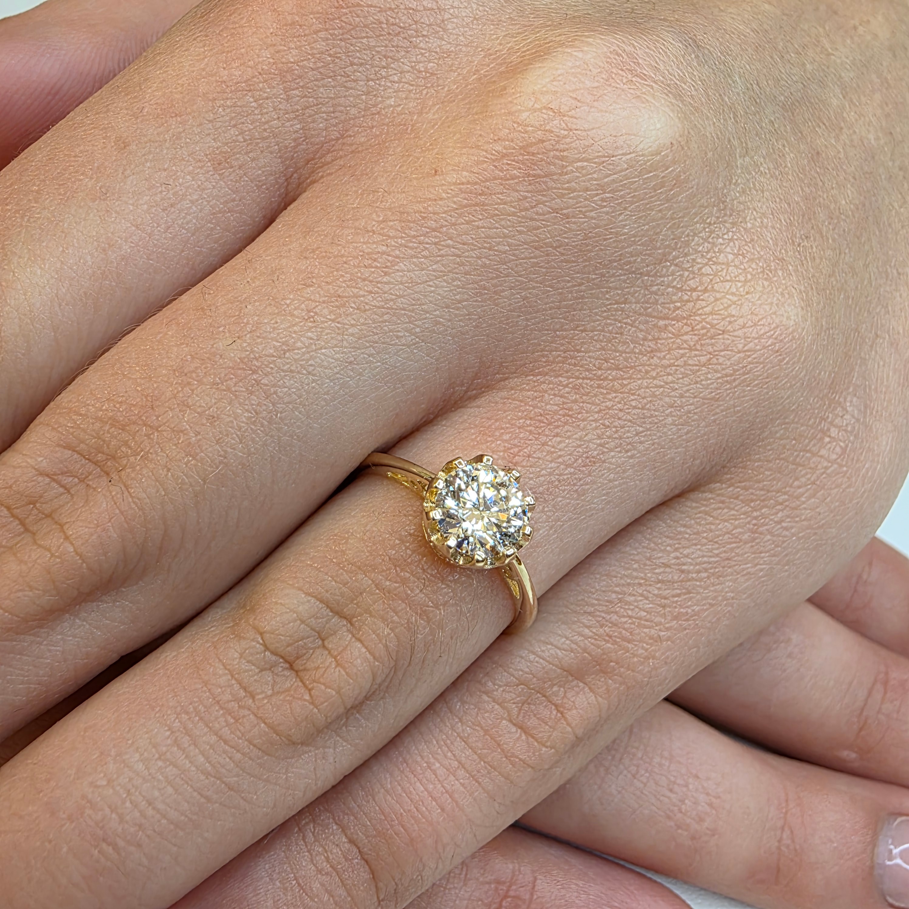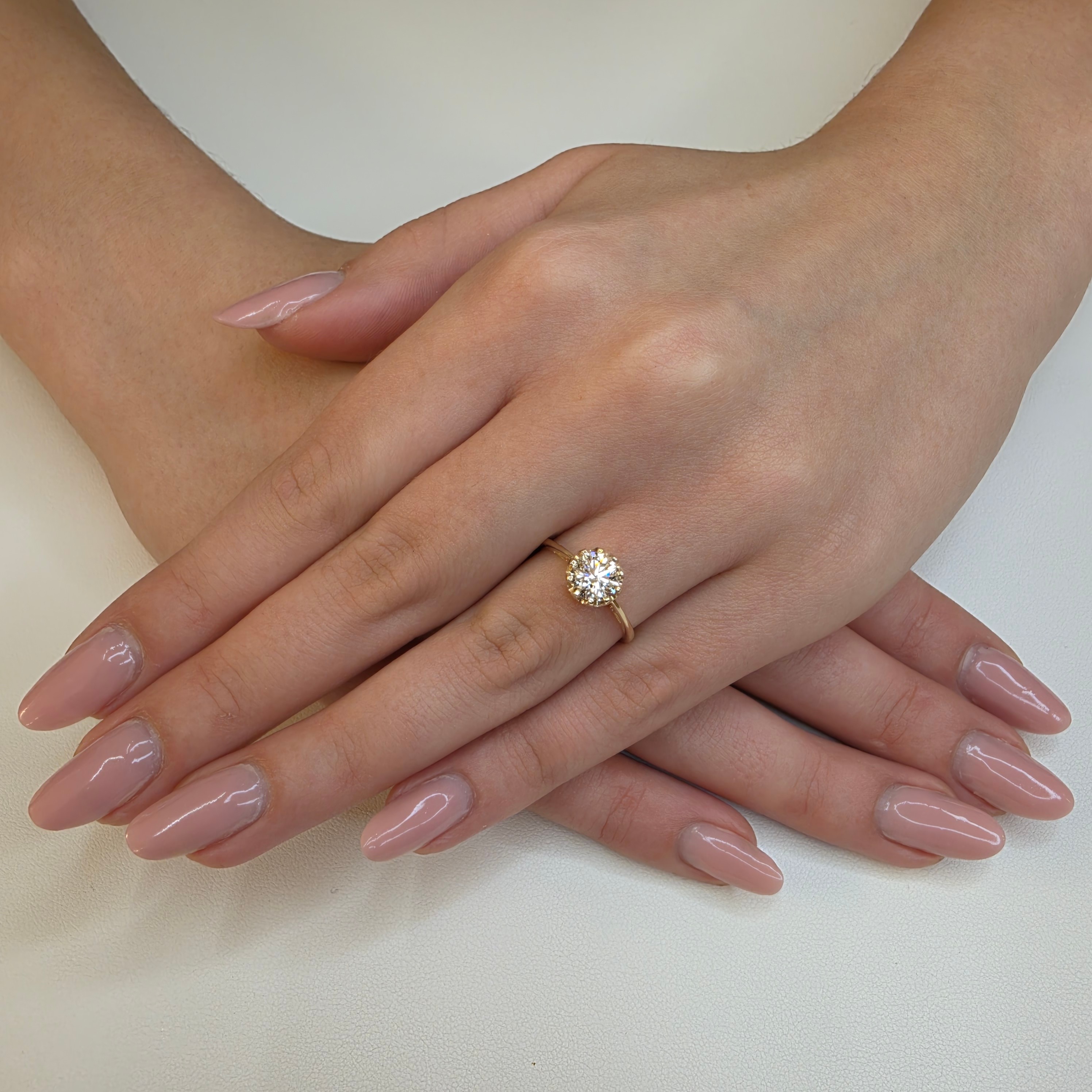 Szlif brylantowy okrągły podkreśla maksymalny połysk kamienia oraz jego klasyczną formę, czyniąc pierścionek idealnym zarówno jako model zaręczynowy, jak i luksusowa biżuteria do codziennego noszenia.