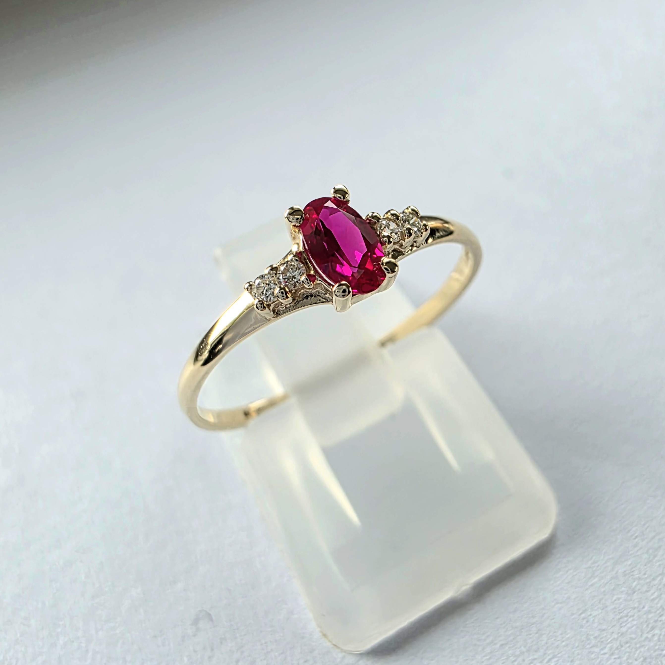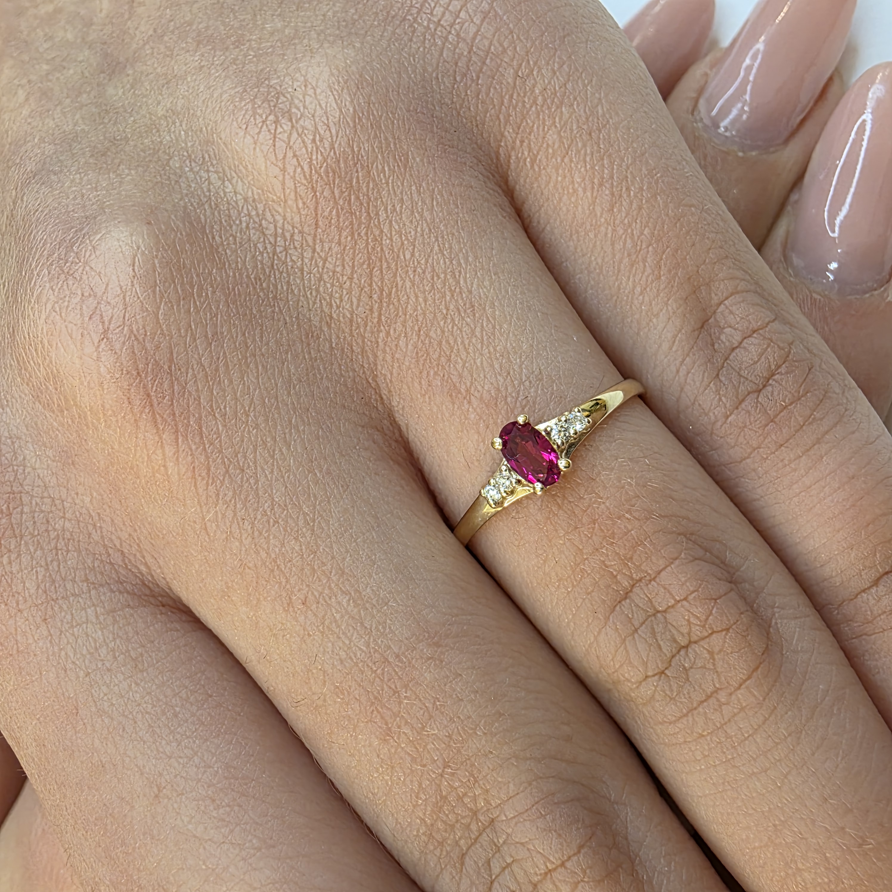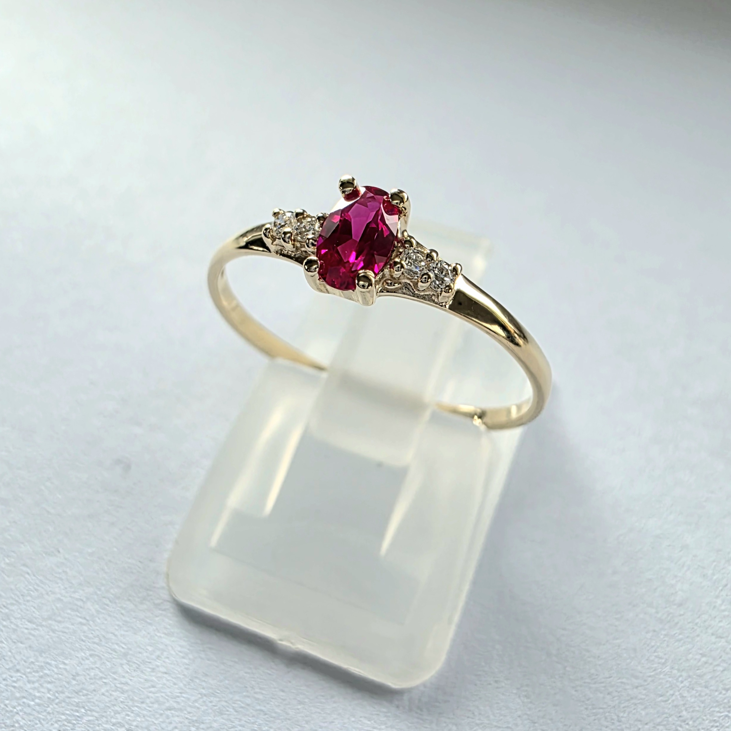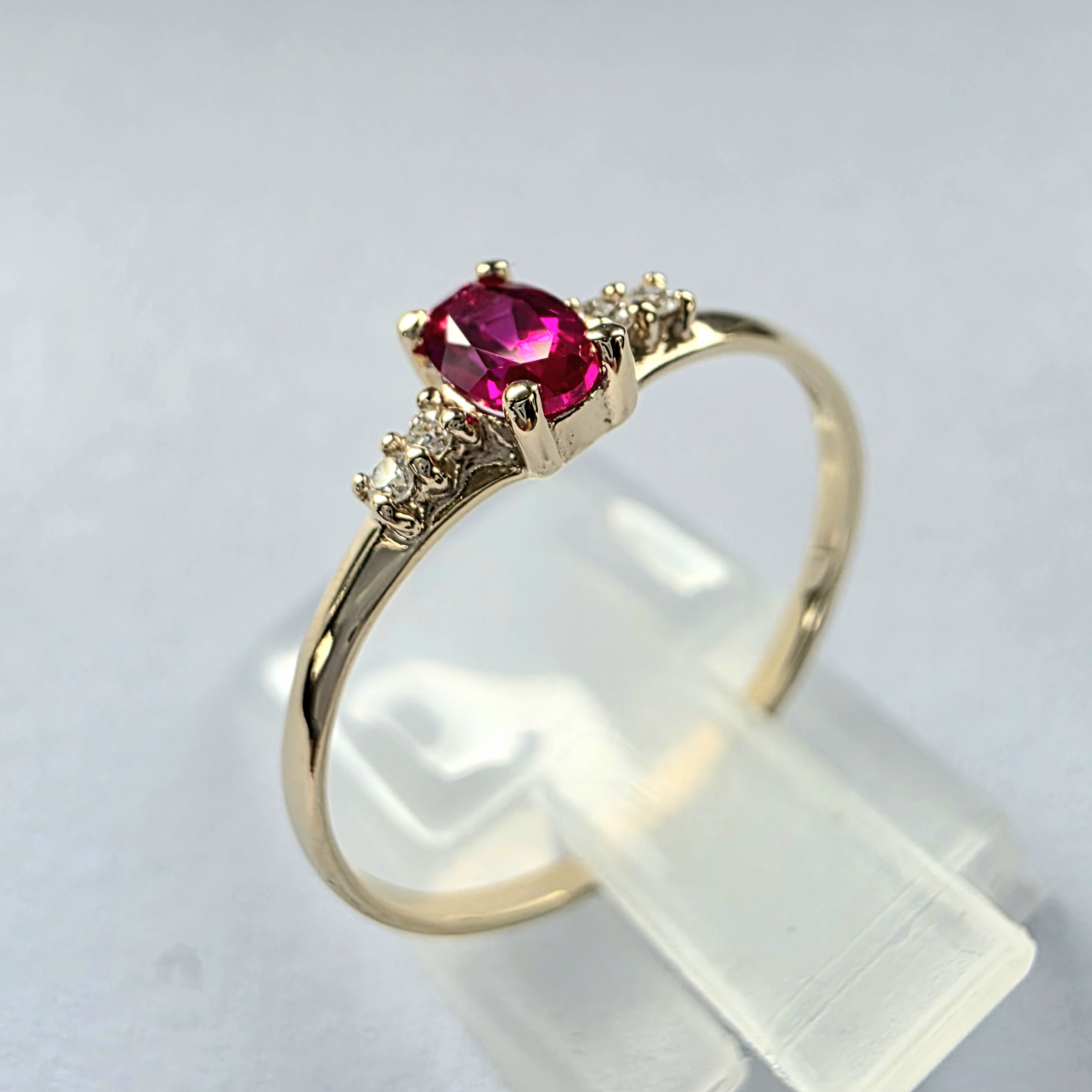Kamień centralny: rubin o masie około 0,30 ct i wymiarach około 5 × 3 mm (owalny szlif). Pierścionek jest dodatkowo ozdobiony diamentami o łącznej masie około 0,04 ct, rozmieszczonymi jako 4 kamienie po ok. 1,25 mm. Całość wykonano z żółtego złota próby 585, a masa produktu wynosi w przybliżeniu 0,90–1,30 g, co czyni model lekkim i wygodnym.