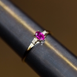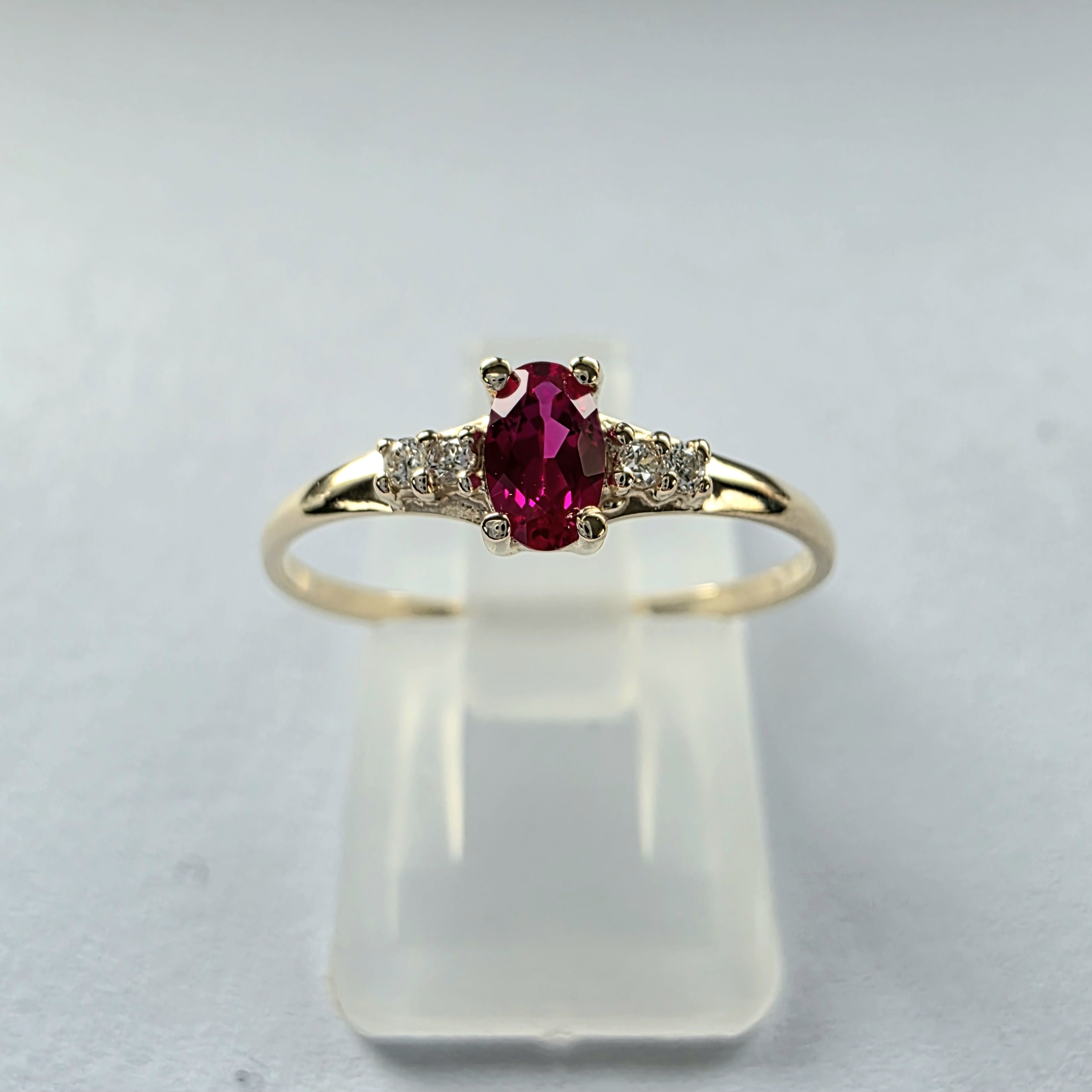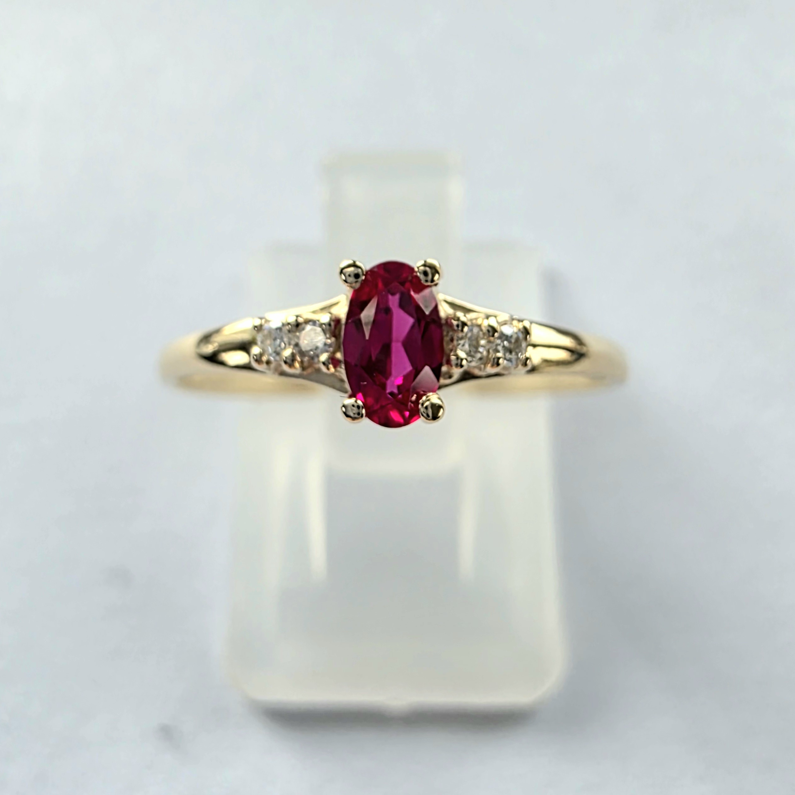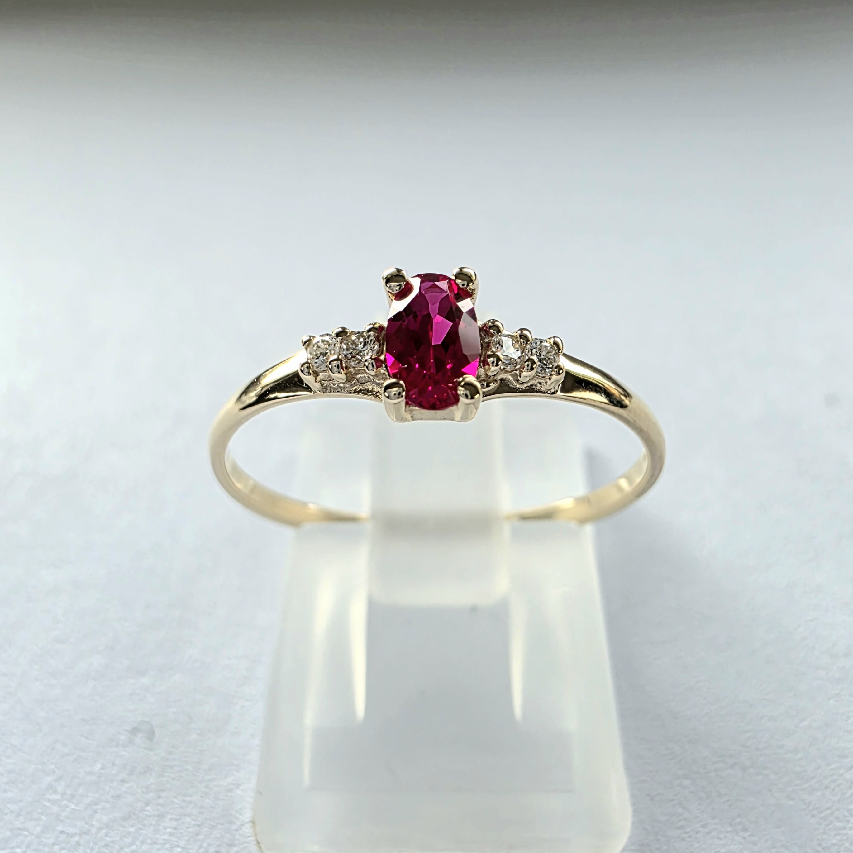 Kamień centralny: rubin o masie około 0,30 ct i wymiarach około 5 × 3 mm (owalny szlif). Pierścionek jest dodatkowo ozdobiony diamentami o łącznej masie około 0,04 ct, rozmieszczonymi jako 4 kamienie po ok. 1,25 mm. Całość wykonano z żółtego złota próby 585, a masa produktu wynosi w przybliżeniu 0,90–1,30 g, co czyni model lekkim i wygodnym.