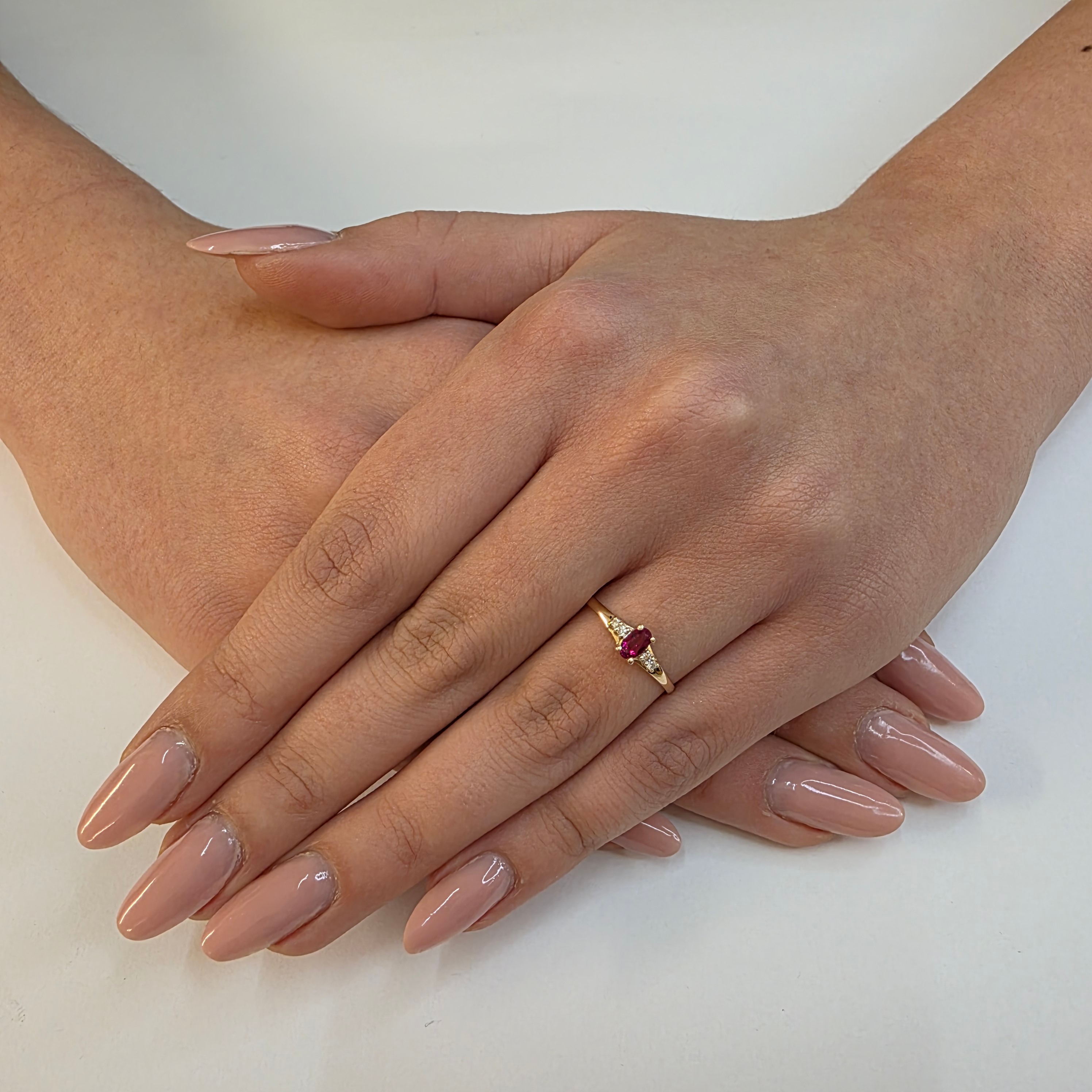 Subtelny pierścionek wykonany ze złota próby 585, ozdobiony naturalnym rubinem w owalnym szlifie oraz dodatkowymi diamentami. Każdy egzemplarz powstaje ręcznie w pracowni ABgold | Baczyński — z dbałością o proporcje, wykończenie i komfort noszenia.