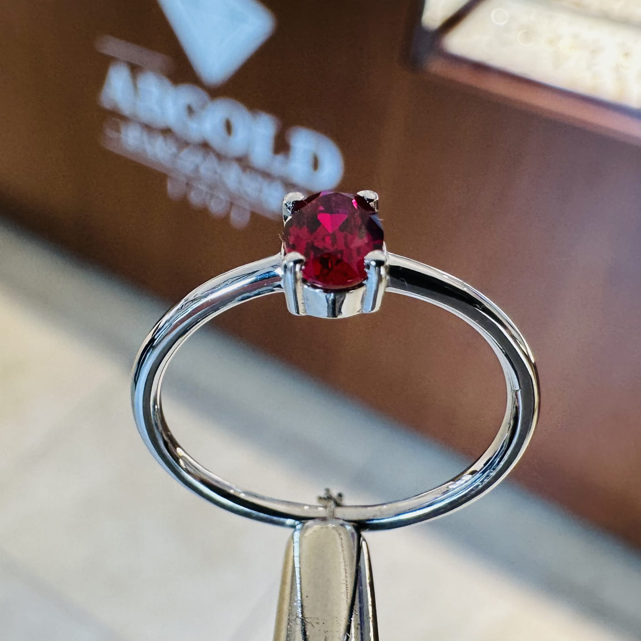 Elegancki pierścionek wykonany z białego złota próby 585 (14K), ozdobiony rubinem w szlifie owalnym. Prosta, klasyczna forma pozwala w pełni wyeksponować kamień, nadając biżuterii wyrazisty, a jednocześnie subtelny charakter. To model, który łączy estetykę z ponadczasową elegancją.