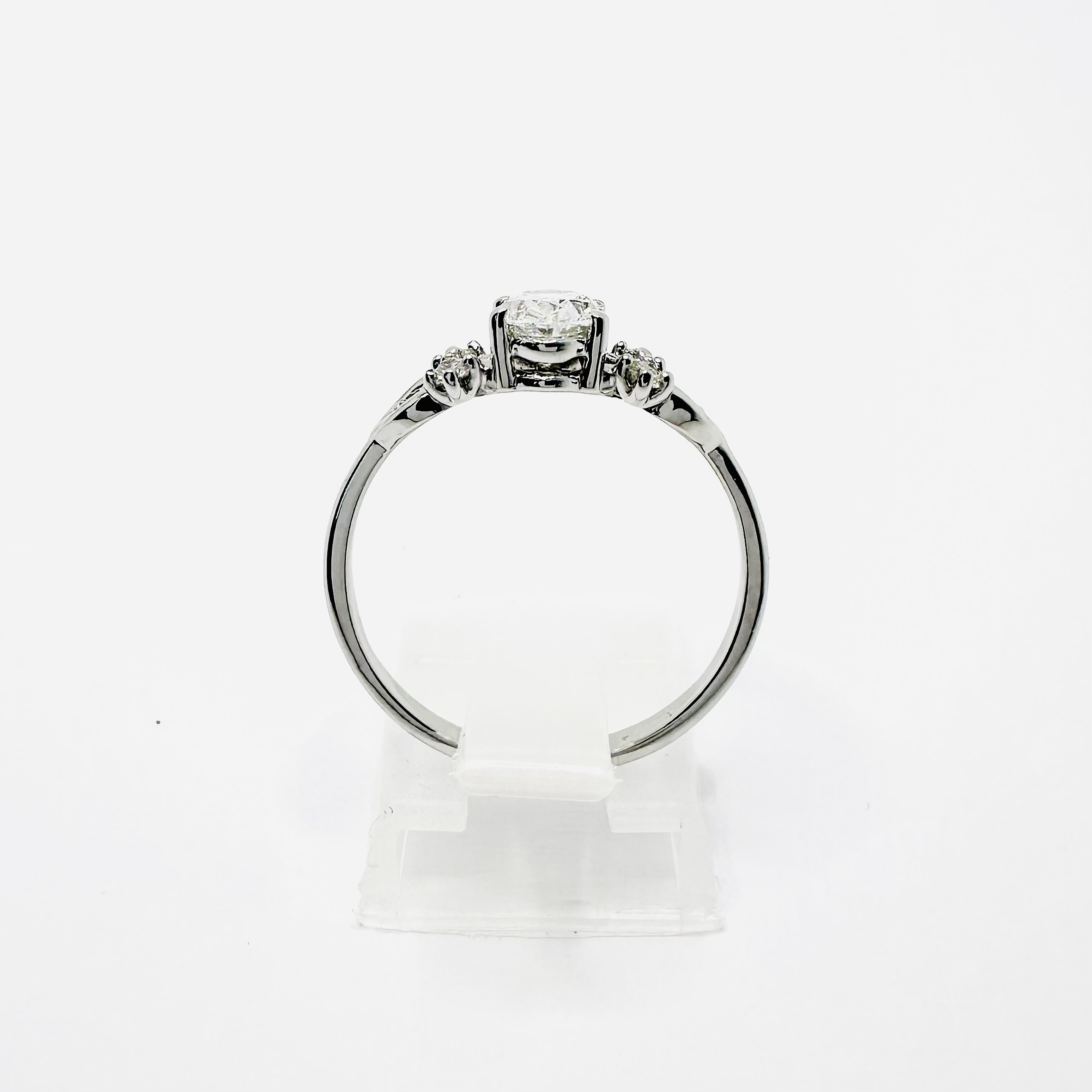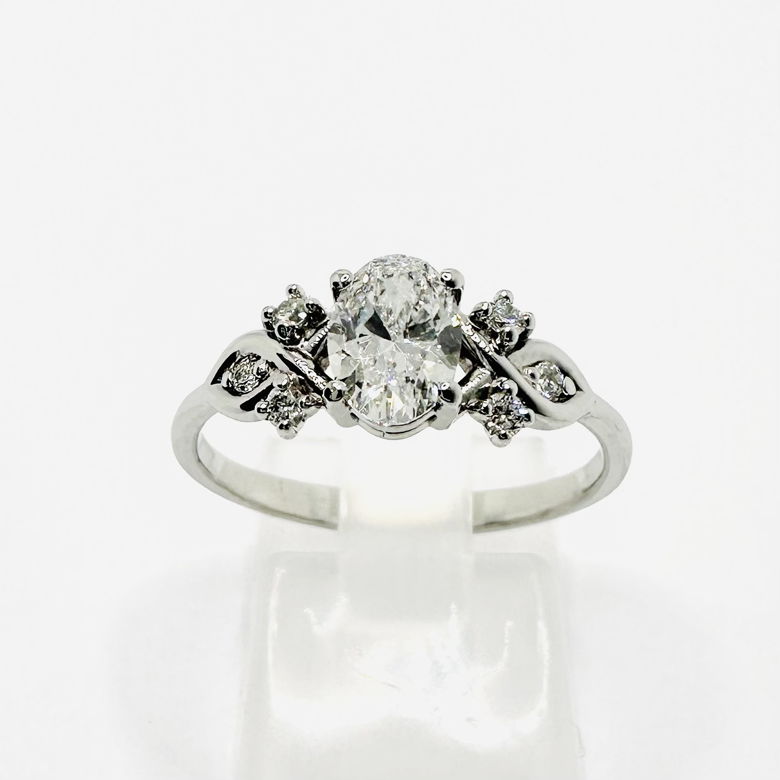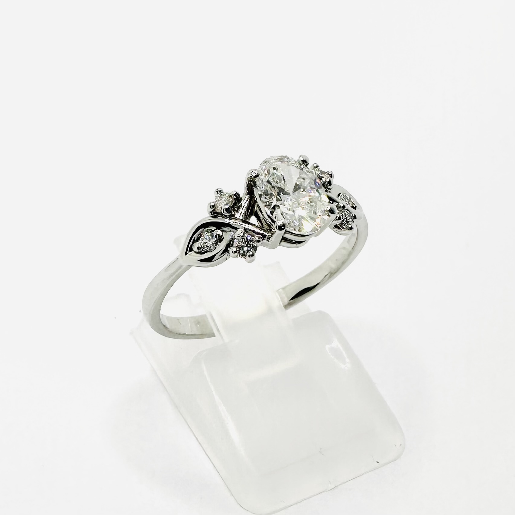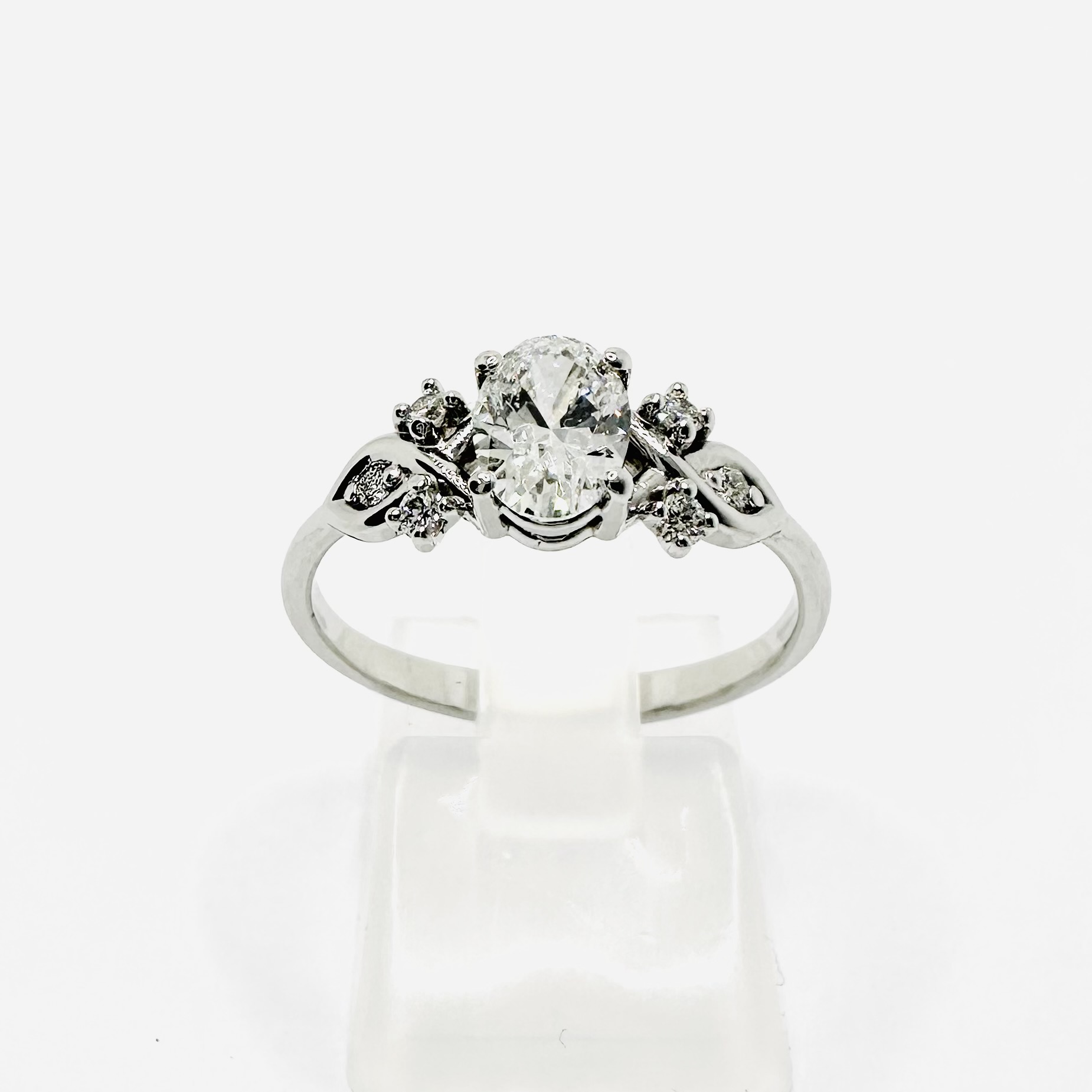 W centrum oprawiono diament laboratoryjny (lab-grown) o masie około 0,75 ct, w eleganckim szlifie owalnym i wymiarach zbliżonych do 7 × 5 mm. Po bokach znajdują się mniejsze diamenty laboratoryjne w szlifie brylantowym o średnicy około 1,75 mm, których łączna masa wynosi około 0,15 ct.