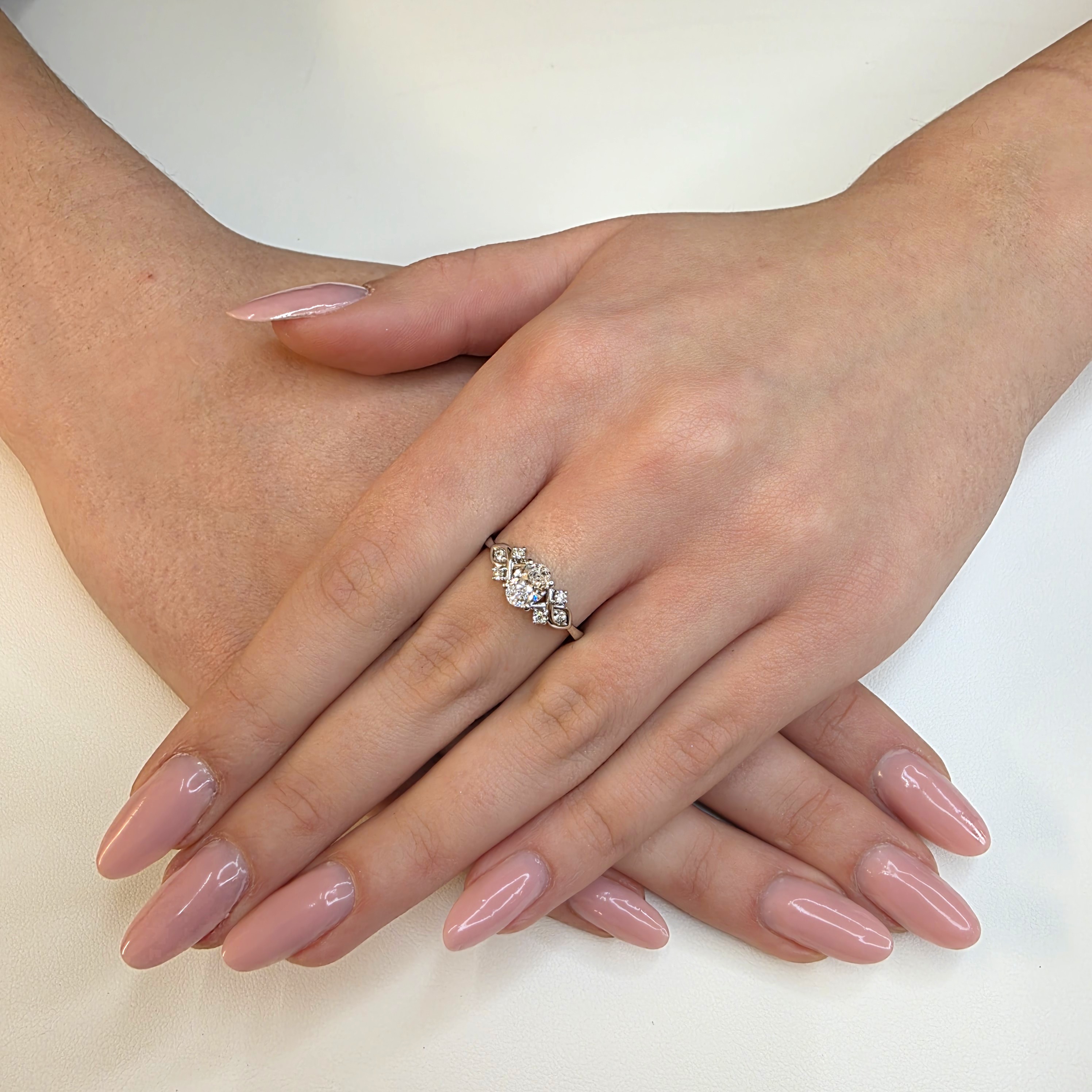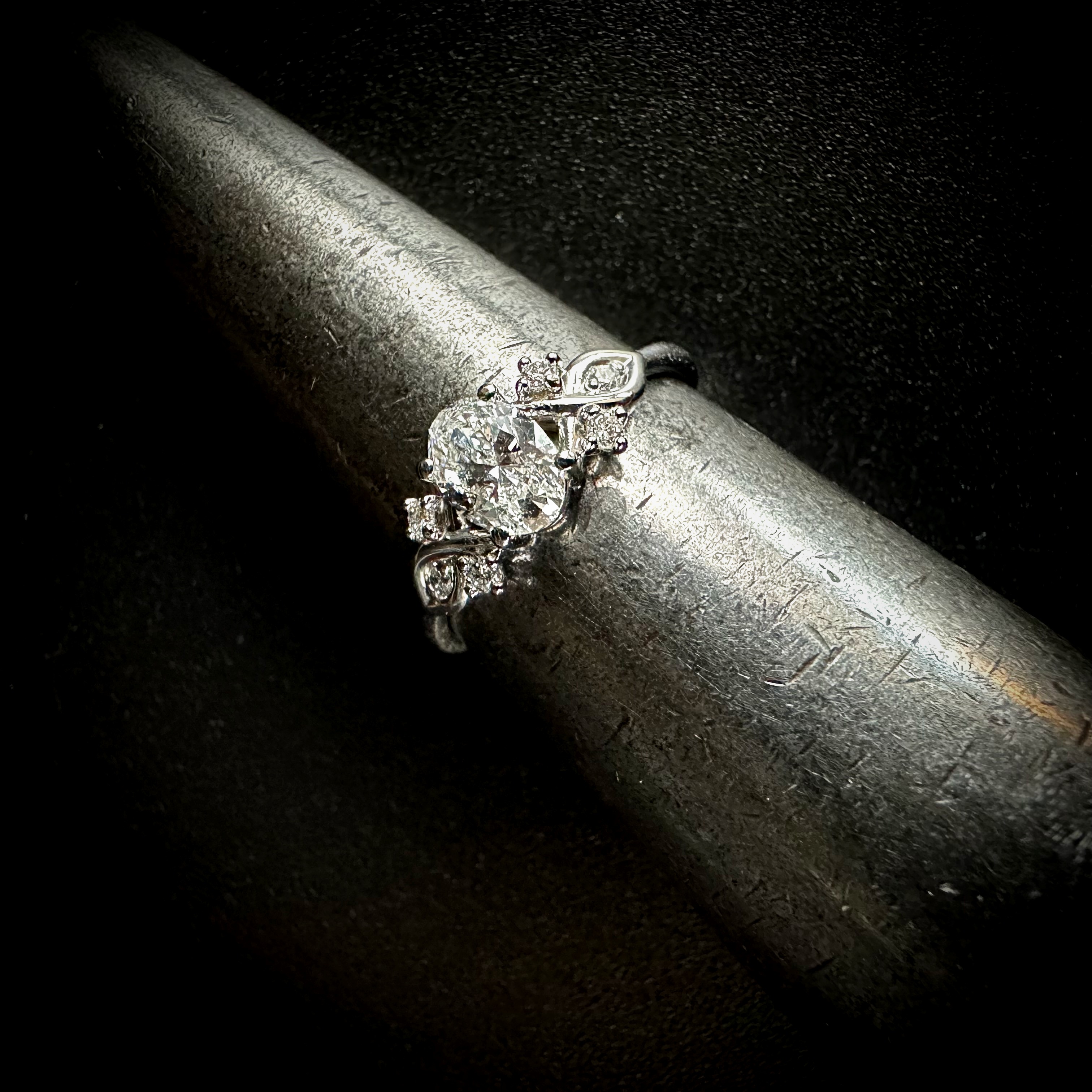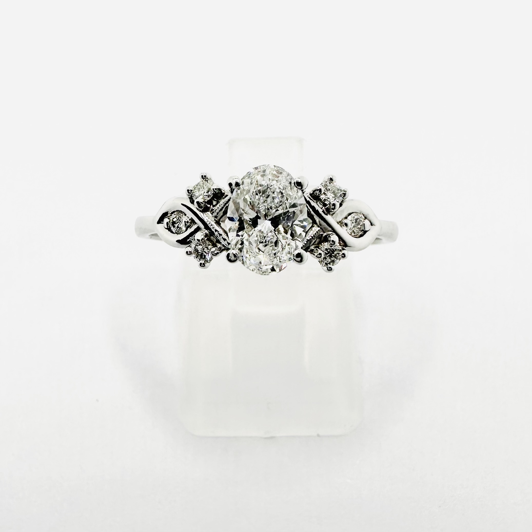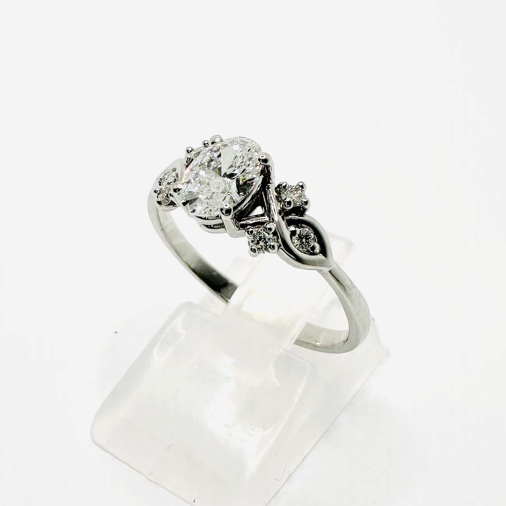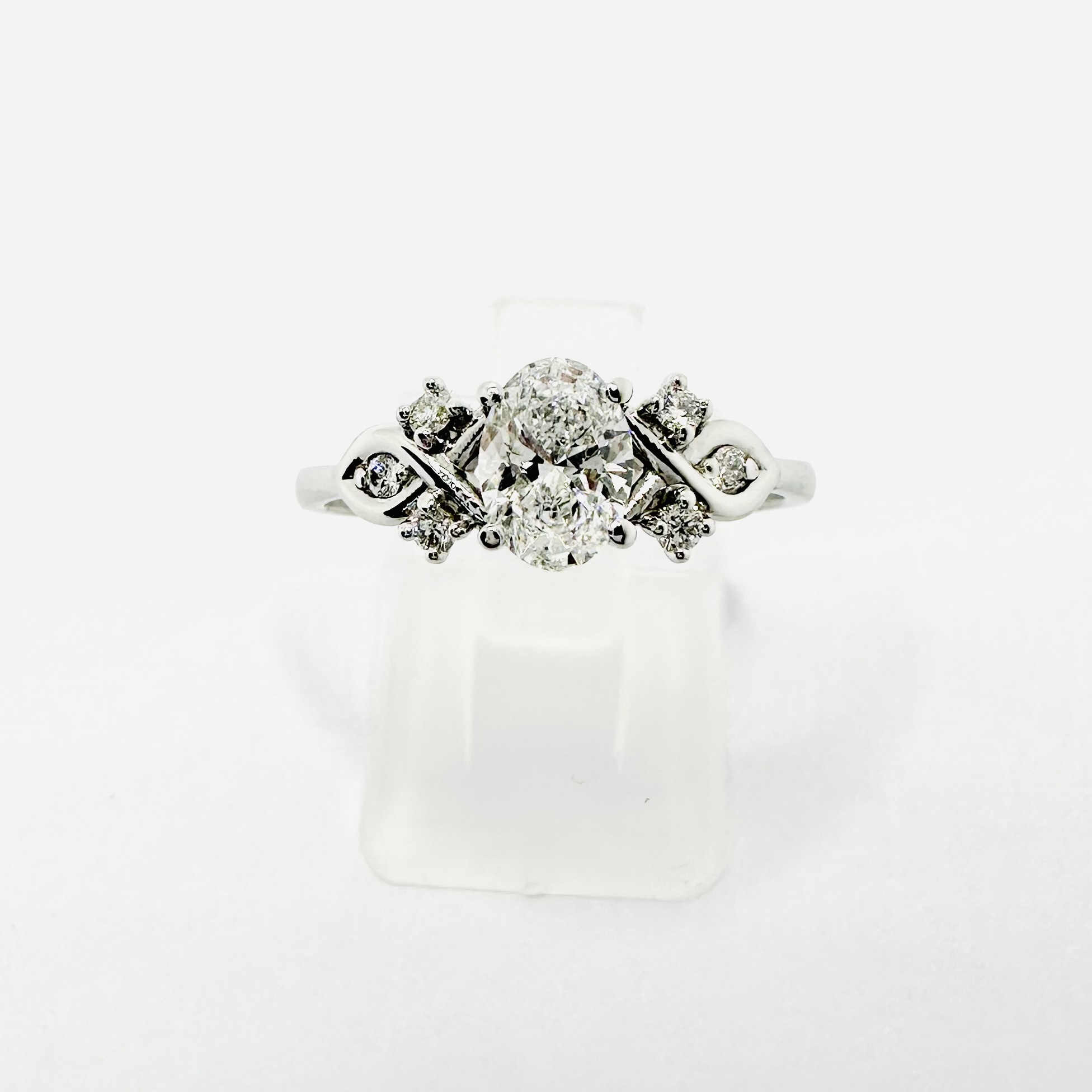 W centrum oprawiono diament laboratoryjny (lab-grown) o masie około 0,75 ct, w eleganckim szlifie owalnym i wymiarach zbliżonych do 7 × 5 mm. Po bokach znajdują się mniejsze diamenty laboratoryjne w szlifie brylantowym o średnicy około 1,75 mm, których łączna masa wynosi około 0,15 ct.