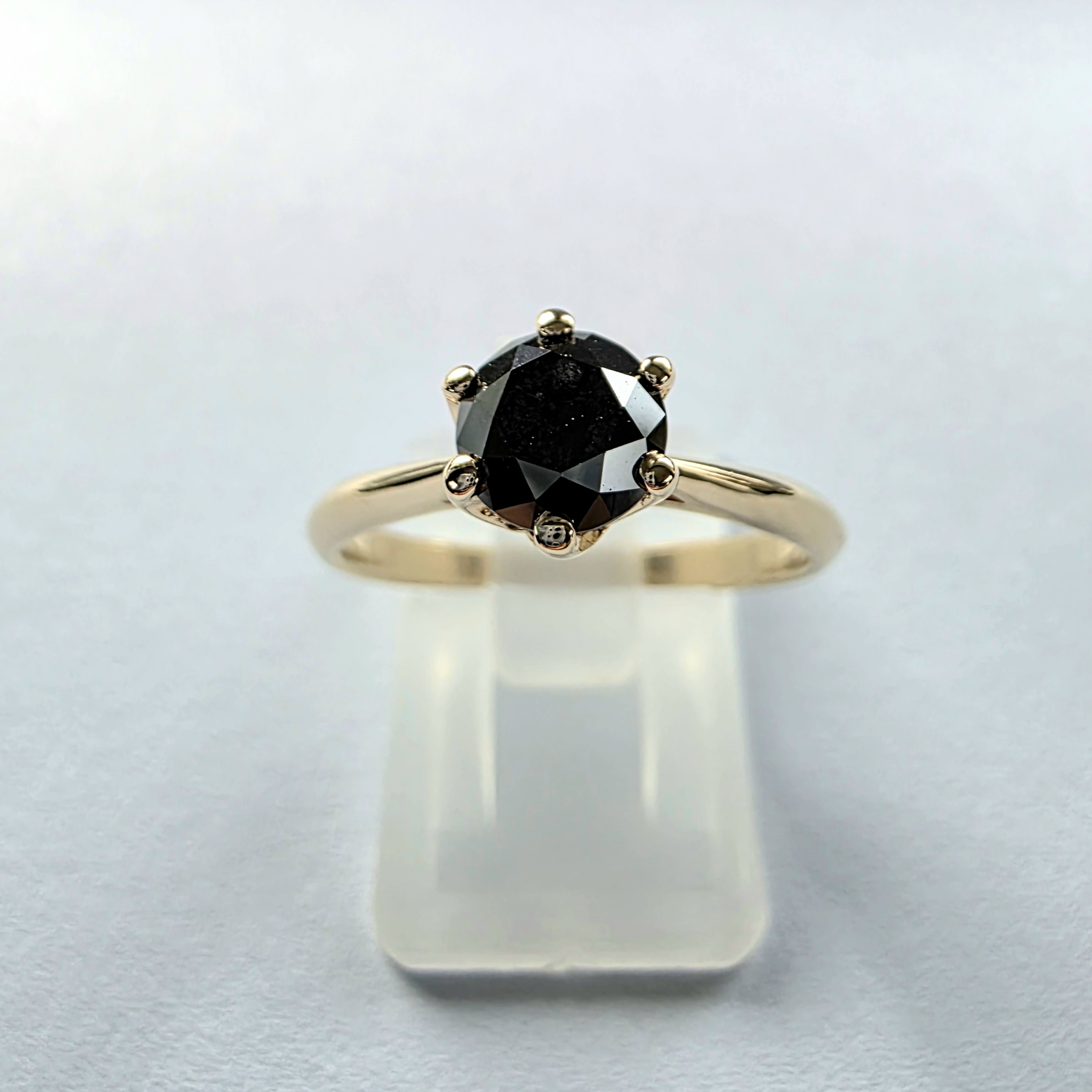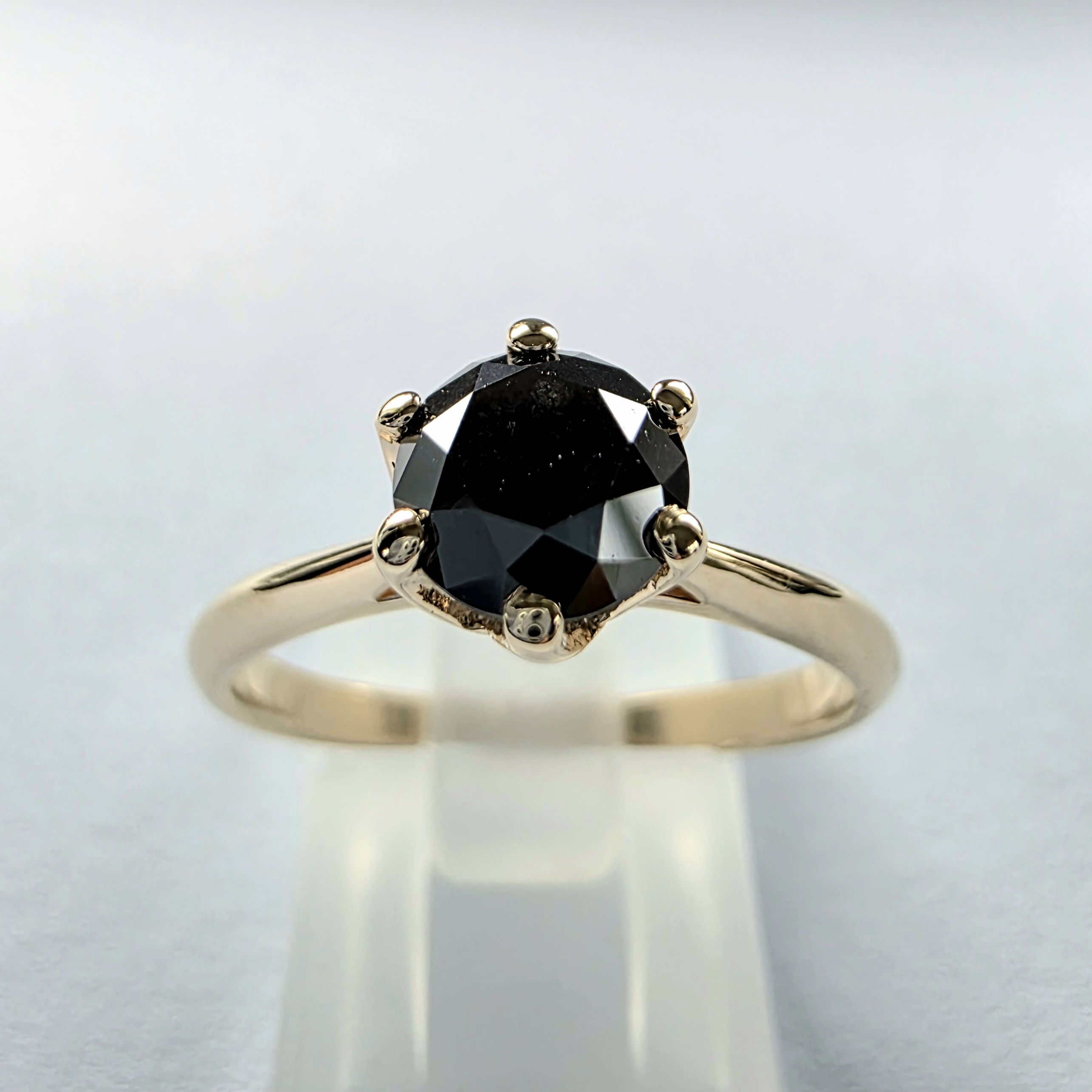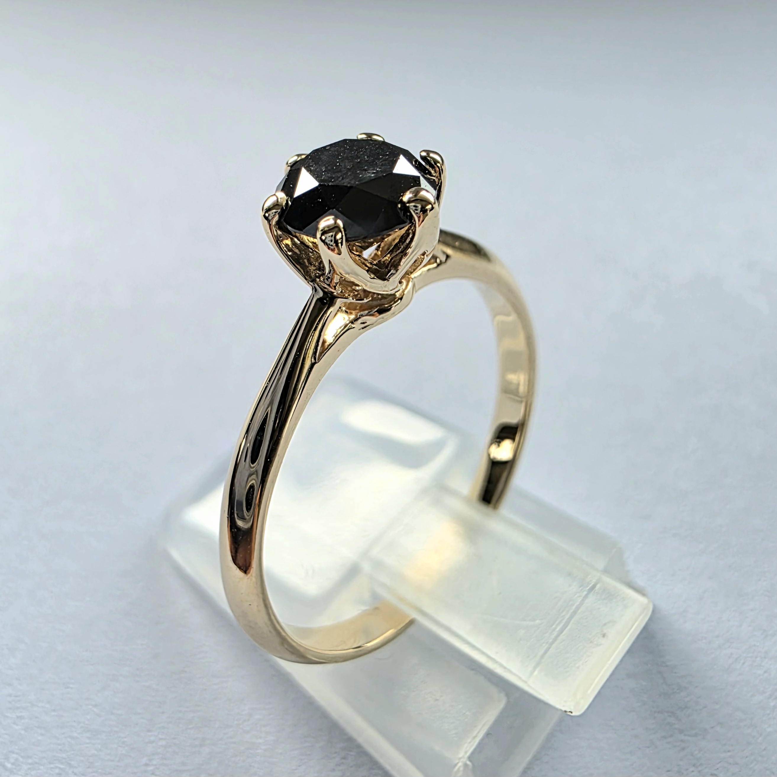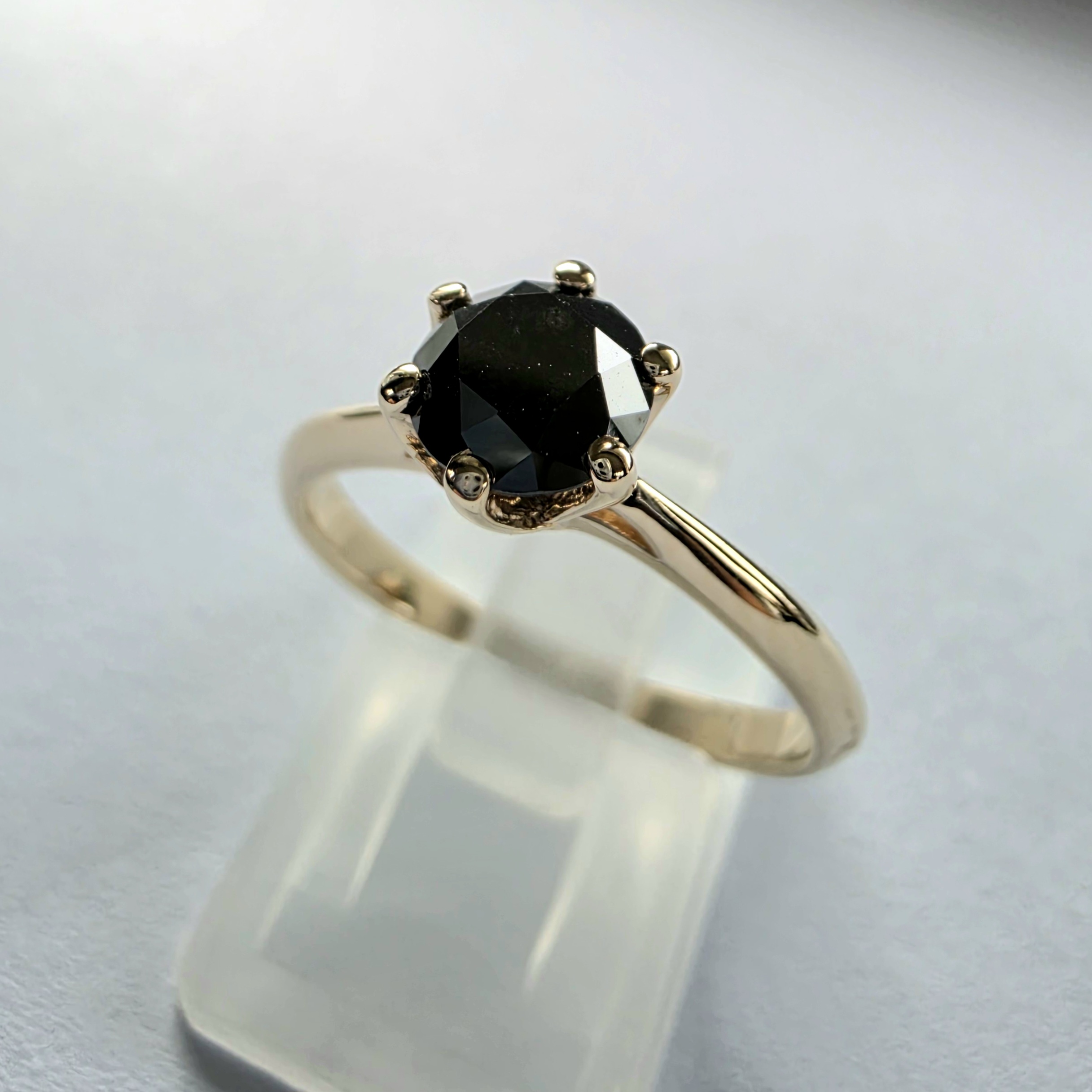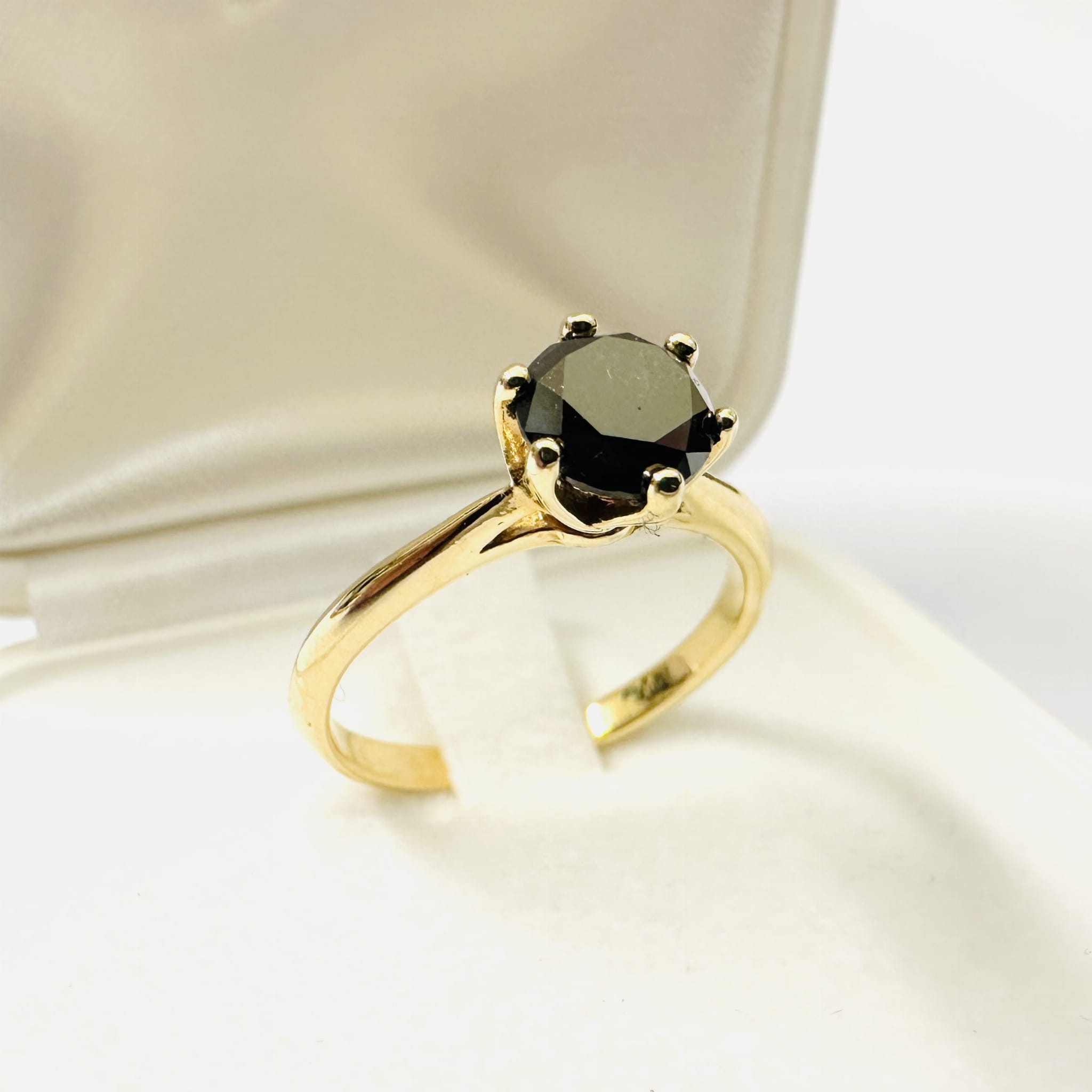Wyrazisty pierścionek wykonany z żółtego złota próby 585 (14K). Główną ozdobą jest naturalny czarny diament o masie około 1,00 ct, osadzony w klasycznym, okrągłym, brylantowym szlifie — to propozycja dla osób ceniących elegancję i oryginalny styl z nutą luksusu.