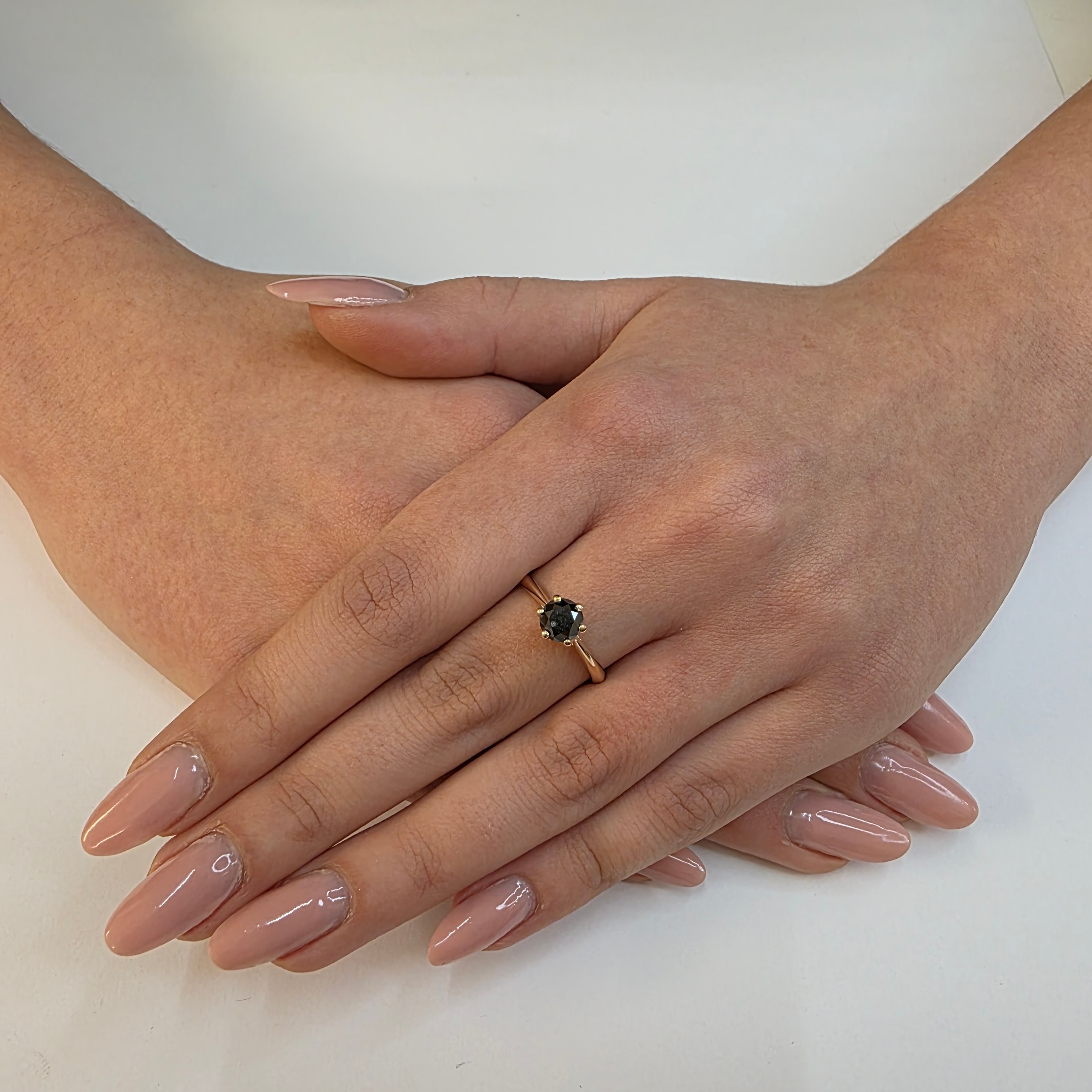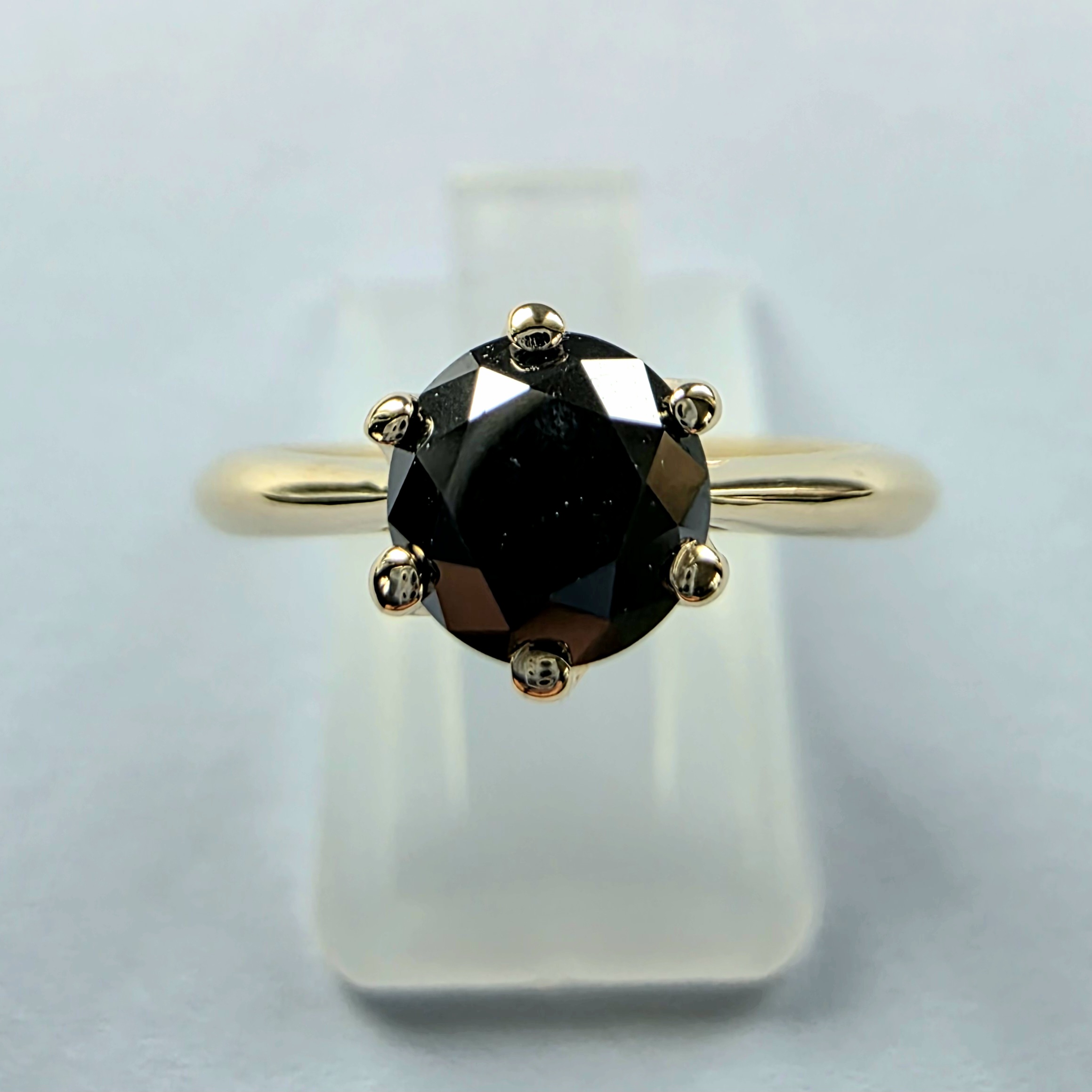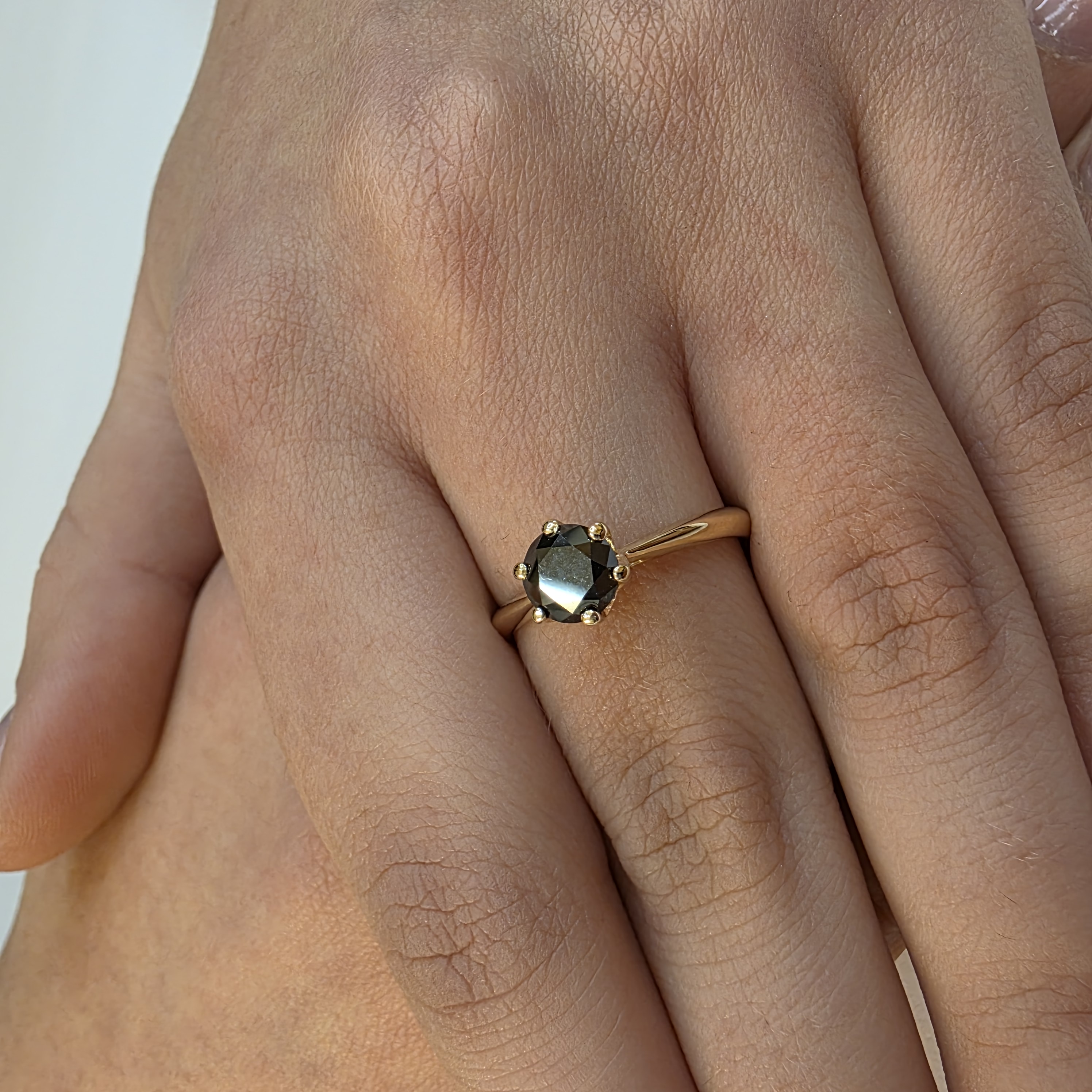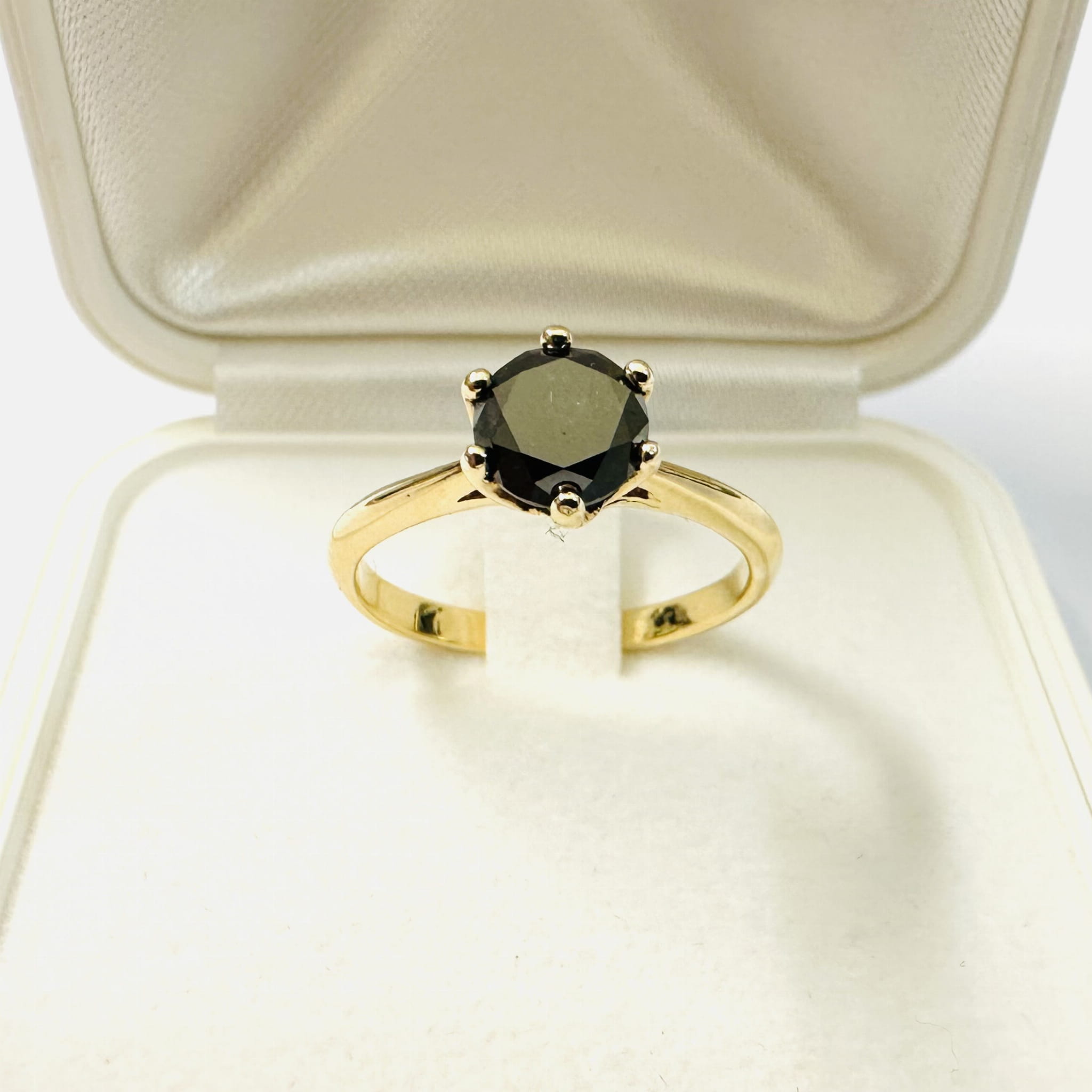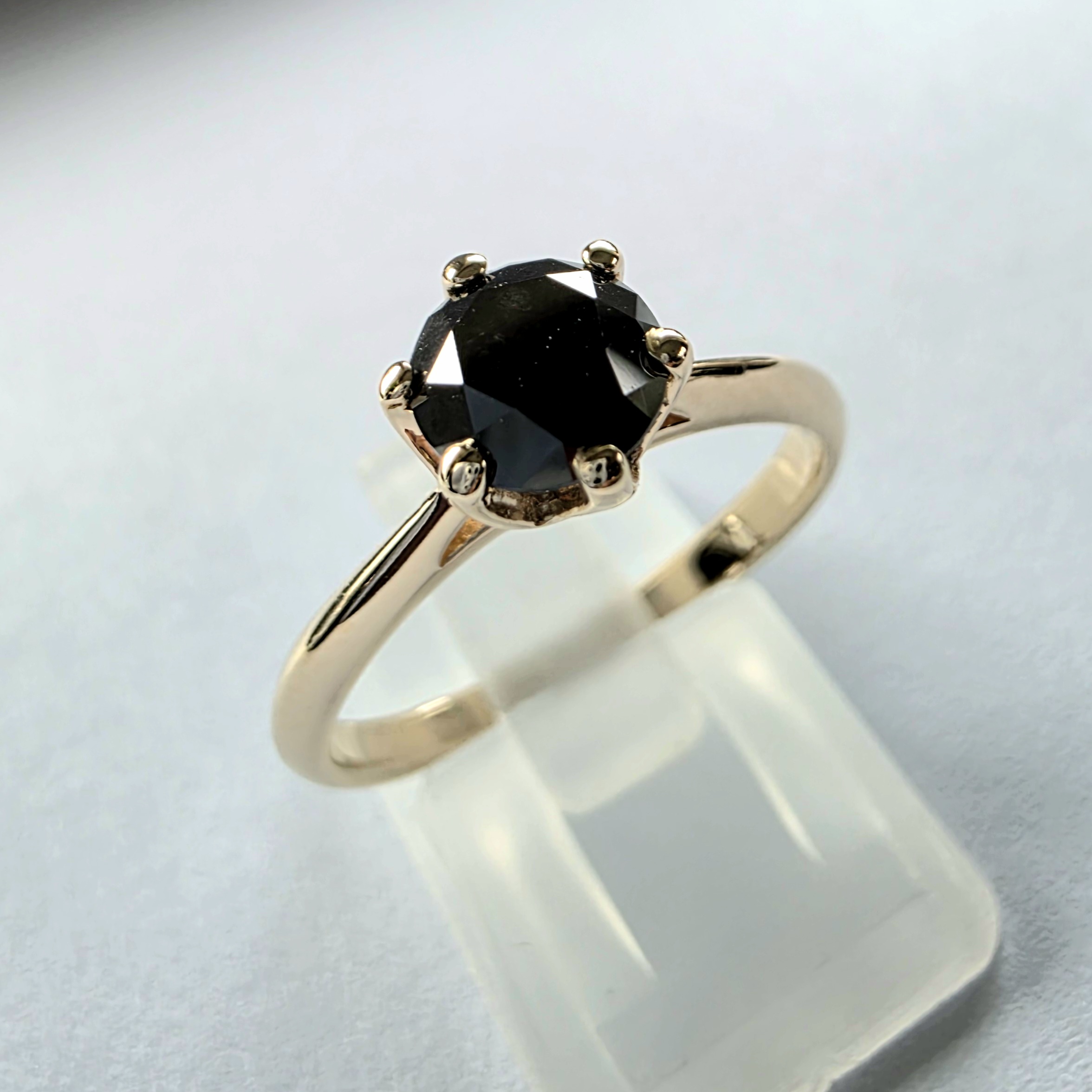 Wyrazisty pierścionek wykonany z żółtego złota próby 585 (14K). Główną ozdobą jest naturalny czarny diament o masie około 1,00 ct, osadzony w klasycznym, okrągłym, brylantowym szlifie — to propozycja dla osób ceniących elegancję i oryginalny styl z nutą luksusu.