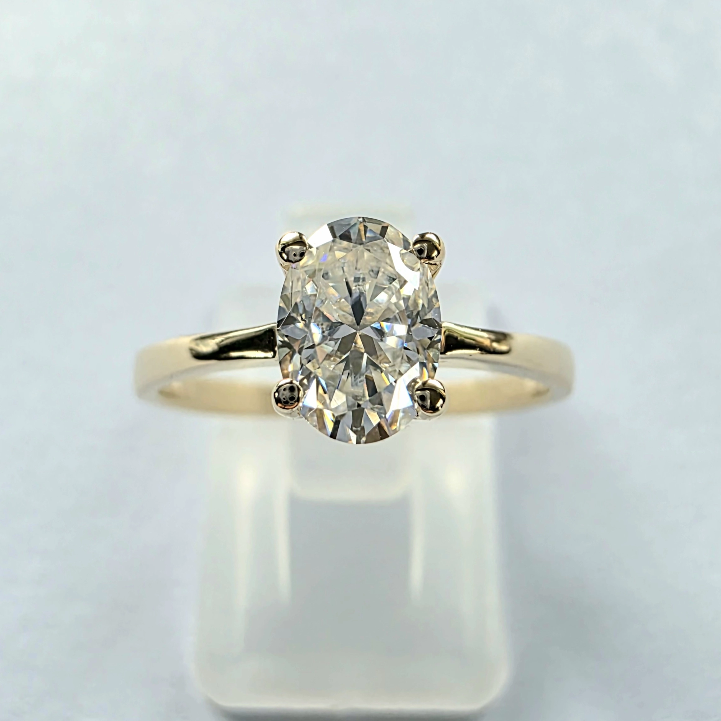 Elegancki pierścionek wykonany z żółtego złota próby 585 (14K). Jego centralnym elementem jest diament laboratoryjny w szlifie owalnym, który nadaje biżuterii ponadczasowy charakter, subtelnie wydłuża linię palca i pięknie odbija światło.