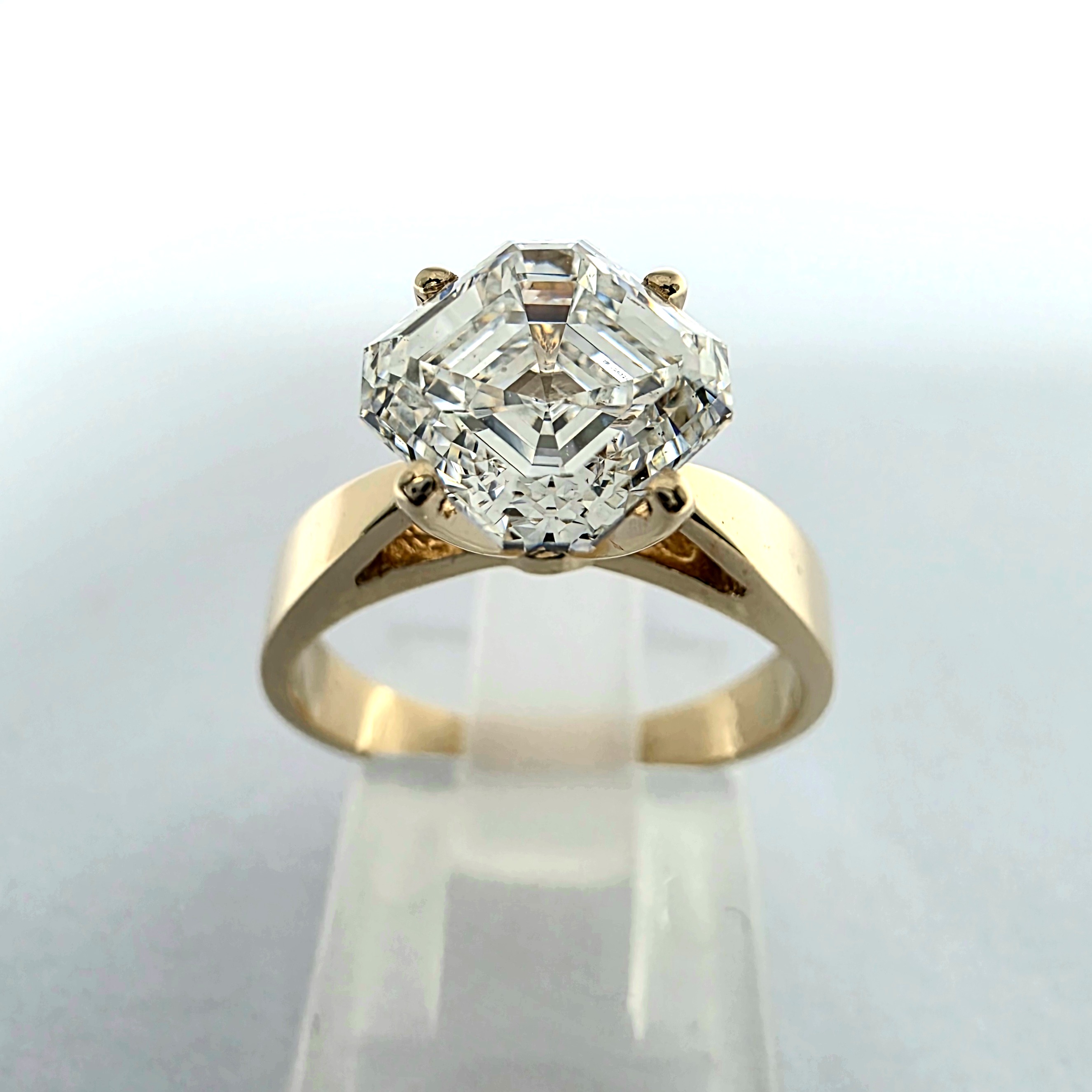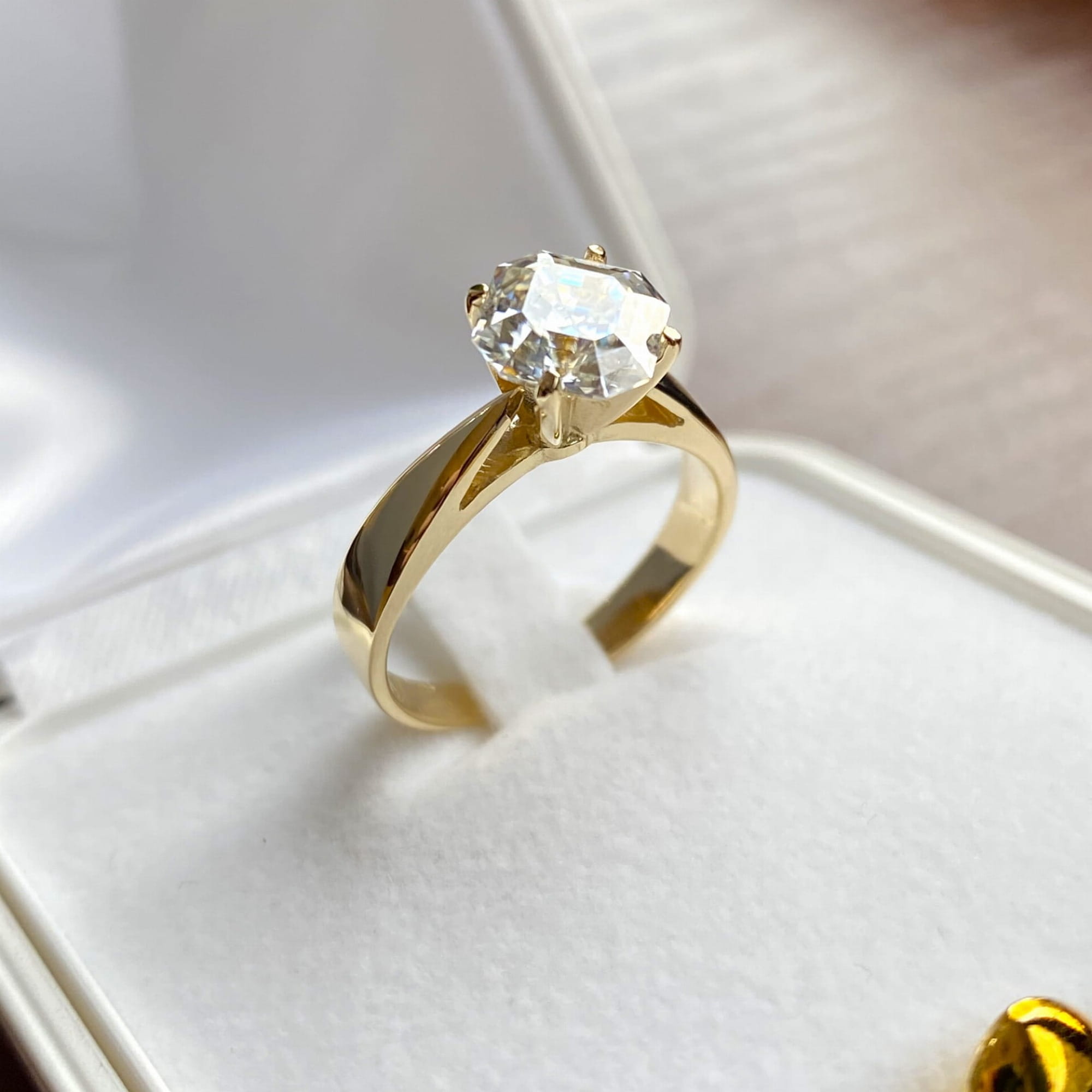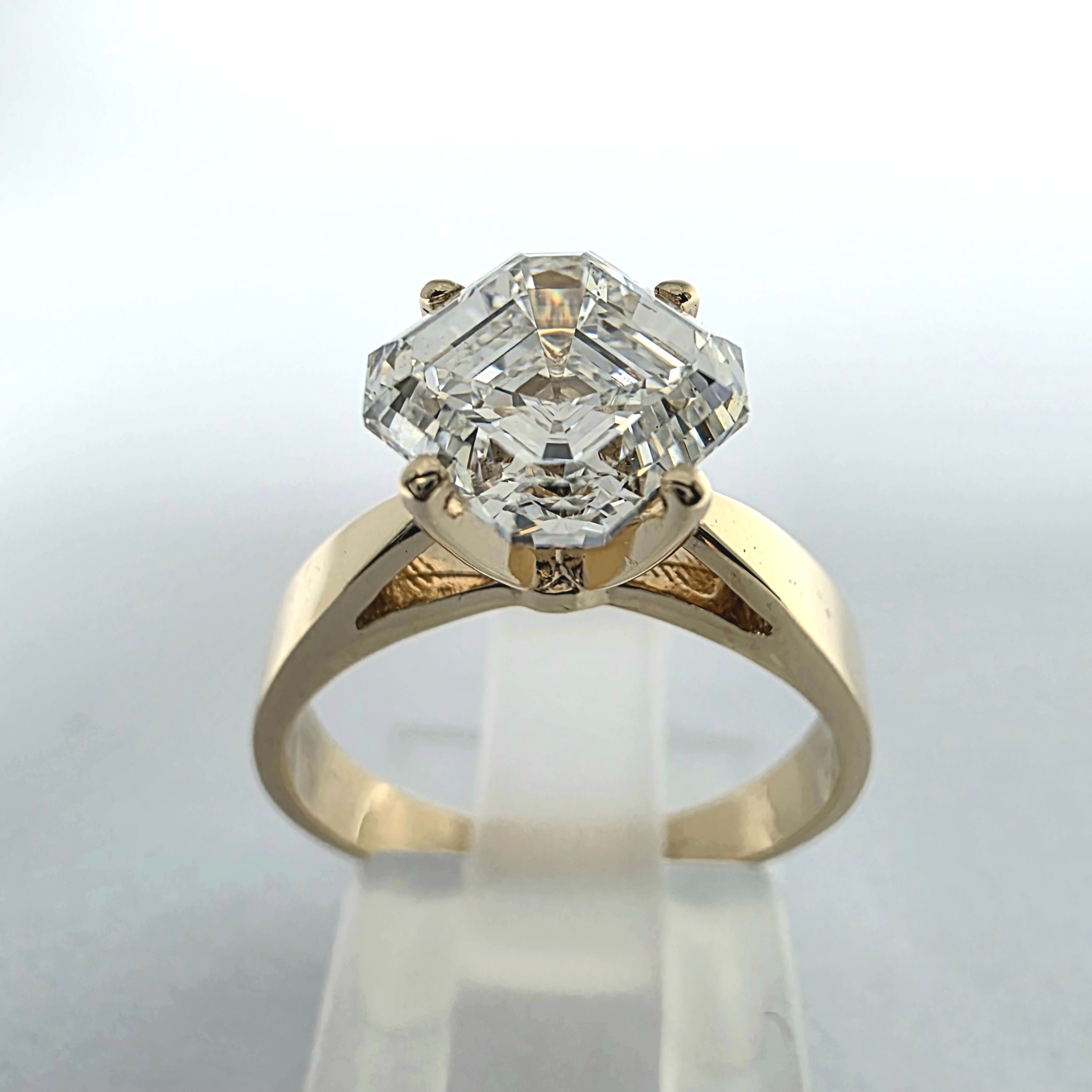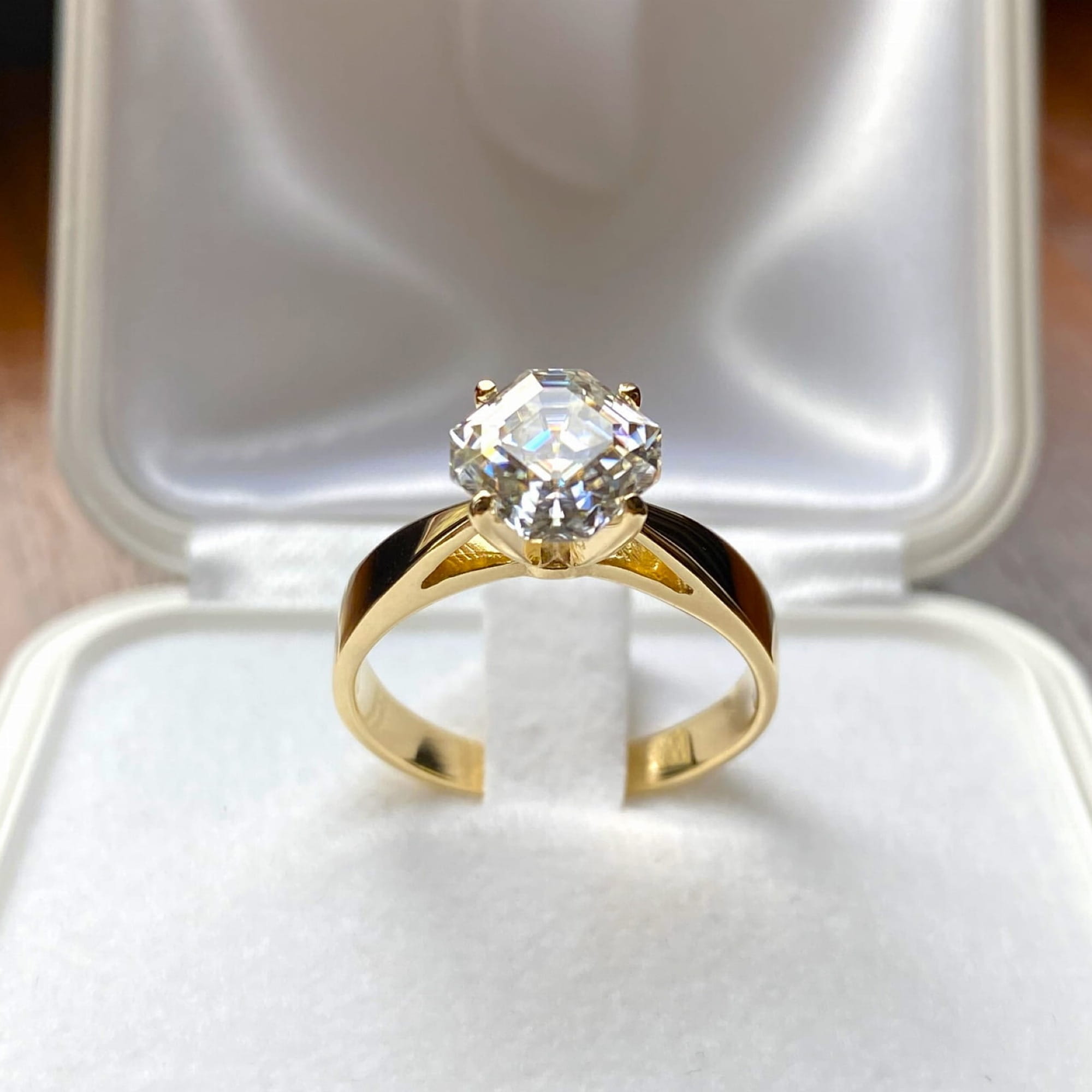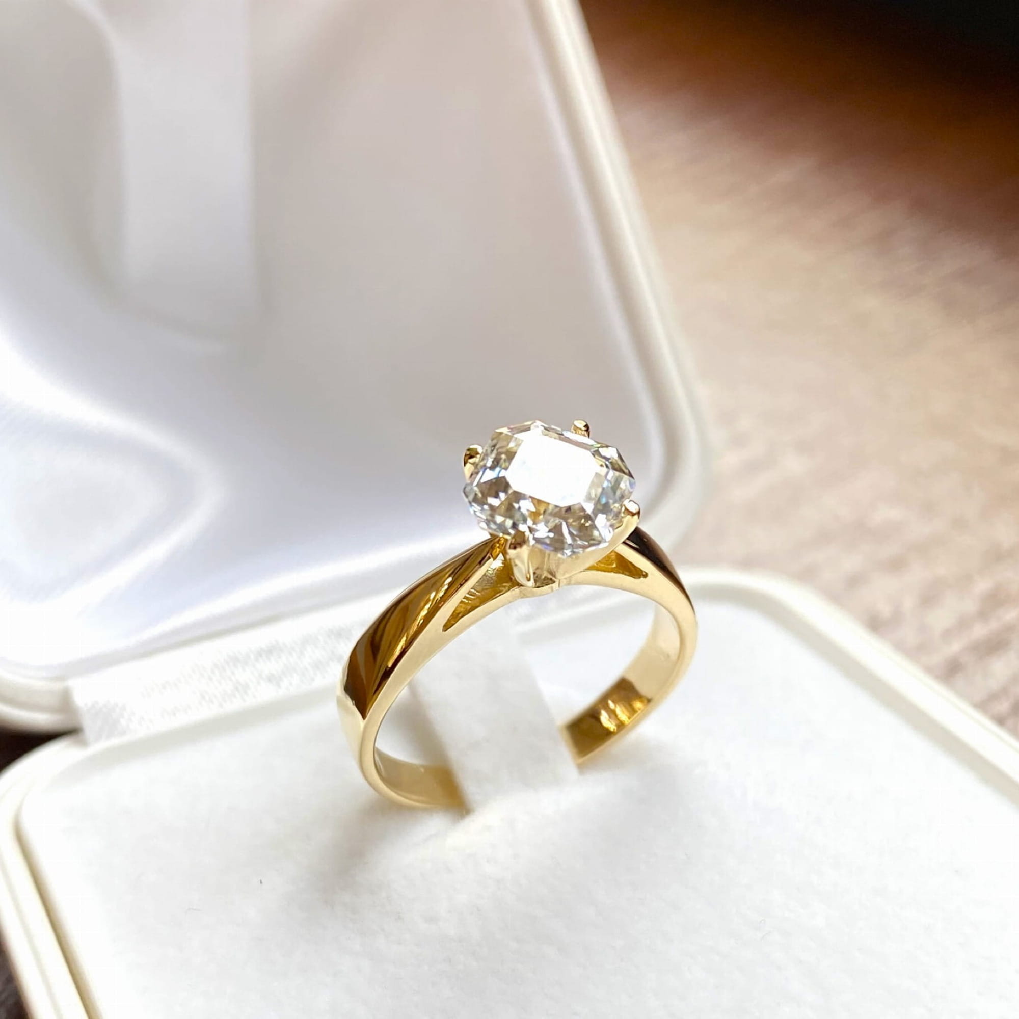 Elegancki pierścionek wykonany z żółtego złota próby 585 (14K). Jego centralnym elementem jest efektowny diament laboratoryjny w szlifie Asscher o masie około 2,00 ct. Ten unikatowy szlif podkreśla głębię kamienia i zapewnia wyjątkowy, luksusowy blask.