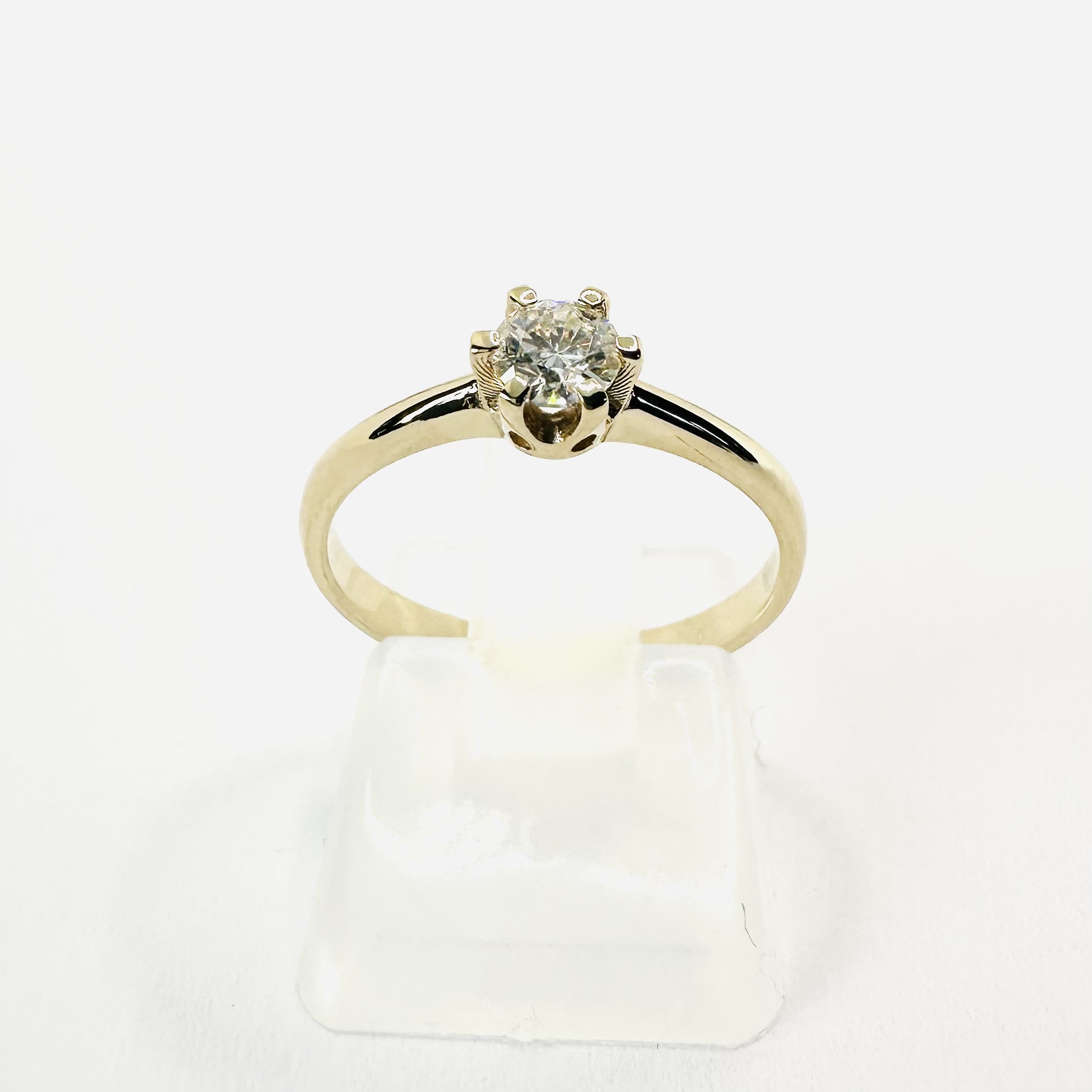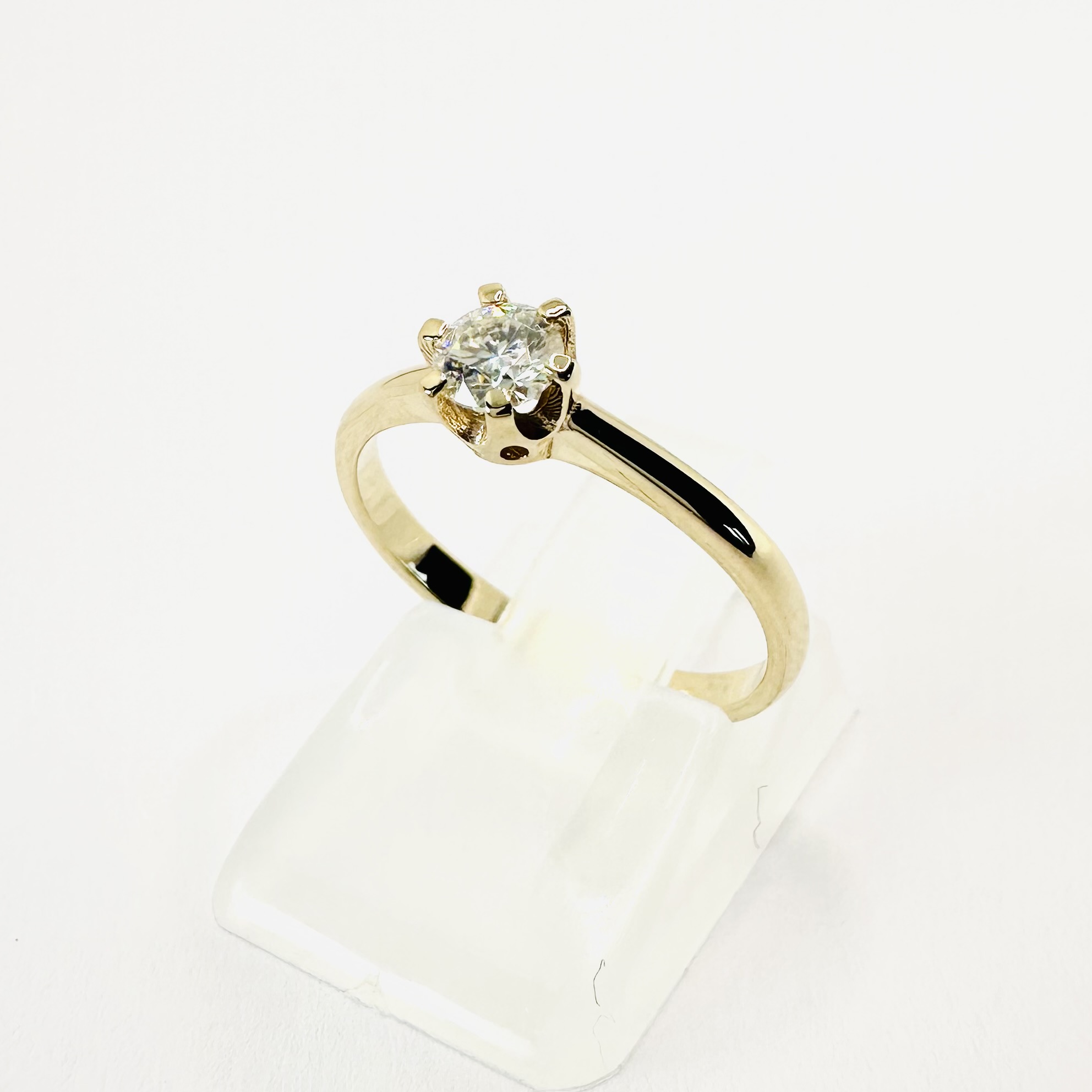 Ponadczasowy pierścionek zaręczynowy wykonany z żółtego złota 585 (14K), zdobiony brylantowym moissanitem VS1/E o średnicy około 4,0 mm i masie ok. 0,25 ct. To klasyka w najczystszym wydaniu — solidna oprawa na 6 grubych łap, idealnie zachowane proporcje i projekt, który od lat pozostaje jednym z najpewniejszych wyborów zaręczynowych.