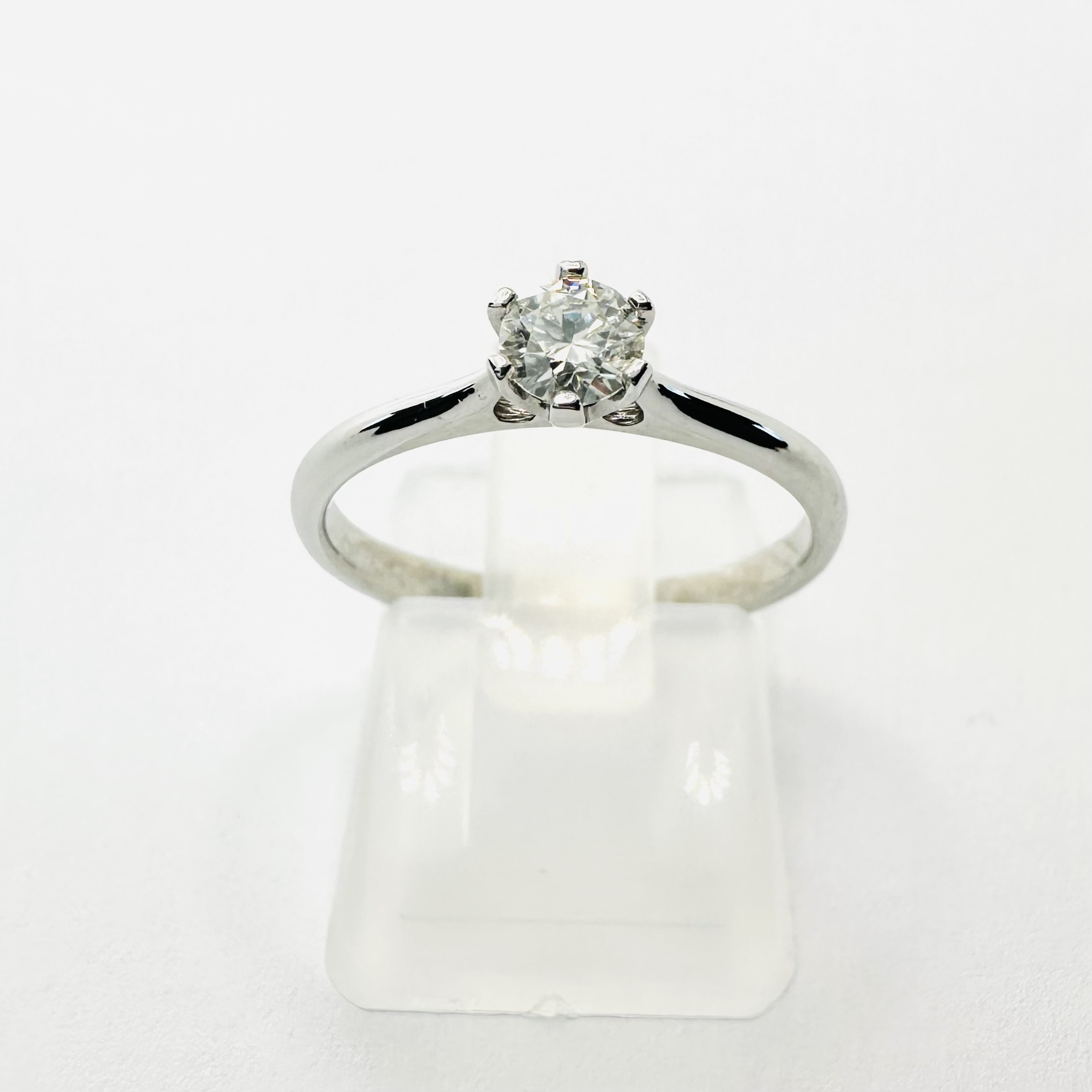 Pierścionek waży około 1,70 g i został wykonany z białego złota próby 585. Centralny kamień to moissanit brylantowy 0,25 ct o średnicy ok. 4,0 mm. Konstrukcja jest klasyczna, wyważona i zaprojektowana tak, aby pierścionek pięknie prezentował się na dłoni.