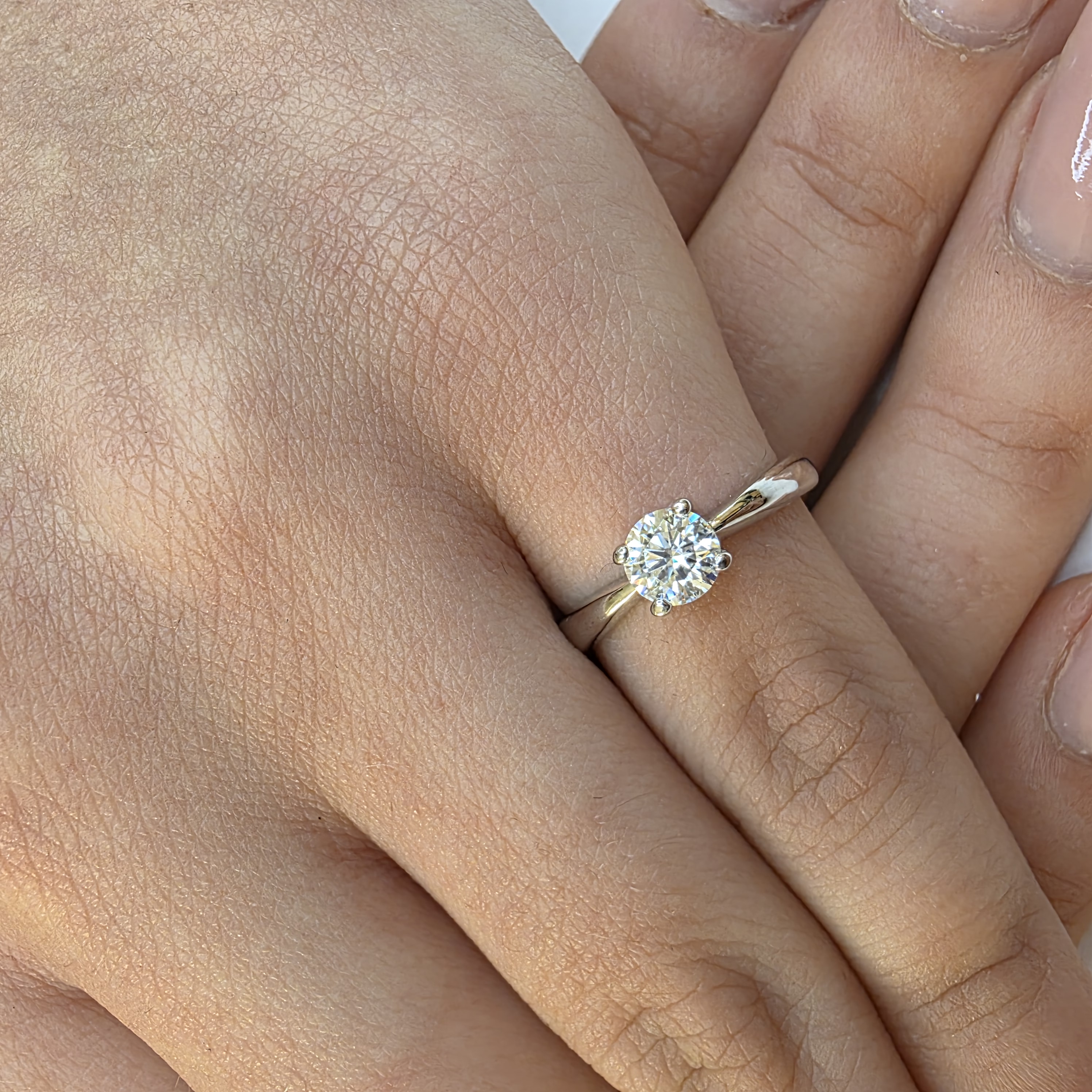 Centralny kamień to moissanit VVS1/D w klasycznym brylantowym szlifie okrągłym, o średnicy około 5,0 mm i masie 0,50 ct. Całość wykonano z białego złota próby 585, a masa pierścionka wynosi około 1,65 g, zależnie od finalnego rozmiaru.