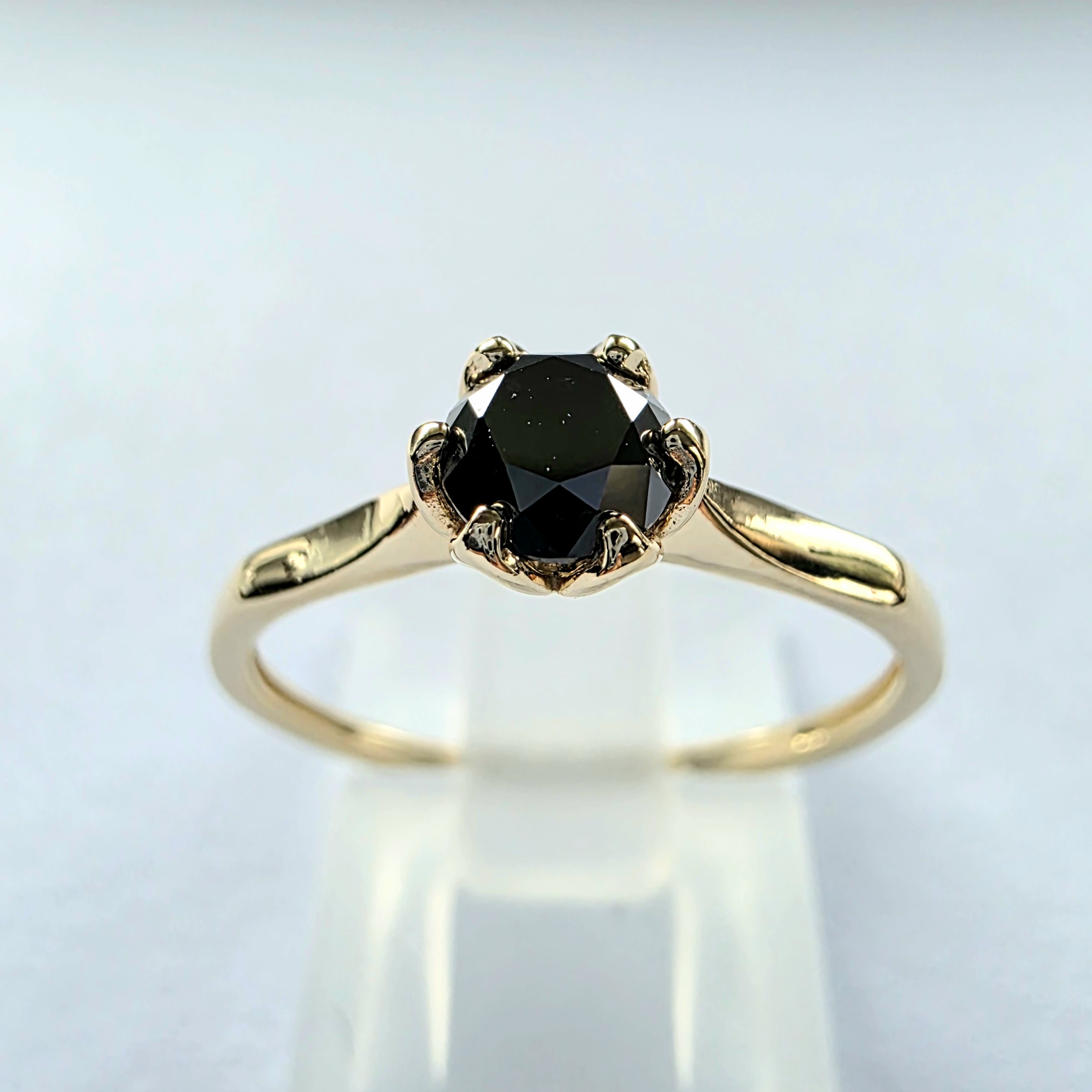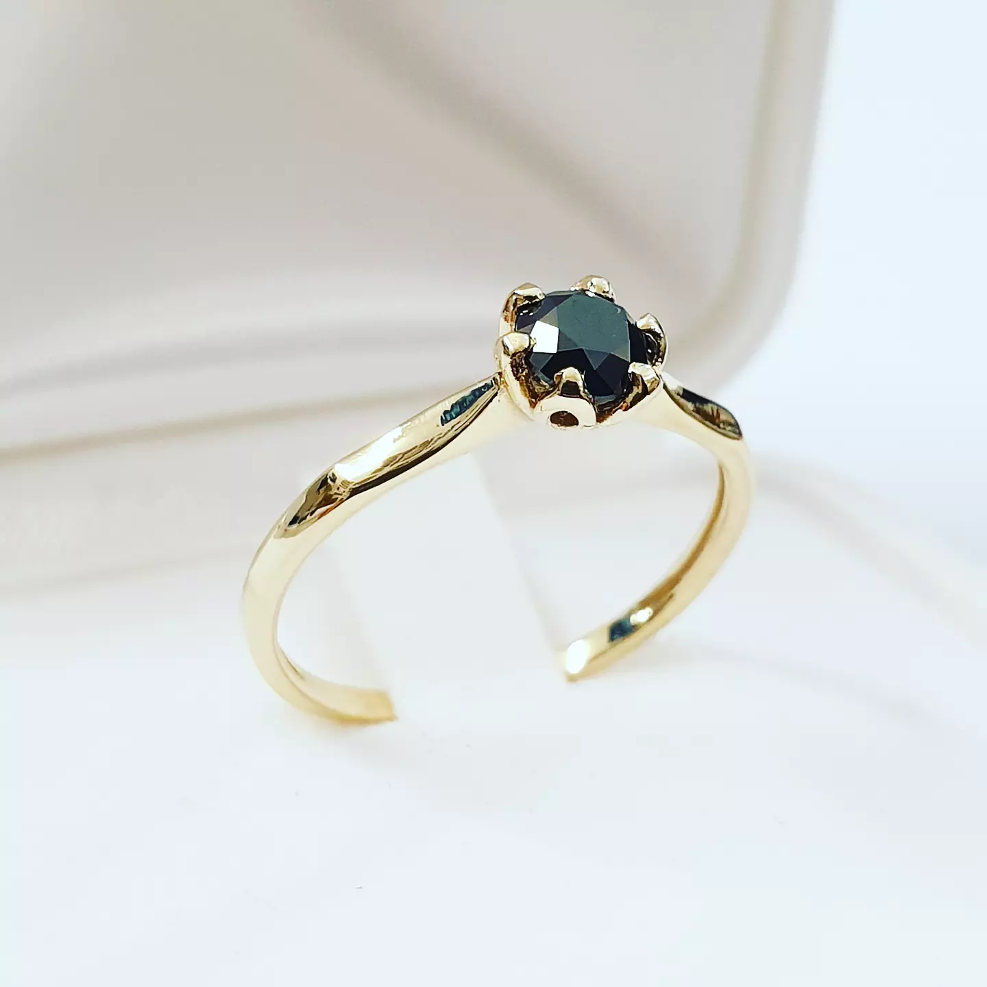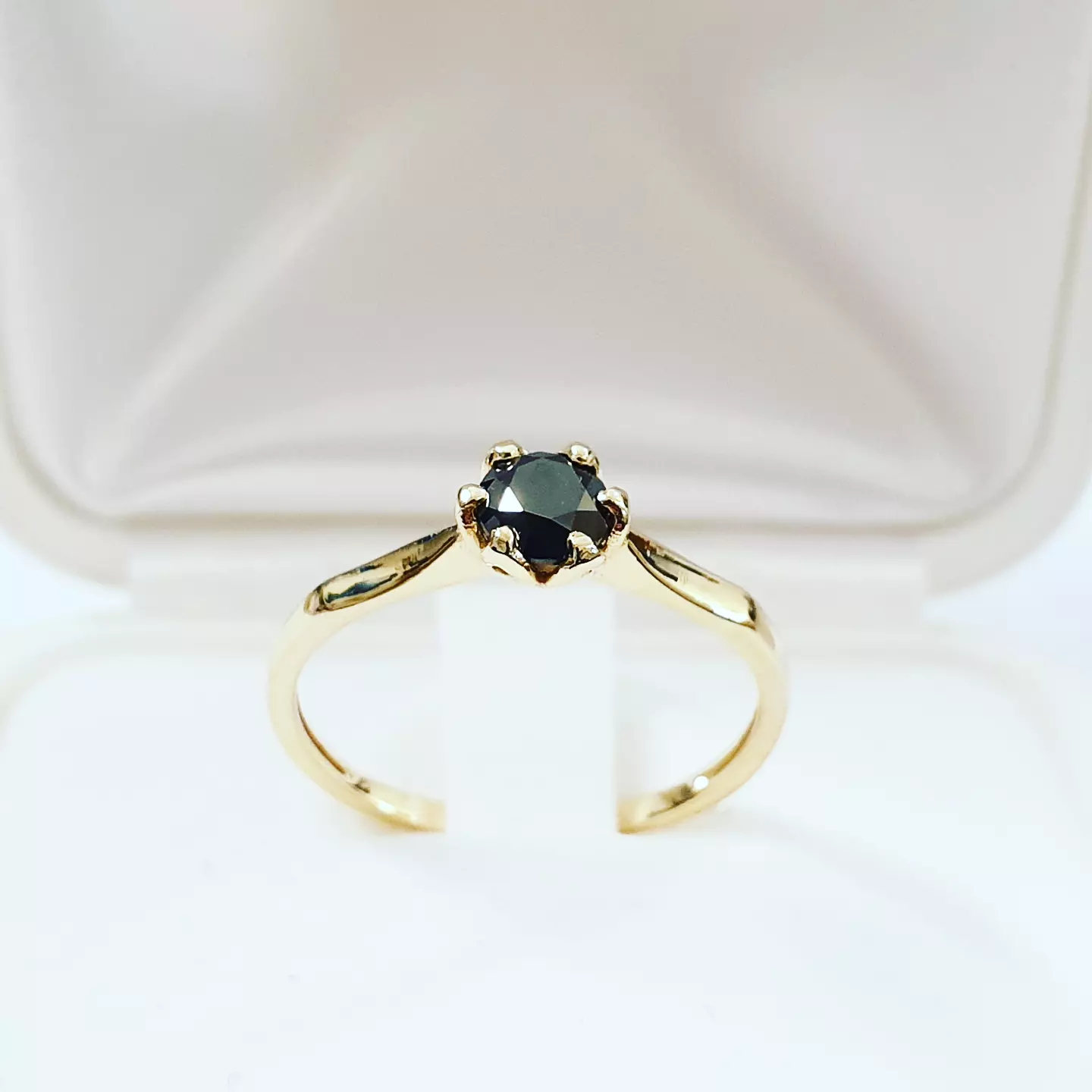 Delikatny i elegancki pierścionek zaręczynowy wykonany z żółtego złota próby 585 (14K). Jego centralnym elementem jest naturalny czarny diament o masie około 0,40 ct, osadzony w klasycznym brylantowym, okrągłym szlifie.