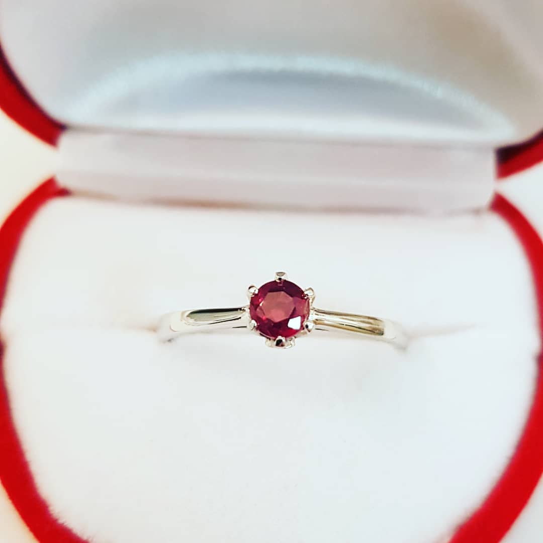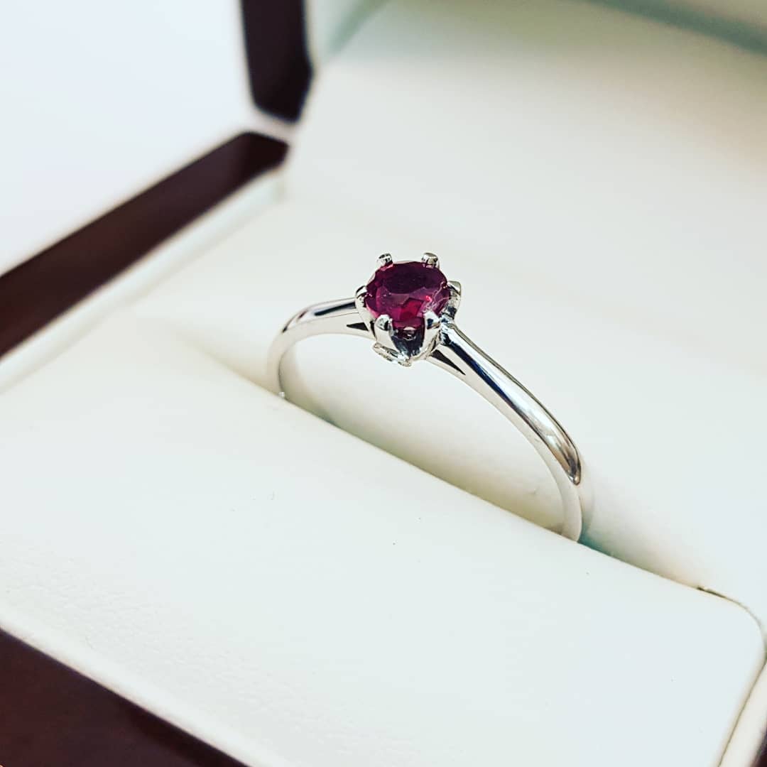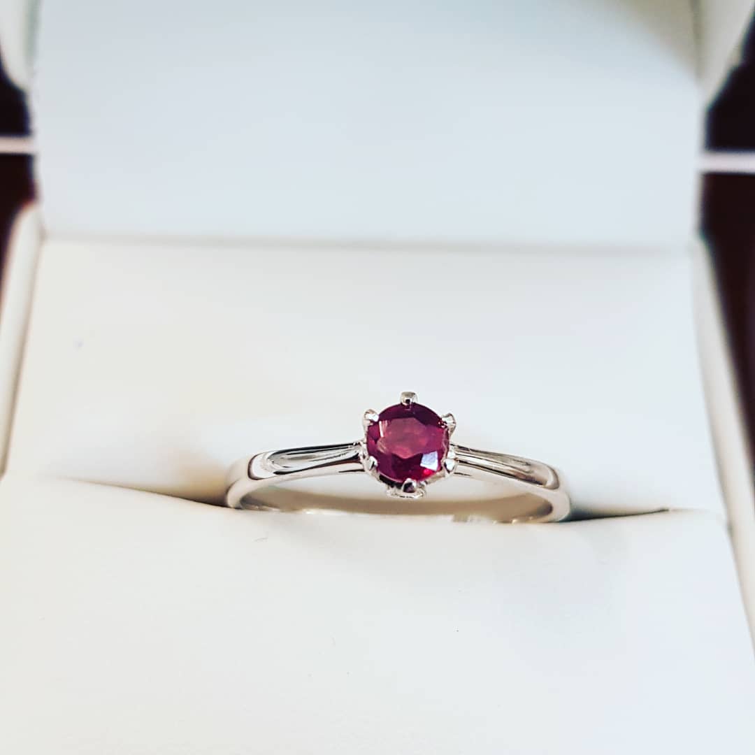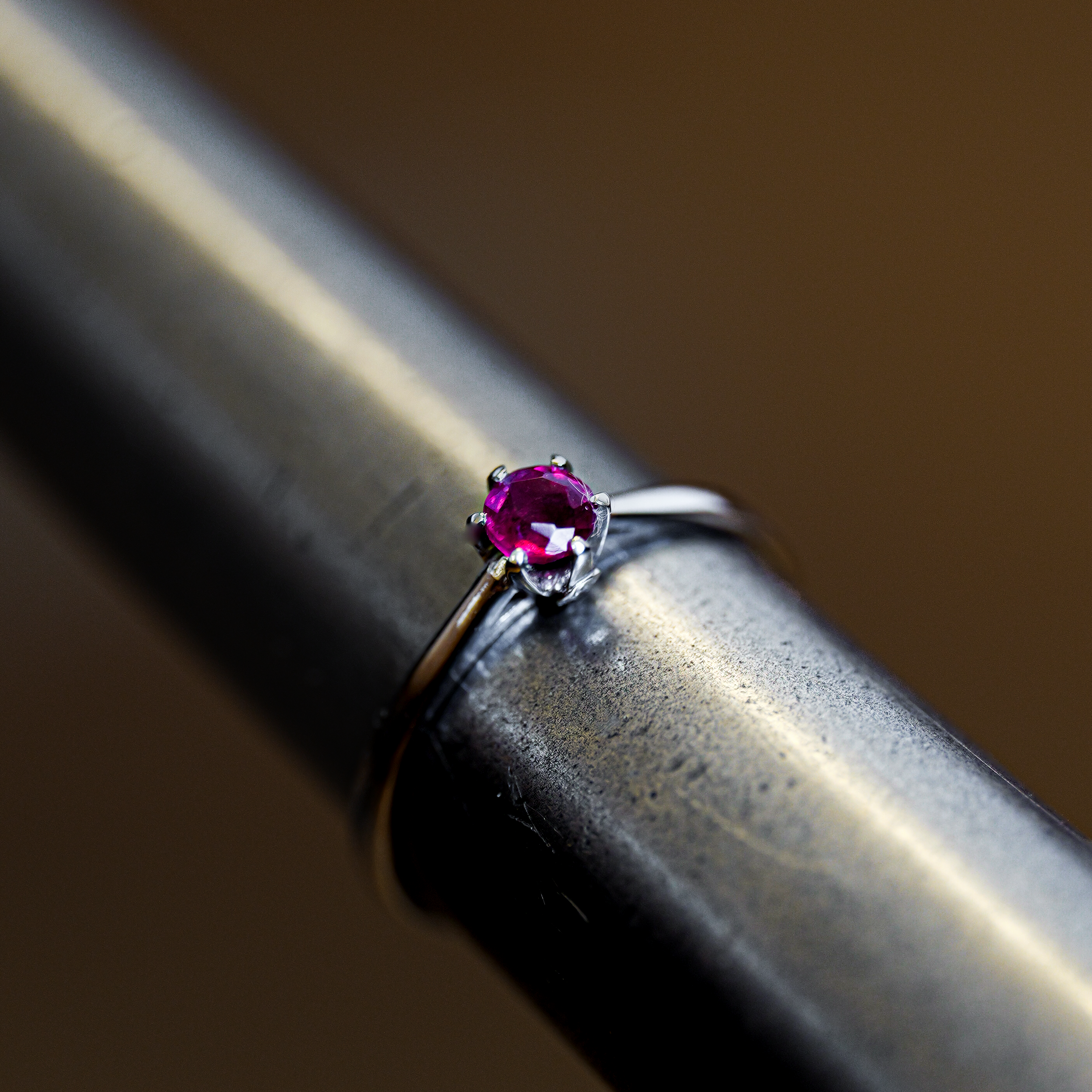 Centralny kamień: rubin o masie ~0,25 ct i średnicy ~4,00 mm, w okrągłym szlifie brylantowym. Towarzyszą mu dwa diamenty o łącznej masie ~0,02 ct (średnica ok. 1,25 mm). Pierścionek wykonano z białego złota 585, a jego masa to ~1,70 g.