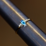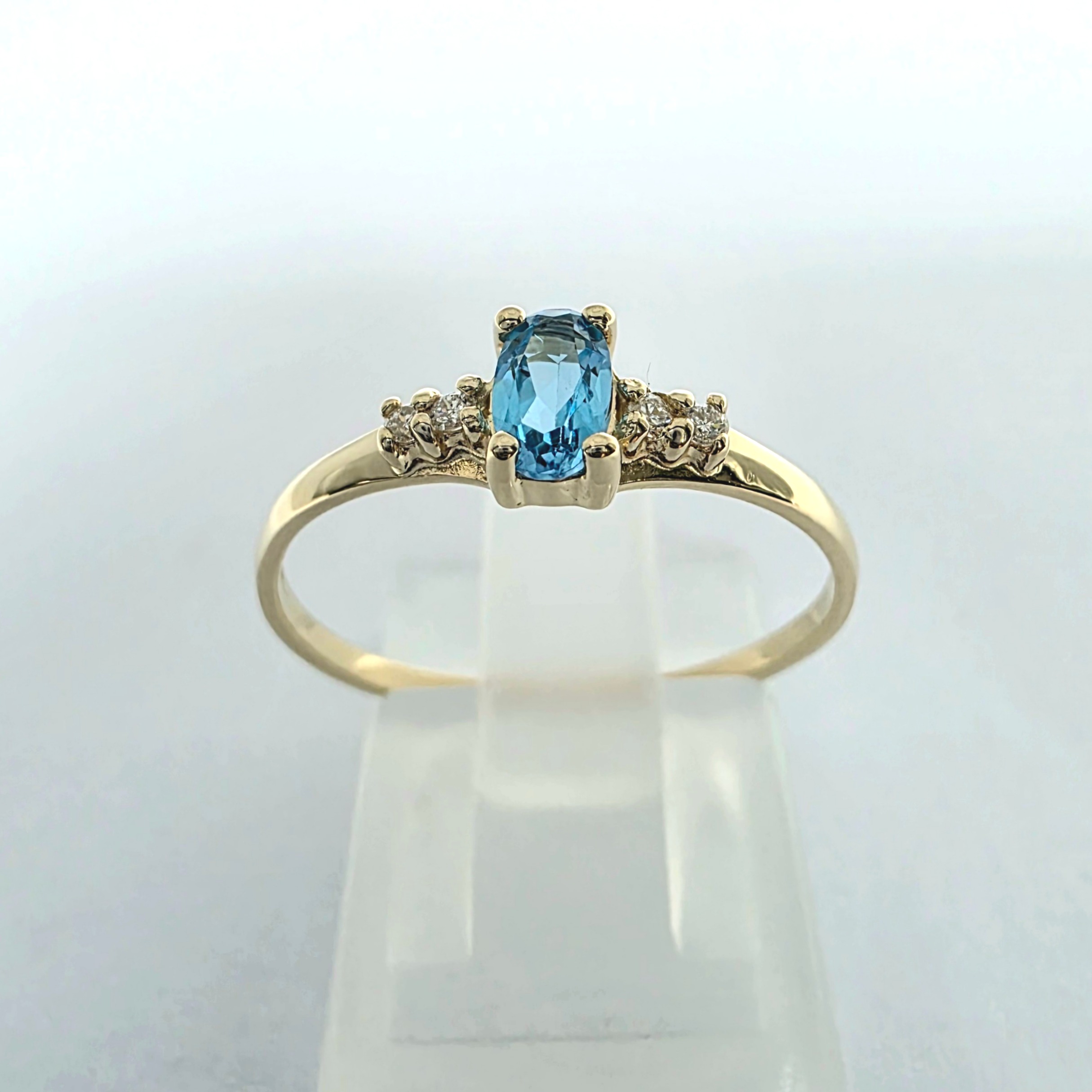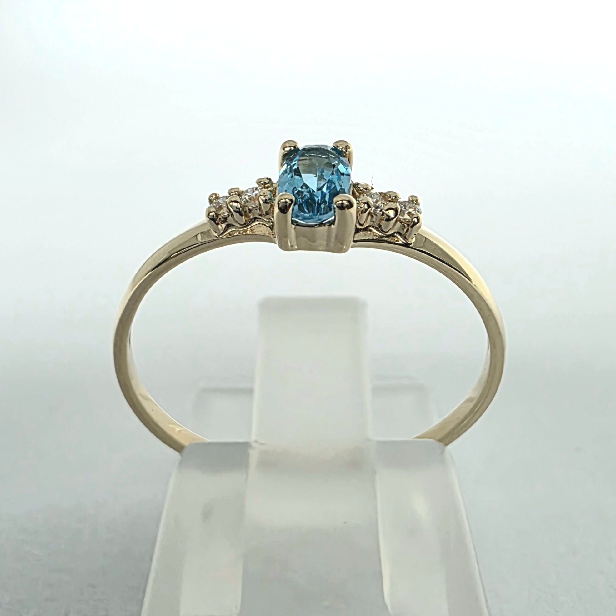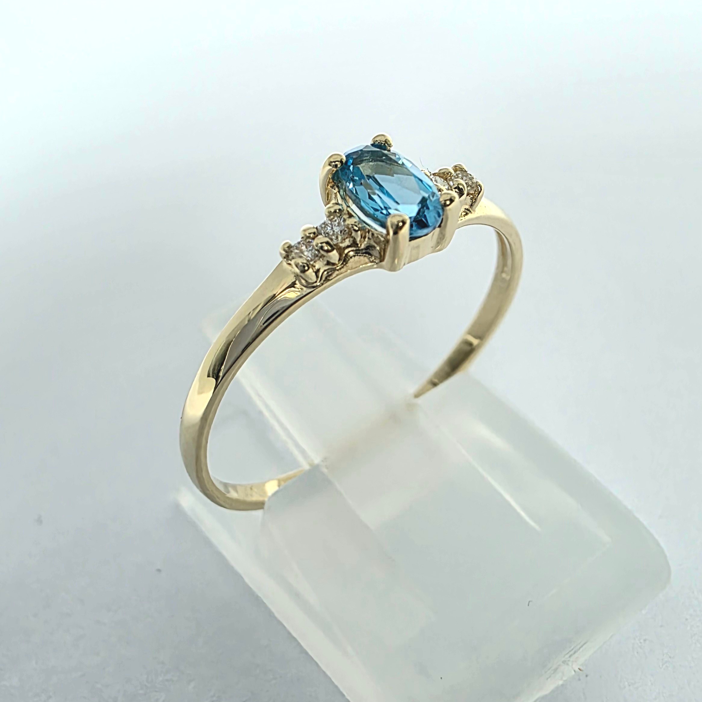 Centralnym elementem pierścionka jest naturalny topaz w owalnym szlifie, o wymiarach około 5,00 × 3,00 mm i masie około 0,30 ct. Po bokach oprawiono brylanty o średnicy około 1,25 mm każdy, o łącznej masie 0,04 ct. Konstrukcja pierścionka wykonana jest z żółtego złota próby 585, a jego masa całkowita wynosi około 0,90–1,30 g.