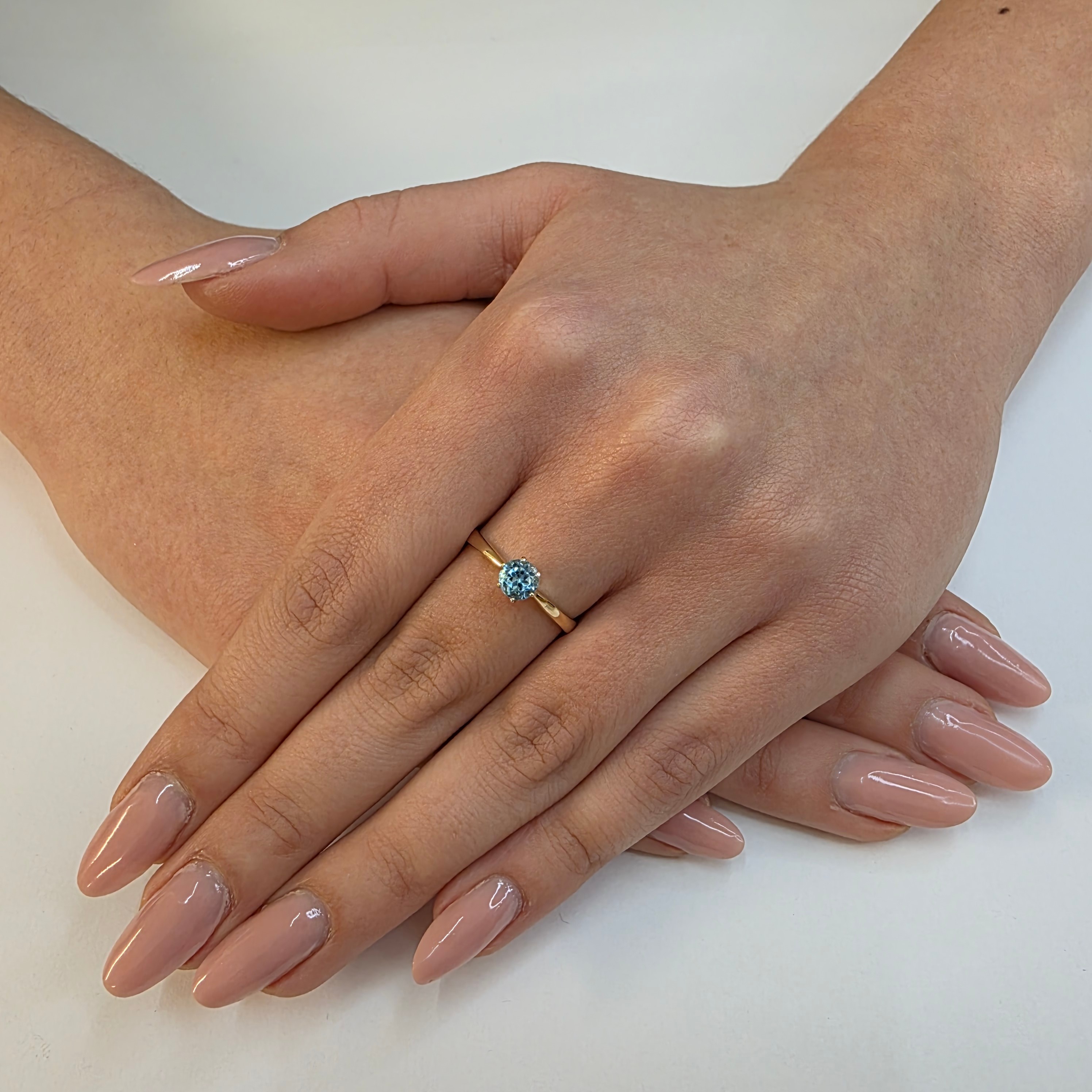 Subtelny pierścionek zaręczynowy wykonany ze złota próby 585, ozdobiony naturalnym topazem. Model powstaje w pracowni ABgold | Baczyński, z dbałością o jakość oprawy, proporcje i elegancką formę.