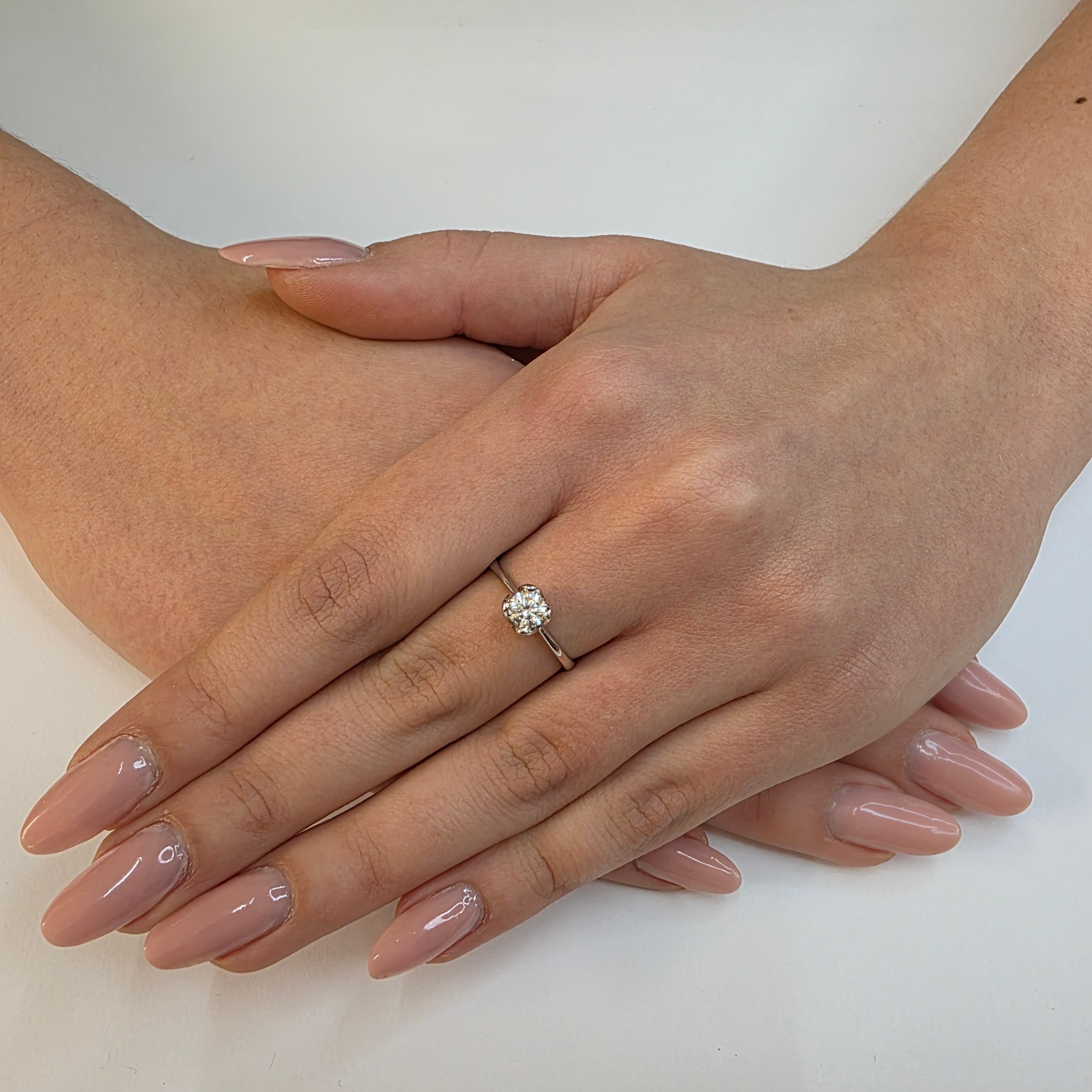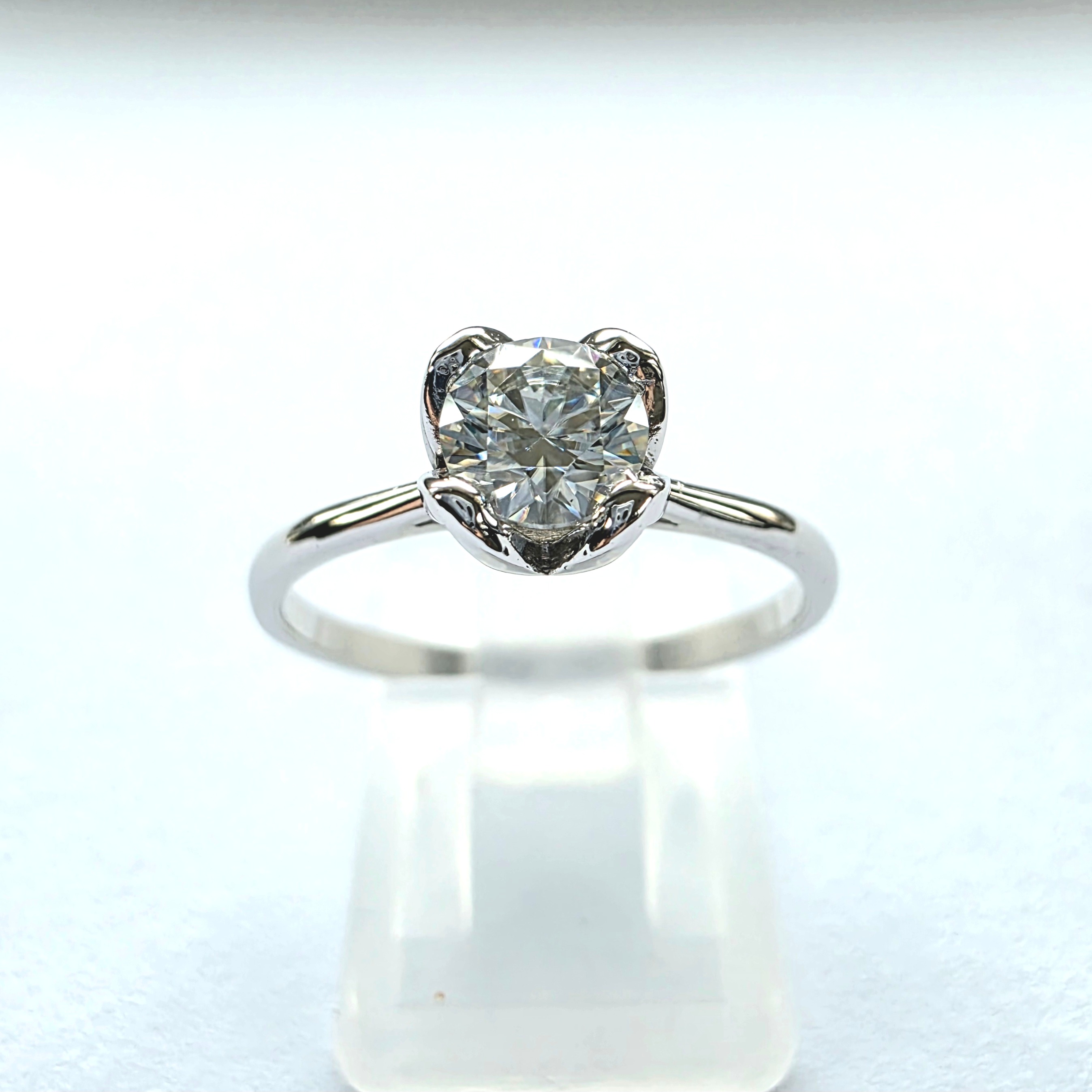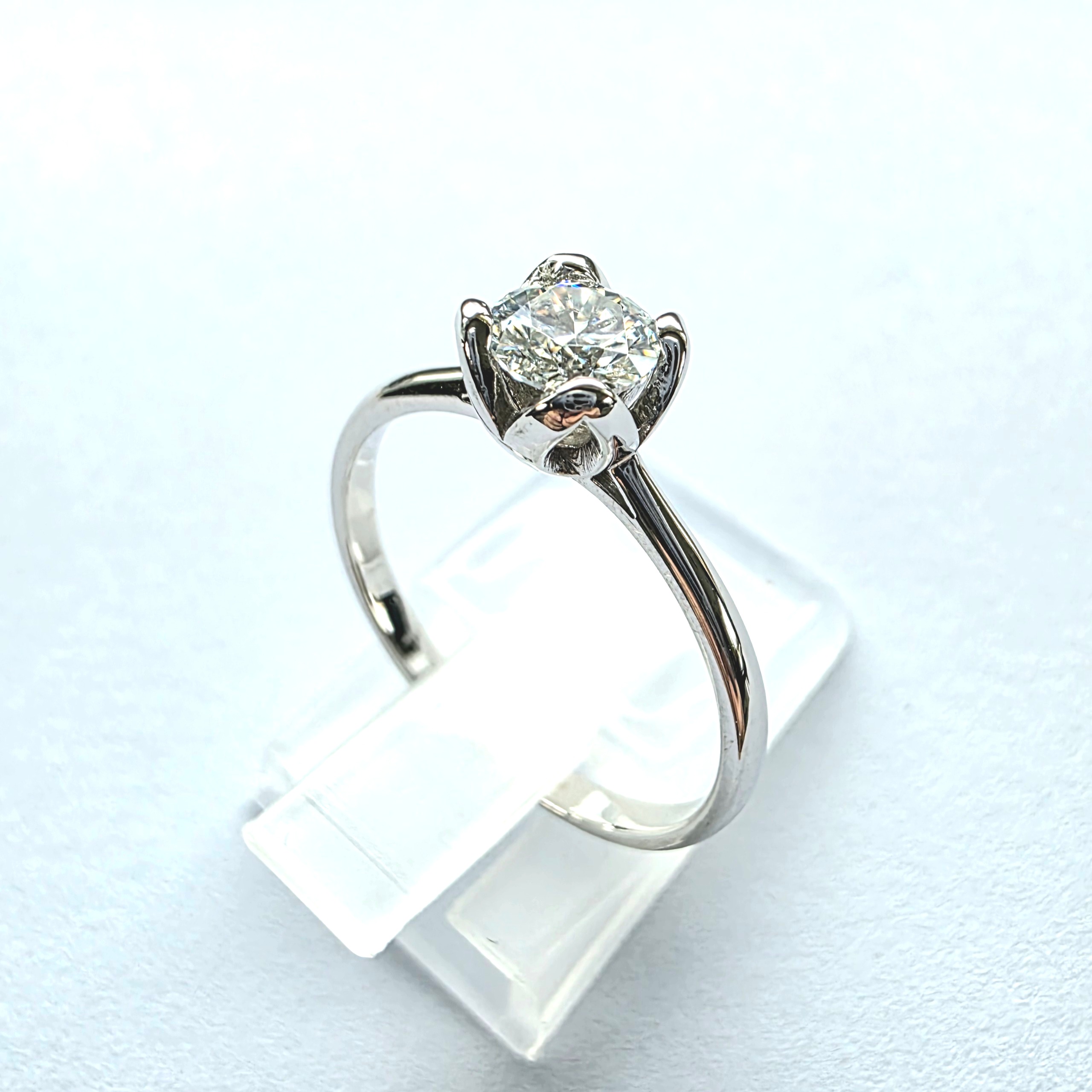 Białe złoto 585 nadaje pierścionkowi chłodny, nowoczesny i luksusowy charakter. To doskonały wybór dla osób preferujących eleganckie, minimalistyczne tonacje, szczególnie w połączeniu z diamentem o jasnych parametrach VS/G lub Si/H.