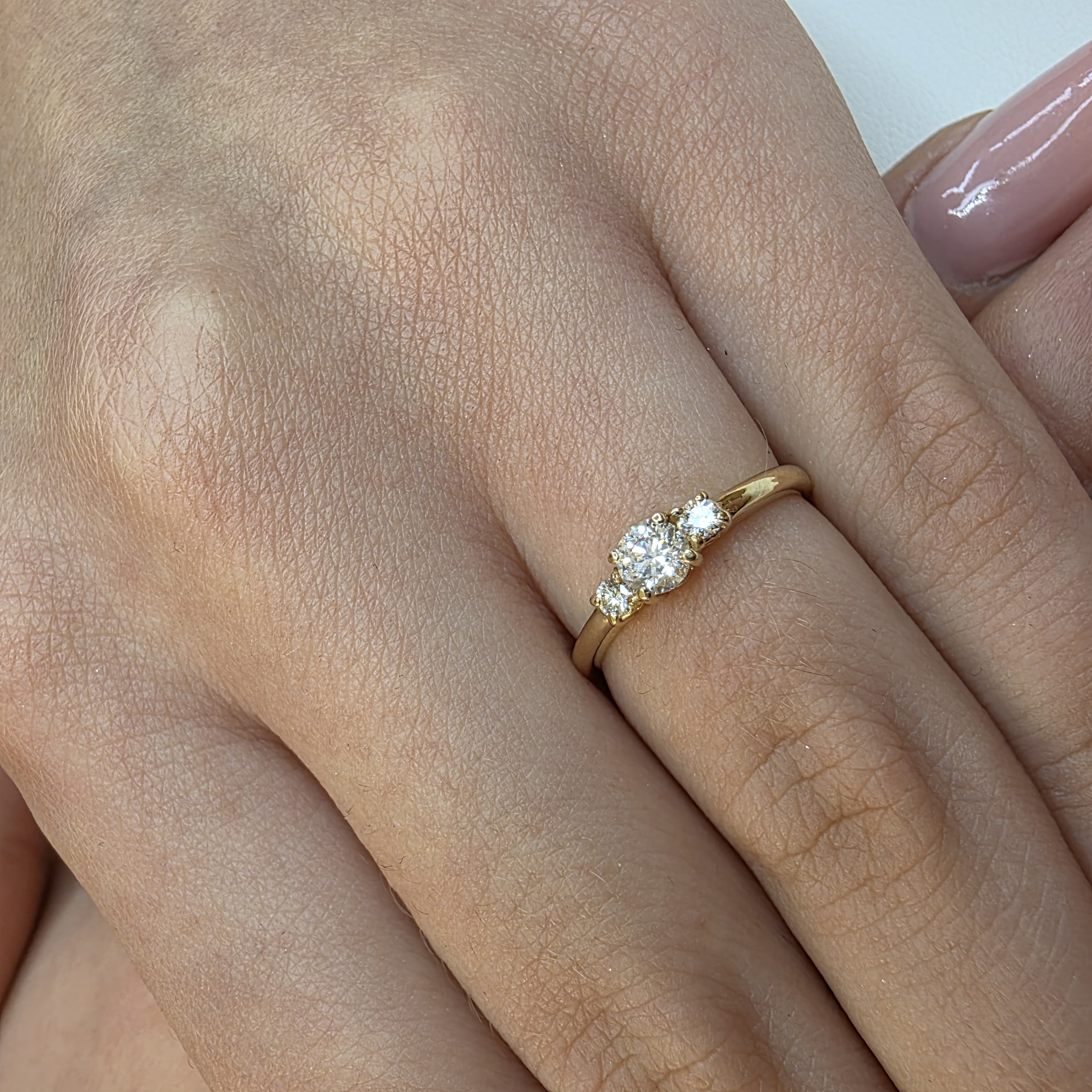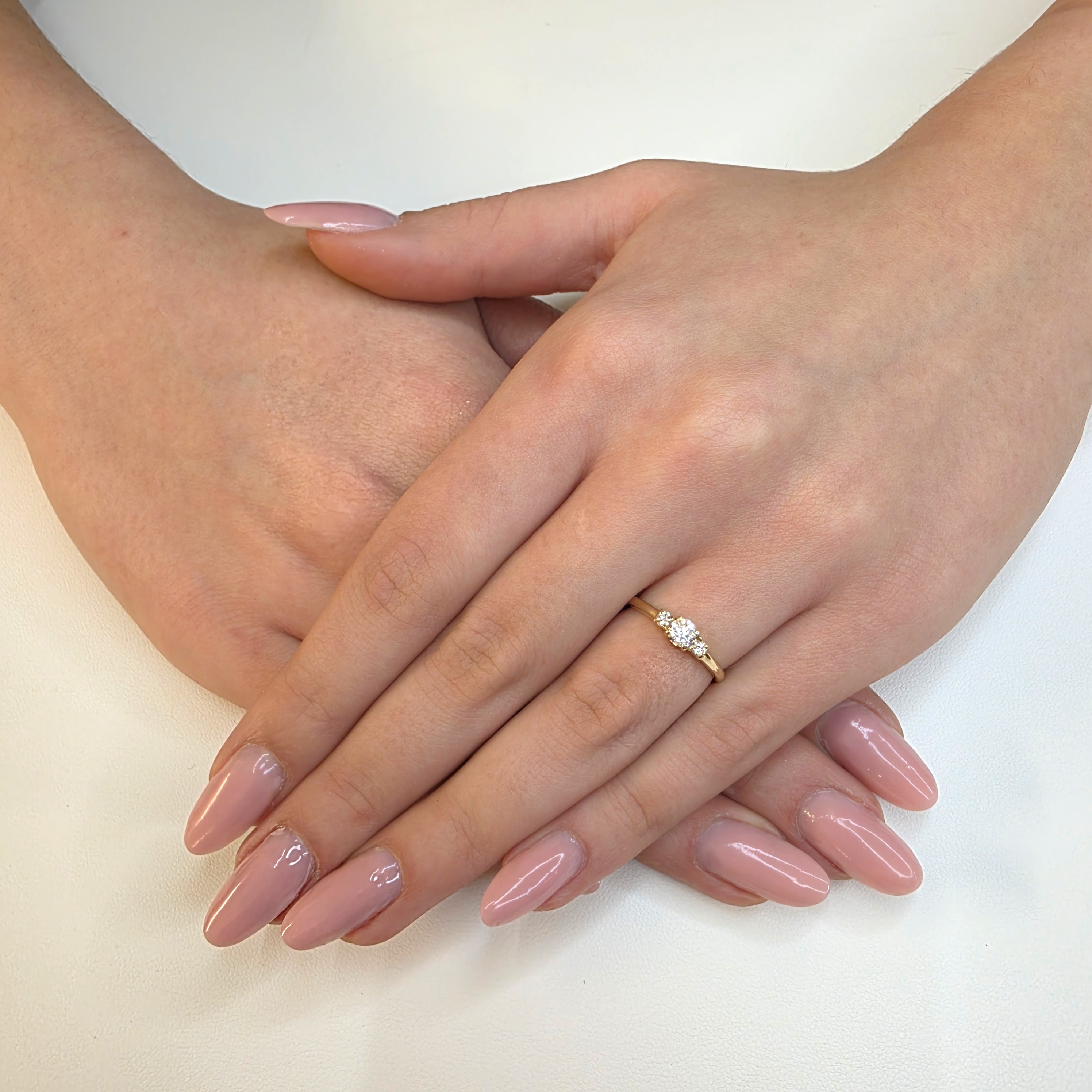 Kompozycja kilku brylantów nadaje pierścionkowi delikatnego, ale wyraźnego charakteru. Okrągły szlif zapewnia piękną grę światła, a zróżnicowane wielkości kamieni tworzą harmonijną i elegancką całość.