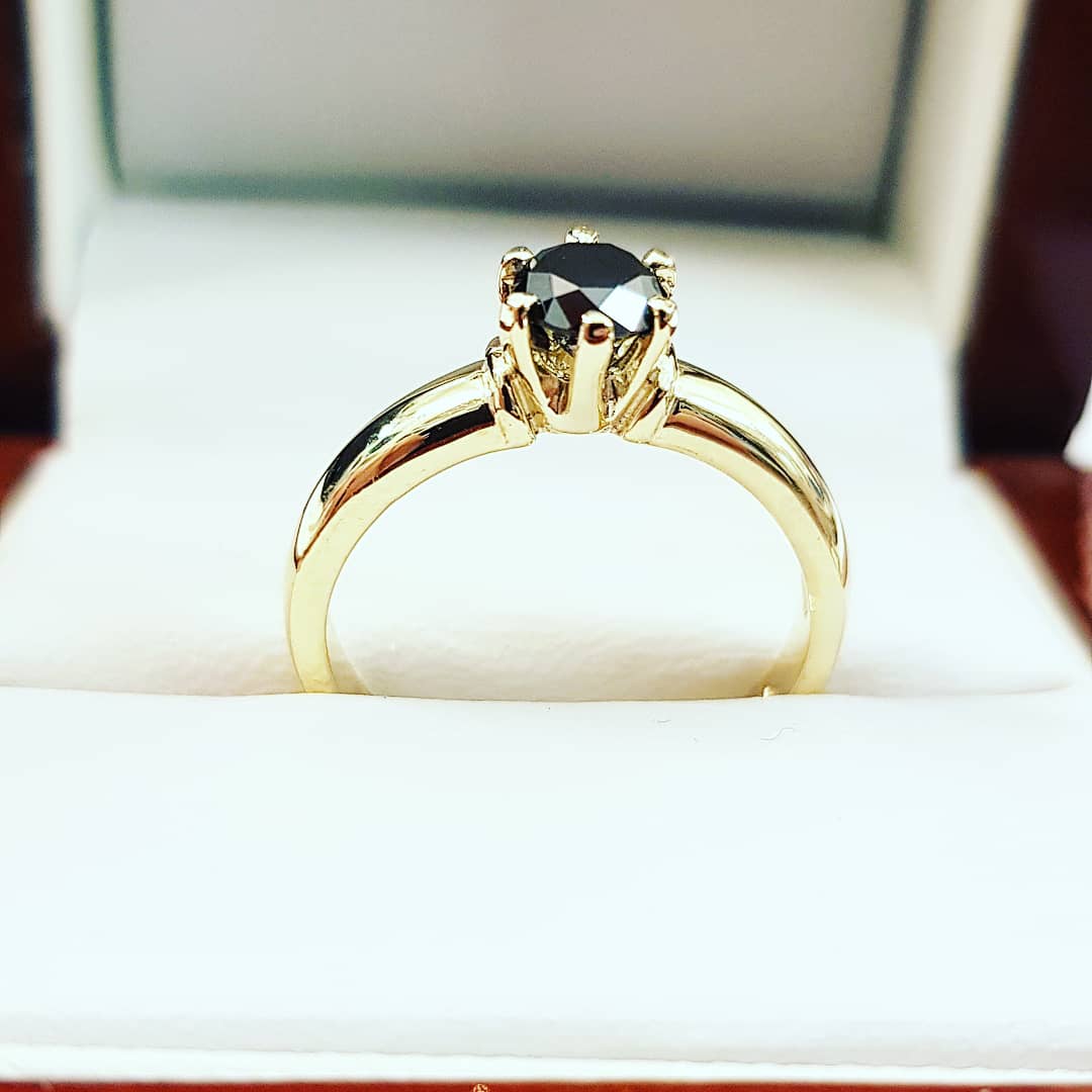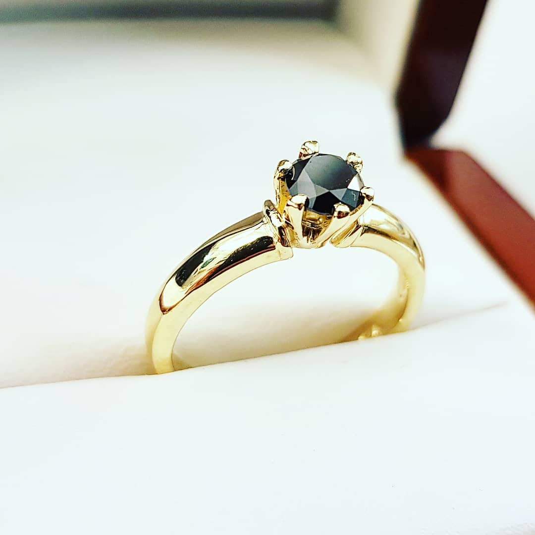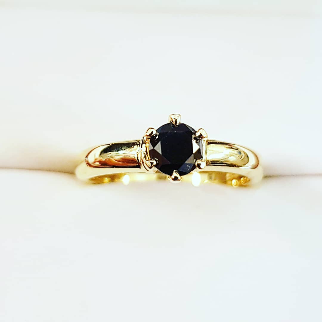 Elegancki pierścionek zaręczynowy wykonany z żółtego złota próby 585 (14K). Jego centralnym elementem jest naturalny czarny diament o masie około 0,50 ct, osadzony w klasycznym brylantowym, okrągłym szlifie.