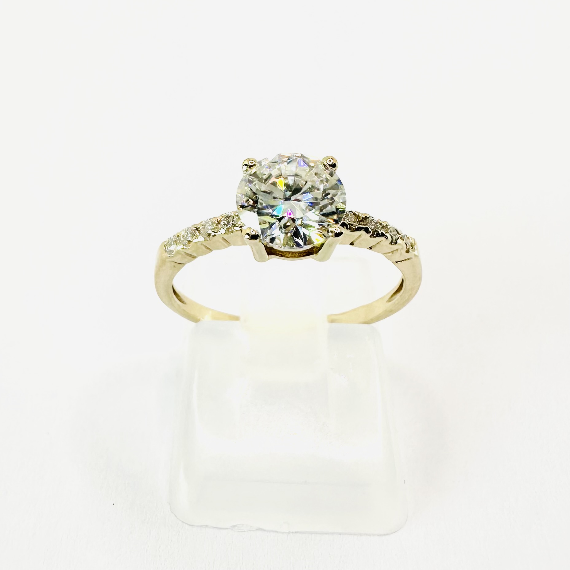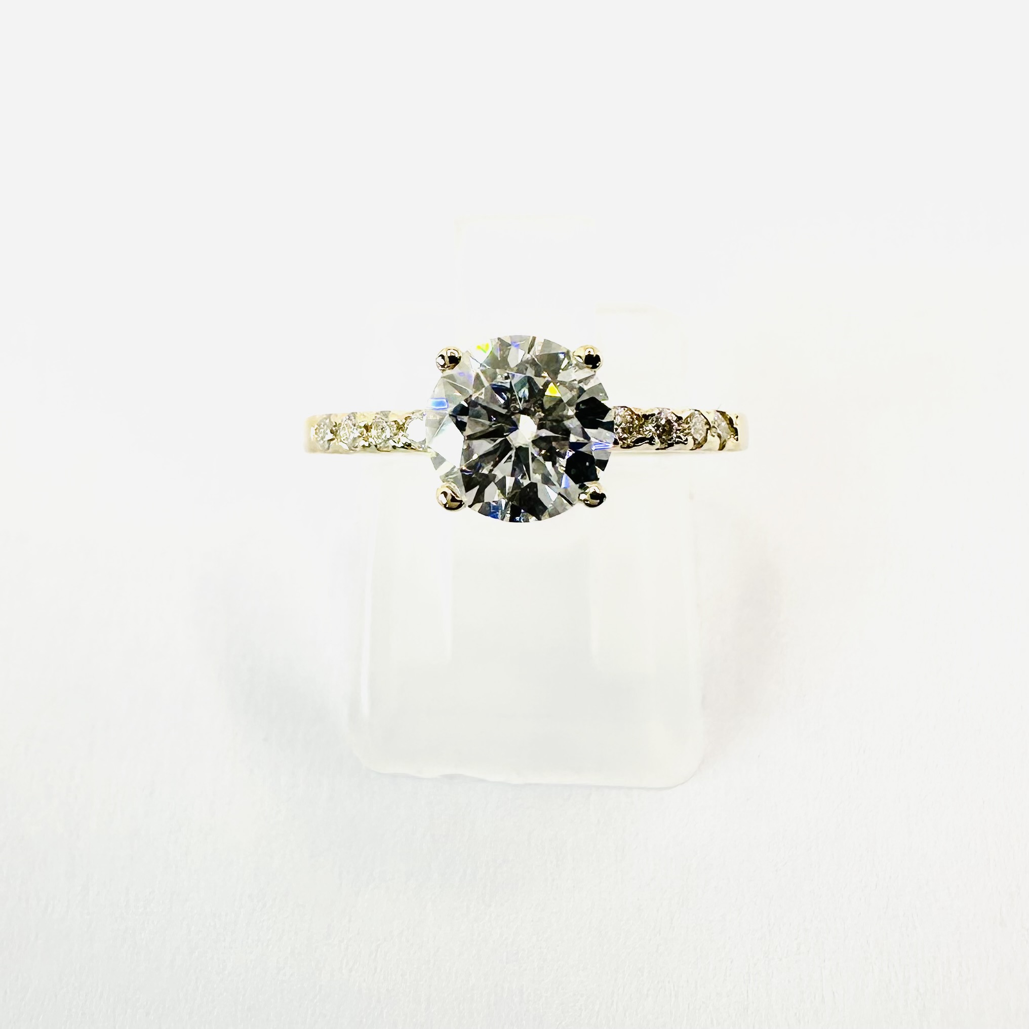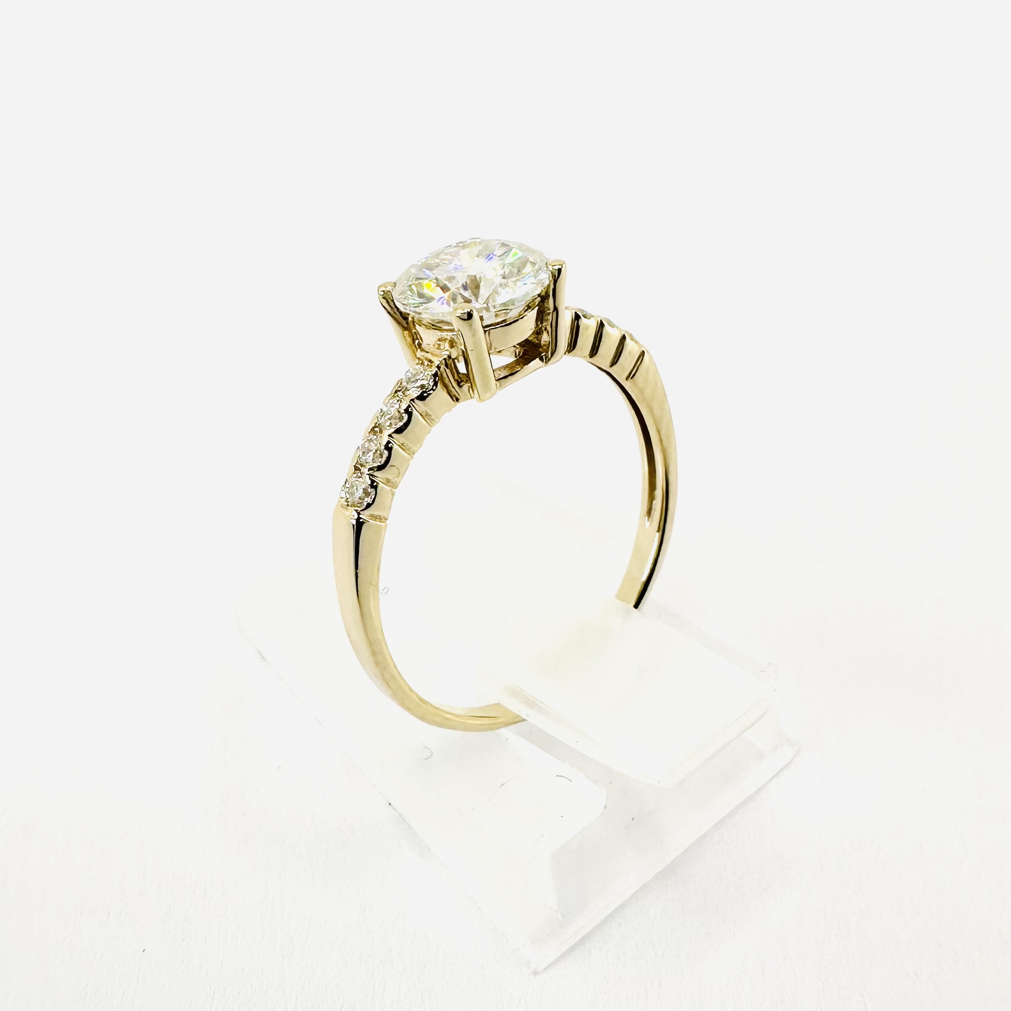 Elegancki pierścionek zaręczynowy wykonany z żółtego złota próby 585 (14K). Jego centralnym elementem jest diament w brylantowym szlifie o masie około 0,75 ct, otoczony mniejszymi diamentami, które dodają całości blasku i lekkości.