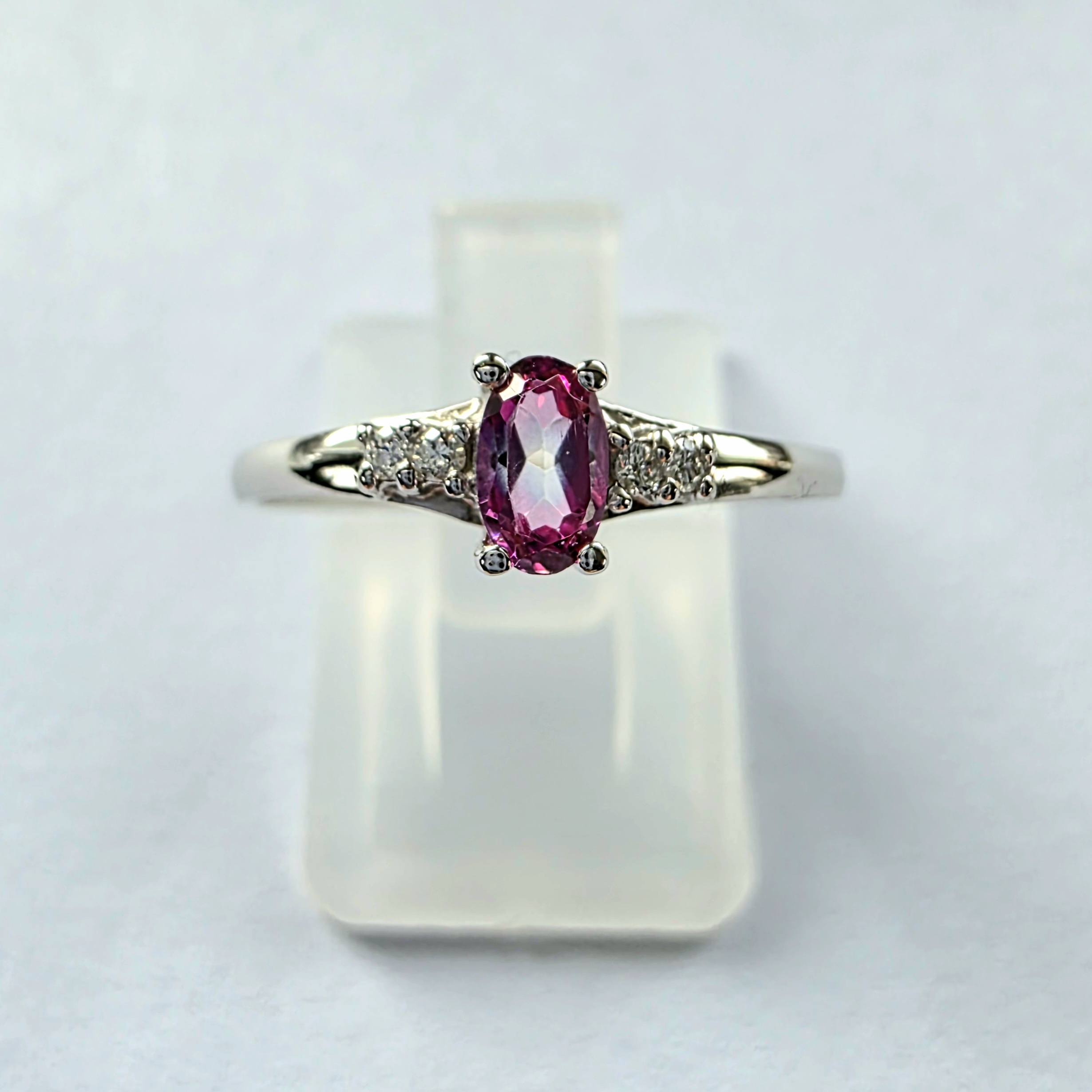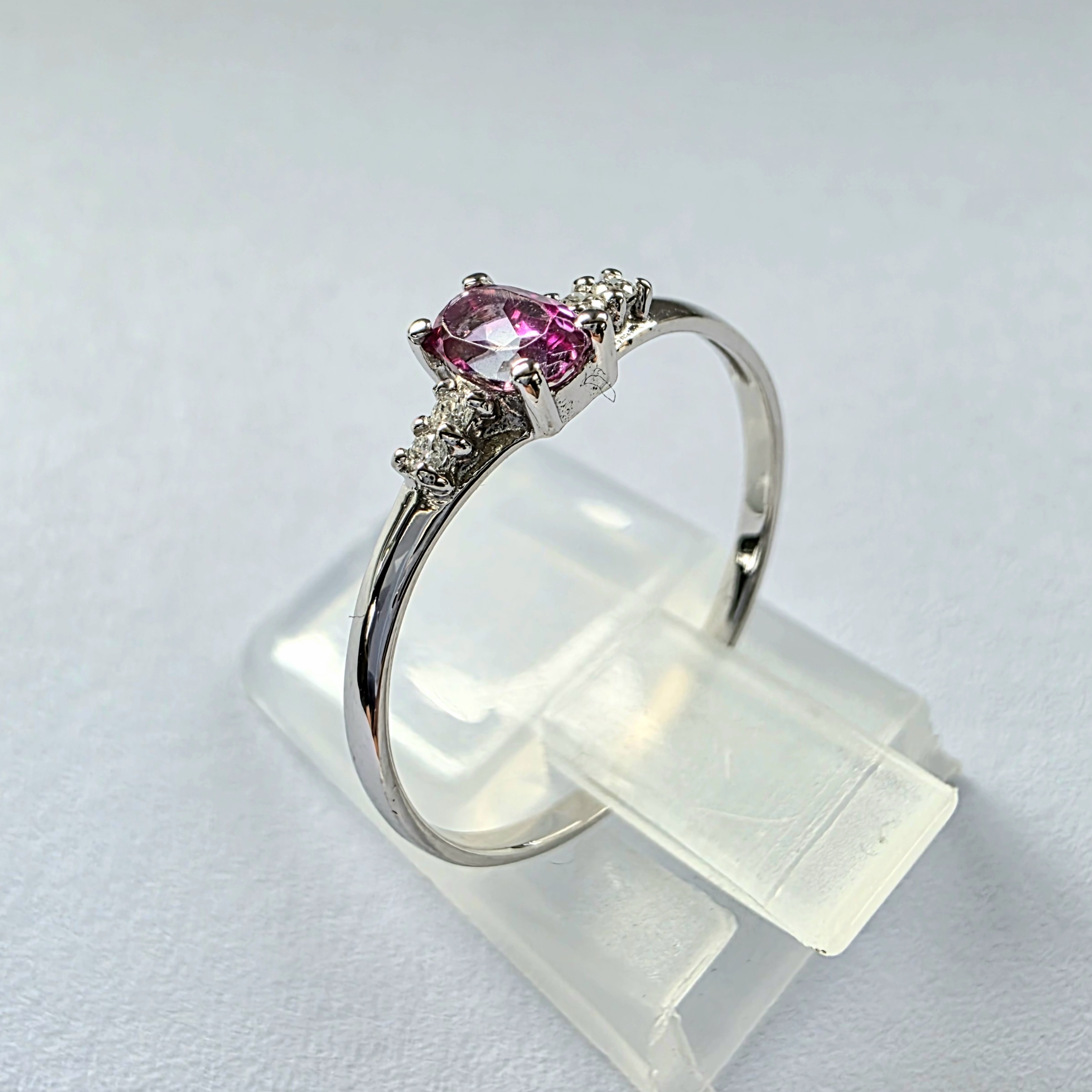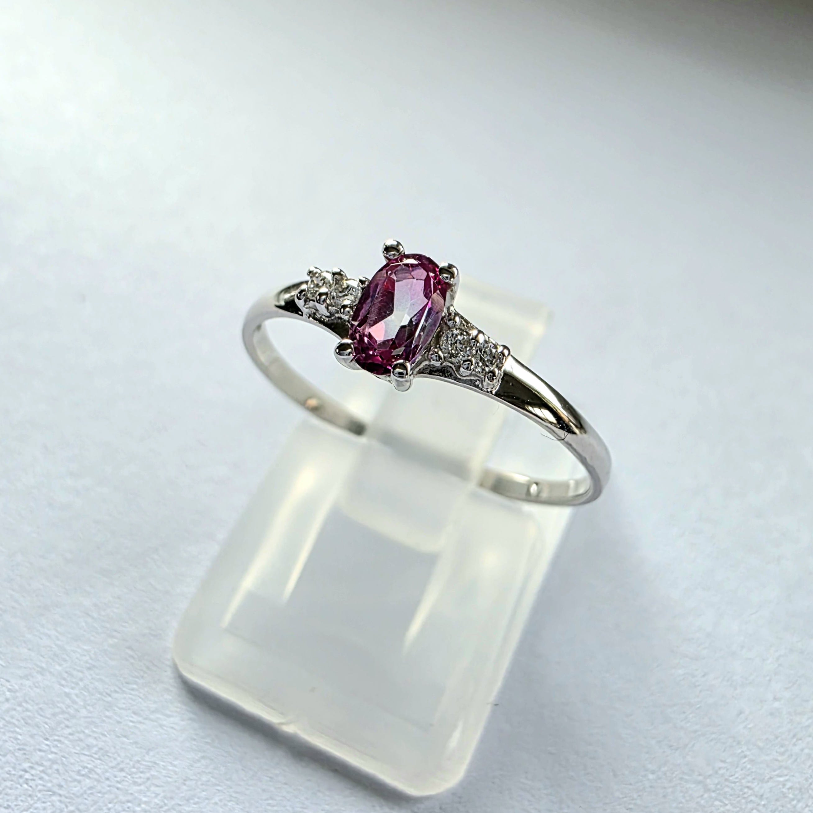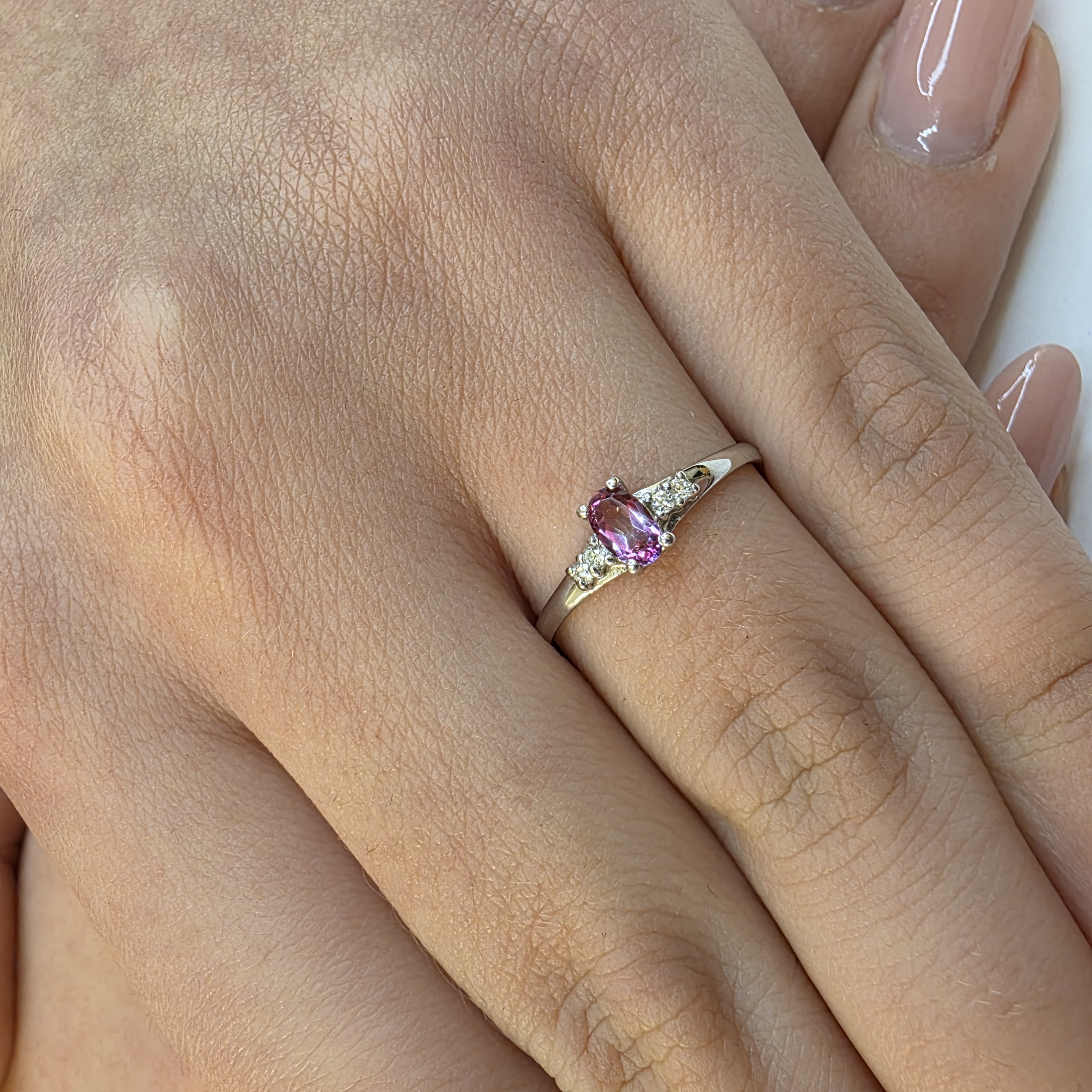 W centrum osadzono naturalny różowy topaz w wymiarze około 5,00 × 3,00 mm i masie około 0,30 ct. Po bokach znajdują się cztery brylanty o średnicy około 1,25 mm każdy, o łącznej masie 0,04 ct. Całość wykonano z złota próby 585, co zapewnia elegancki kolor, trwałość i ponadczasowy charakter biżuterii.
