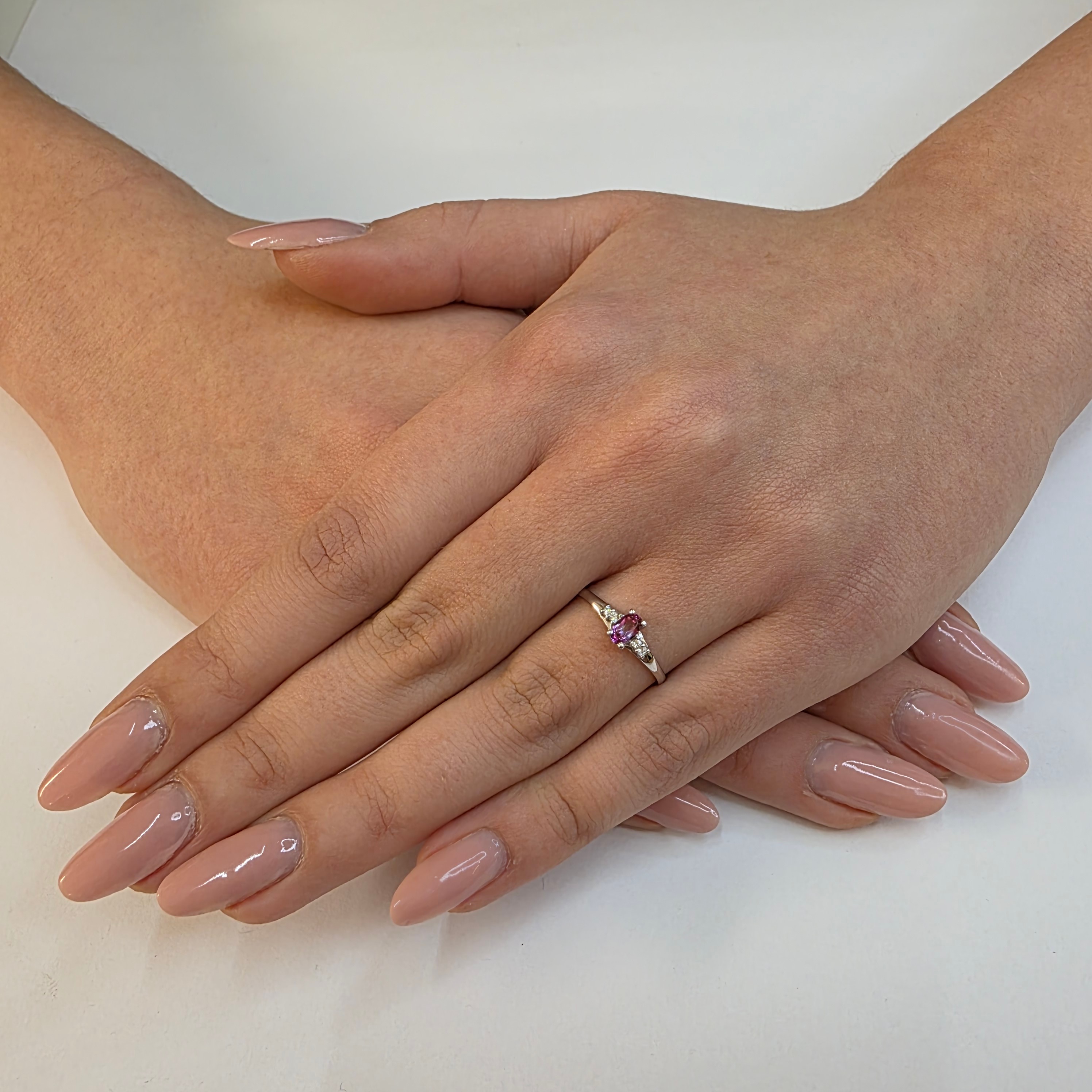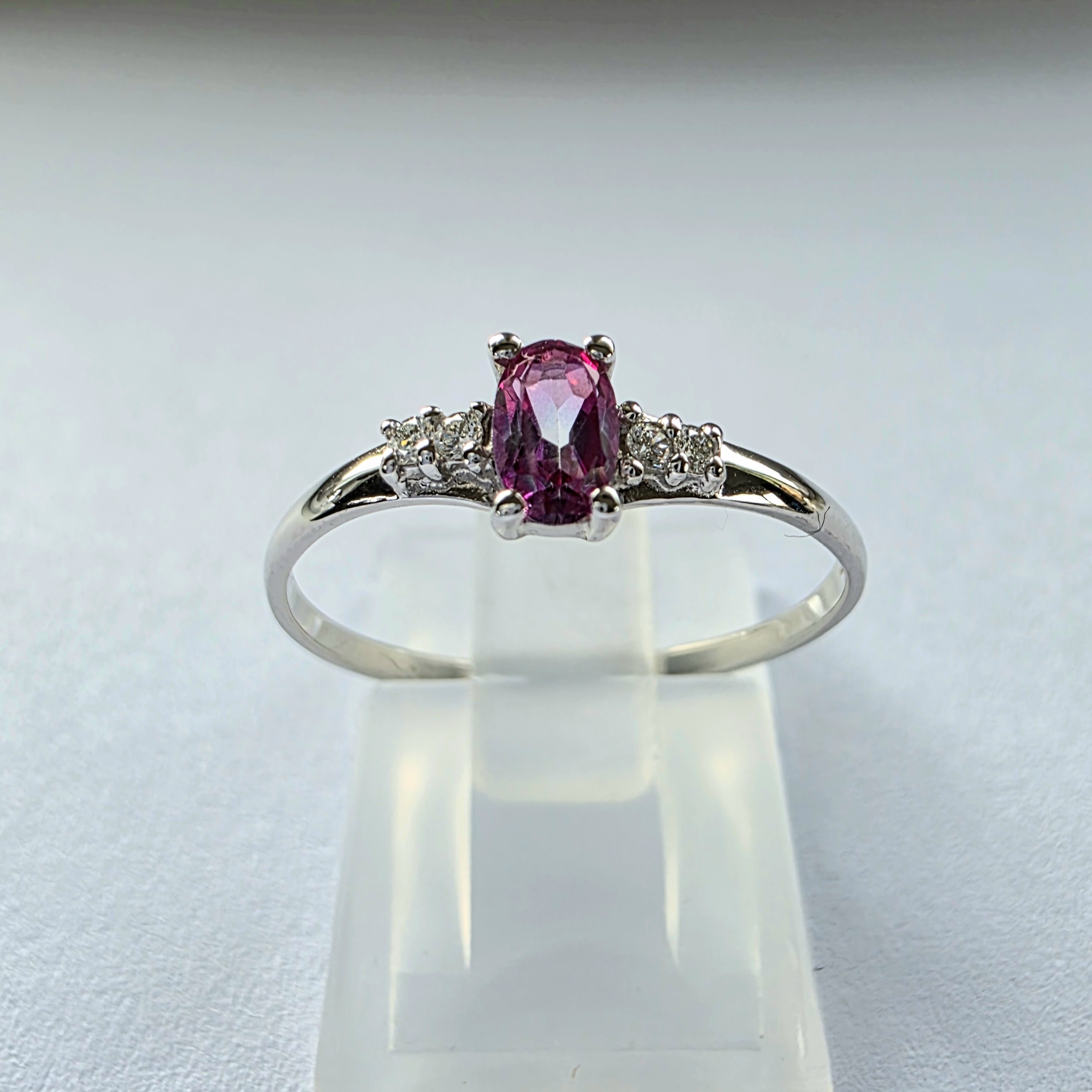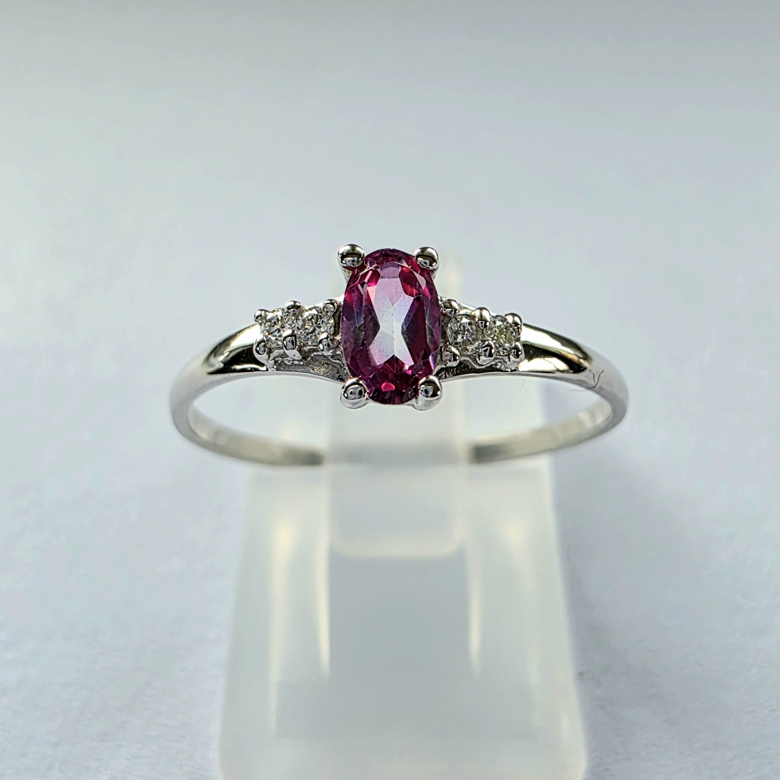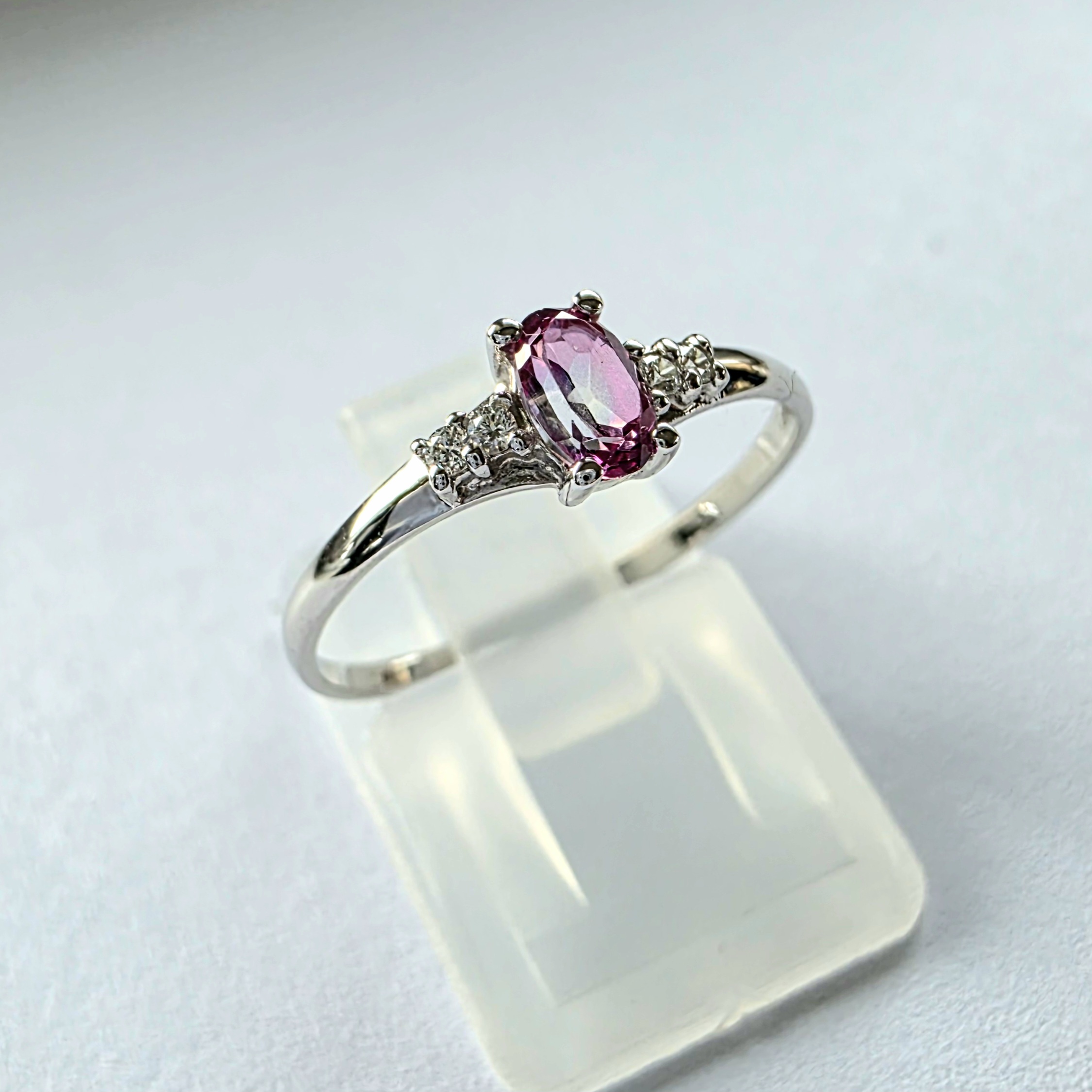 W centrum osadzono naturalny różowy topaz w wymiarze około 5,00 × 3,00 mm i masie około 0,30 ct. Po bokach znajdują się cztery brylanty o średnicy około 1,25 mm każdy, o łącznej masie 0,04 ct. Całość wykonano z złota próby 585, co zapewnia elegancki kolor, trwałość i ponadczasowy charakter biżuterii.