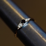 W pierścionku oprawiono: dwa diamenty o średnicy ok. 1,25 mm, dwa o średnicy ok. 1,50 mm oraz jeden diament główny o średnicy ok. 3,00 mm. Zestawienie różnych rozmiarów kamieni tworzy harmonijny, elegancki układ.