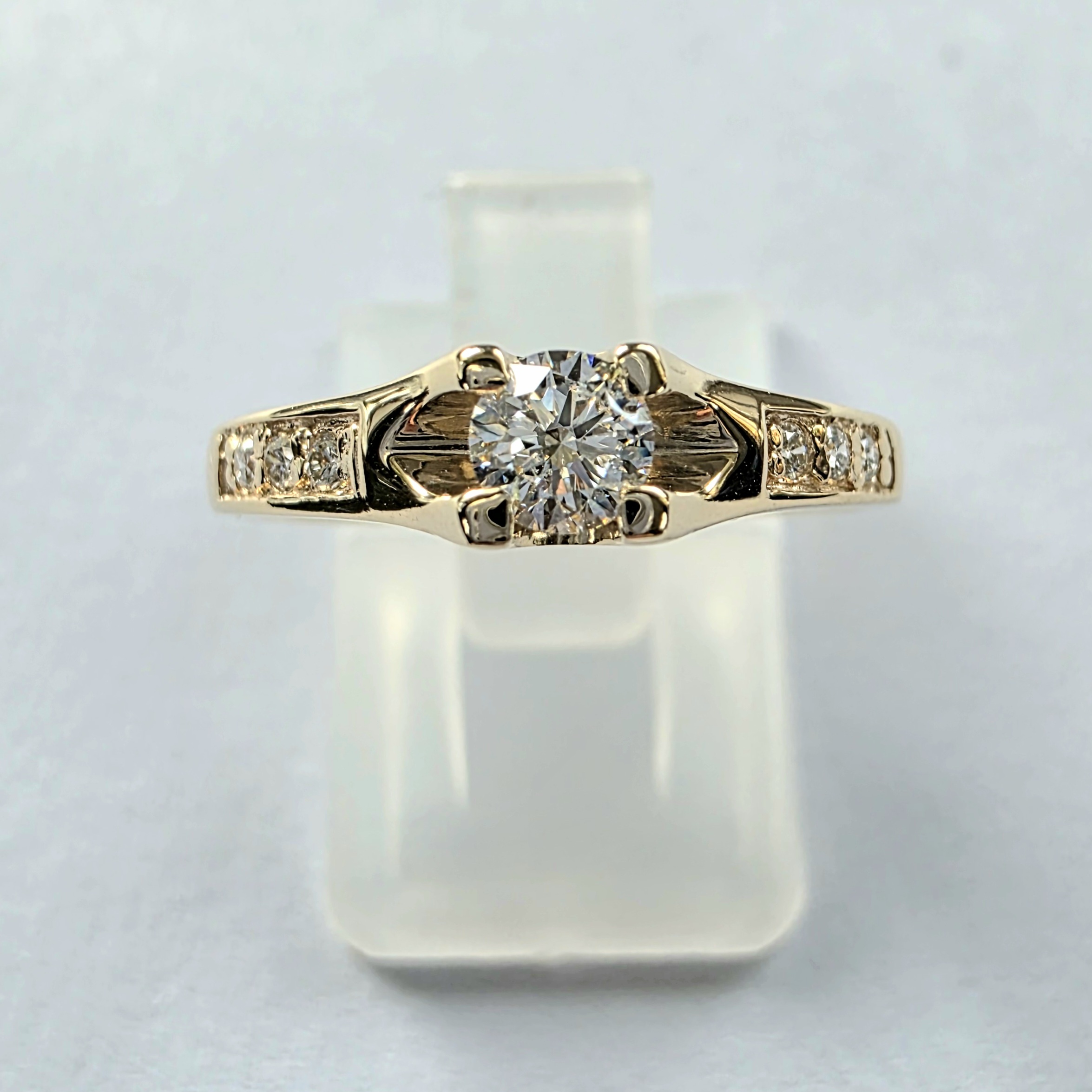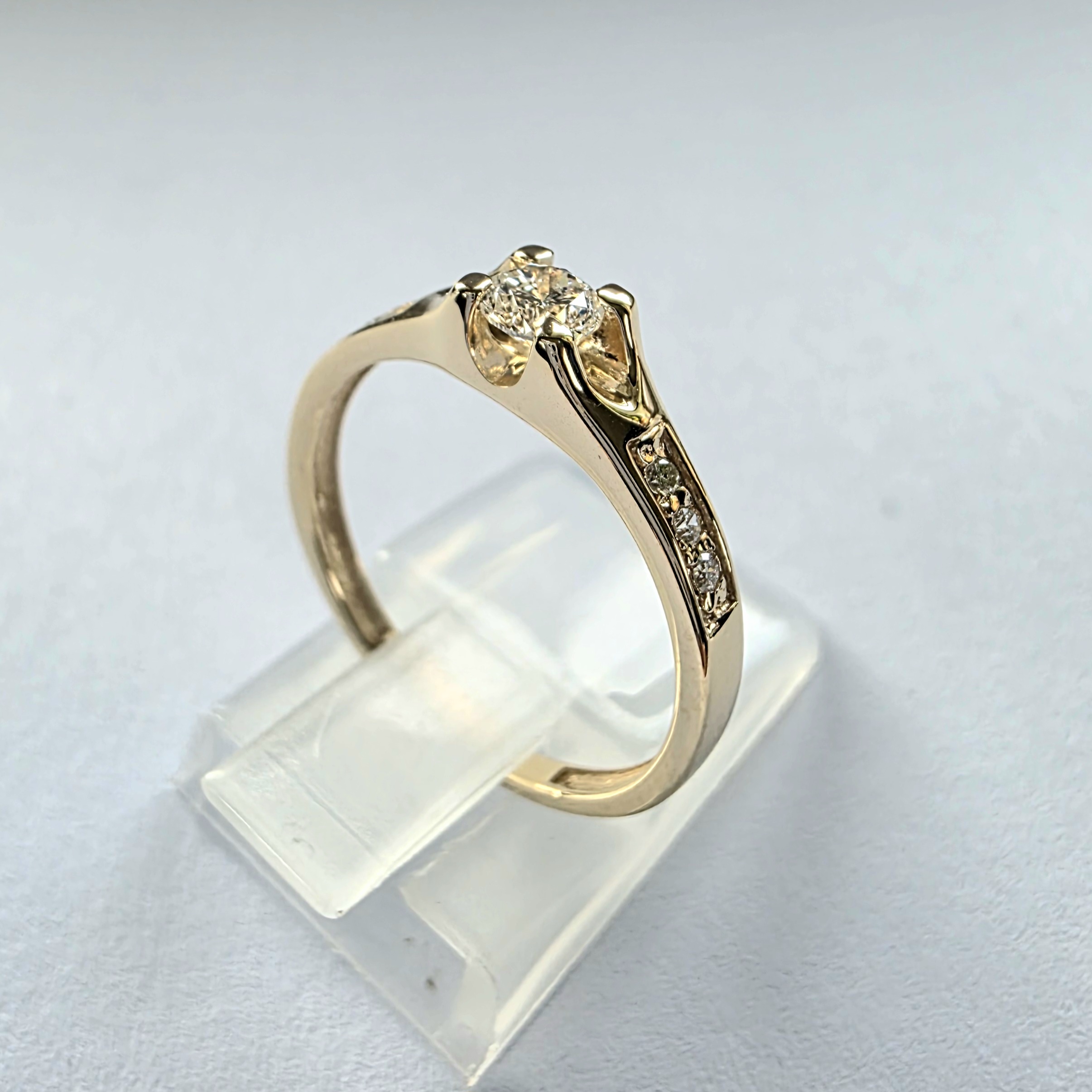 Elegancki pierścionek wykonany z żółtego złota 585 (14K), ozdobiony łącznie 0,25 ct naturalnych diamentów. Centralny brylant o średnicy ok. 3,70 mm został oprawiony w efektowną oprawę lewitującą, która pięknie eksponuje kamień, nadając mu przestrzennego charakteru. Po obu stronach szyny umieszczono po trzy dodatkowe diamenty o średnicy ok. 1,25 mm, tworząc elegancką kompozycję podkreślającą blask brylantu. Model idealny jako prezent dla siebie, a także wyjątkowy wybór na zaręczyny. Wszystkie kamienie dostępne są w dwóch wariantach parametrów: VS/G lub Si/H.
