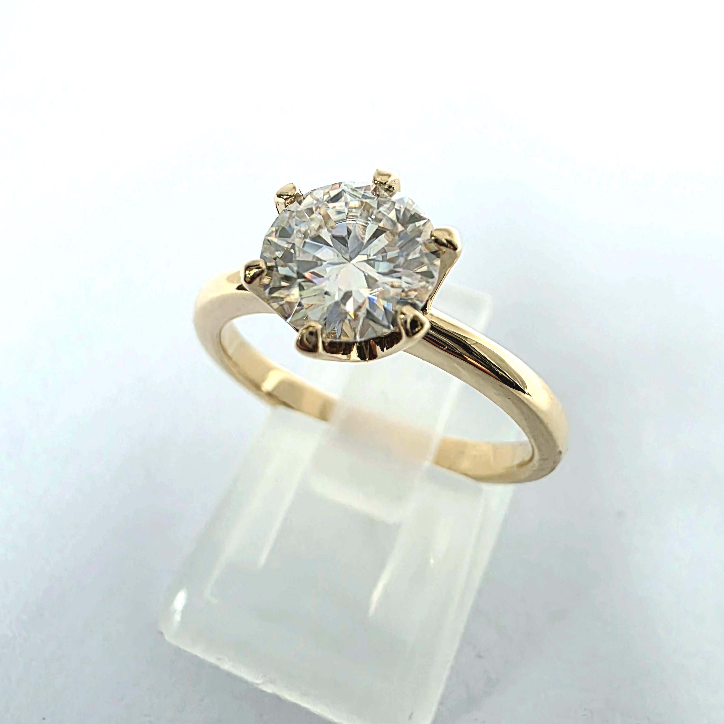 Spektakularny pierścionek wykonany z żółtego złota 585 (14K), ozdobiony diamentem laboratoryjnym o masie ok. 1,50 ct i średnicy ok. 7,40 mm. W tym modelu stosujemy wyłącznie kamienie o minimalnych parametrach VS1/E, co zapewnia wyjątkową czystość oraz jasną, szlachetną barwę. Konstrukcja została zaprojektowana tak, aby służyć przez lata — 6 solidnych łap oraz stabilna, mocna obrączka gwarantują trwałość i bezpieczeństwo kamienia. To model o imponującej prezencji, idealny na zaręczyny oraz jako luksusowy prezent dla siebie.
