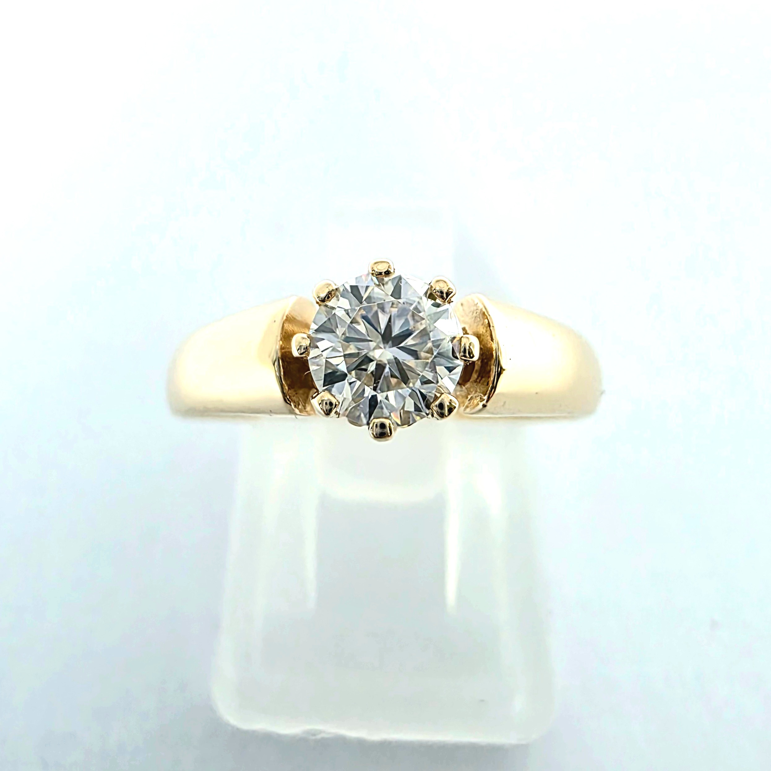Szlif brylantowy podkreśla ogień i połysk diamentu, dzięki czemu kamień pięknie się prezentuje. Minimalistyczna oprawa pozwala skupić uwagę na kamieniu i jego blasku.