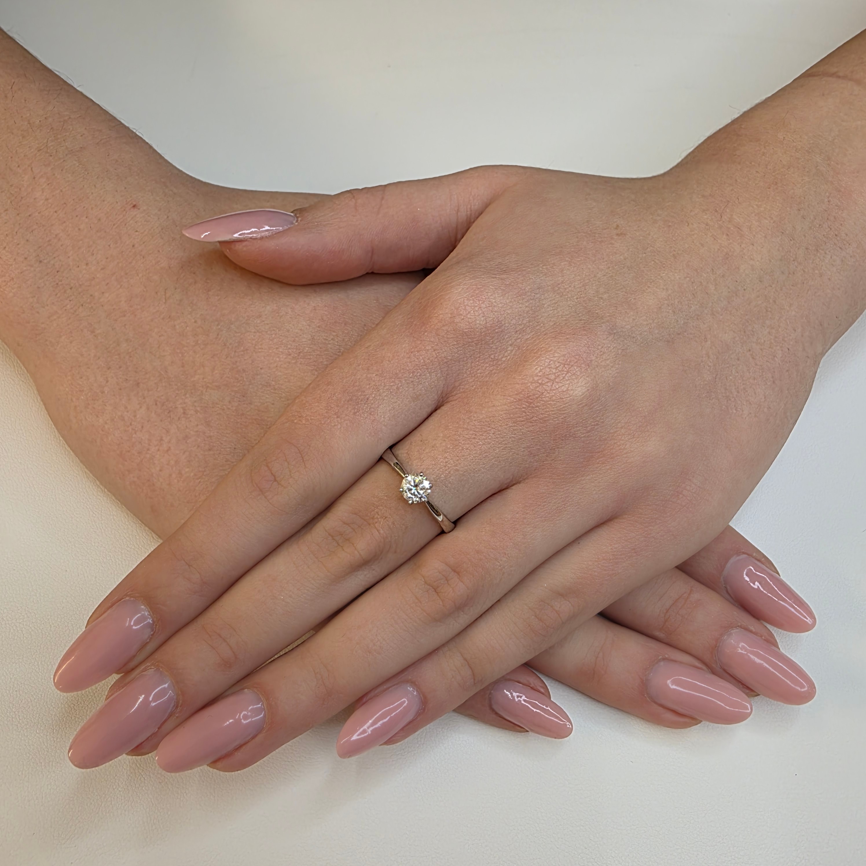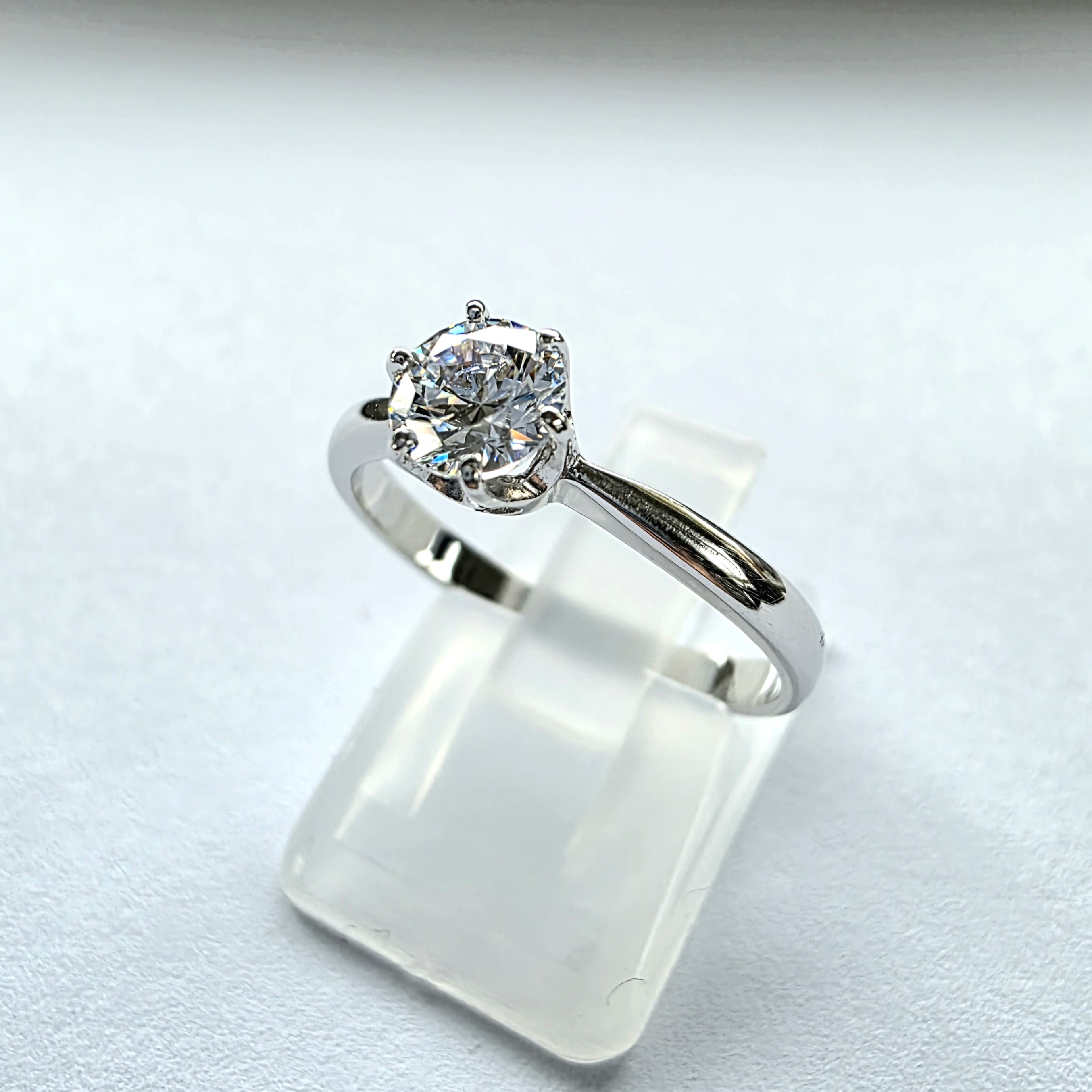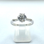 Ponadczasowy pierścionek wykonany z białego złota 585 (14K), zaprojektowany tak, aby łączyć klasyczną elegancję z wyjątkową trwałością. W centrum osadzono moissanit brylantowy 0,50 ct o średnicy 5,0 mm, który zachwyca intensywnym blaskiem i perfekcyjną przejrzystością. To model, który nigdy nie wychodzi z mody — idealny na zaręczyny, prezent i codzienne noszenie.