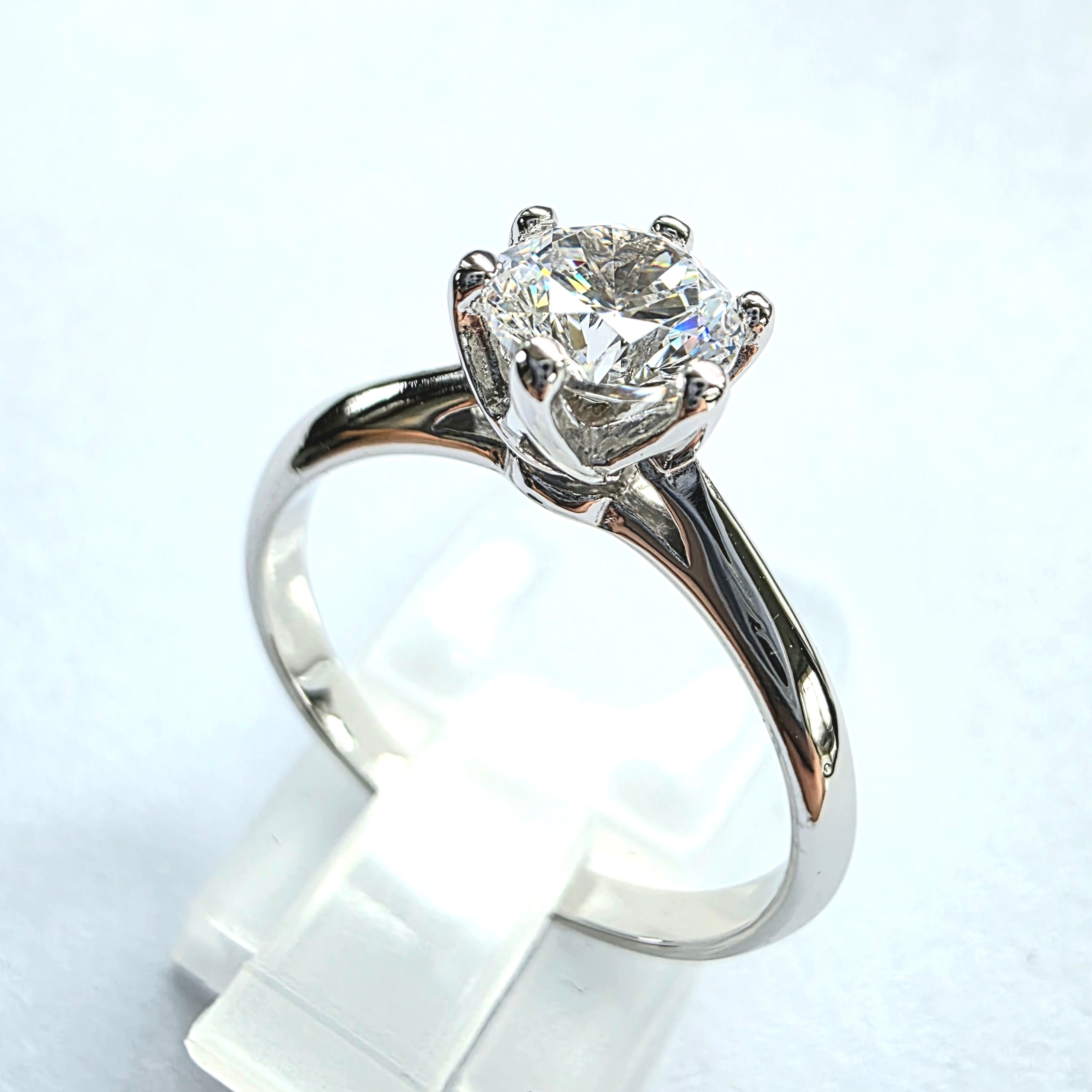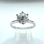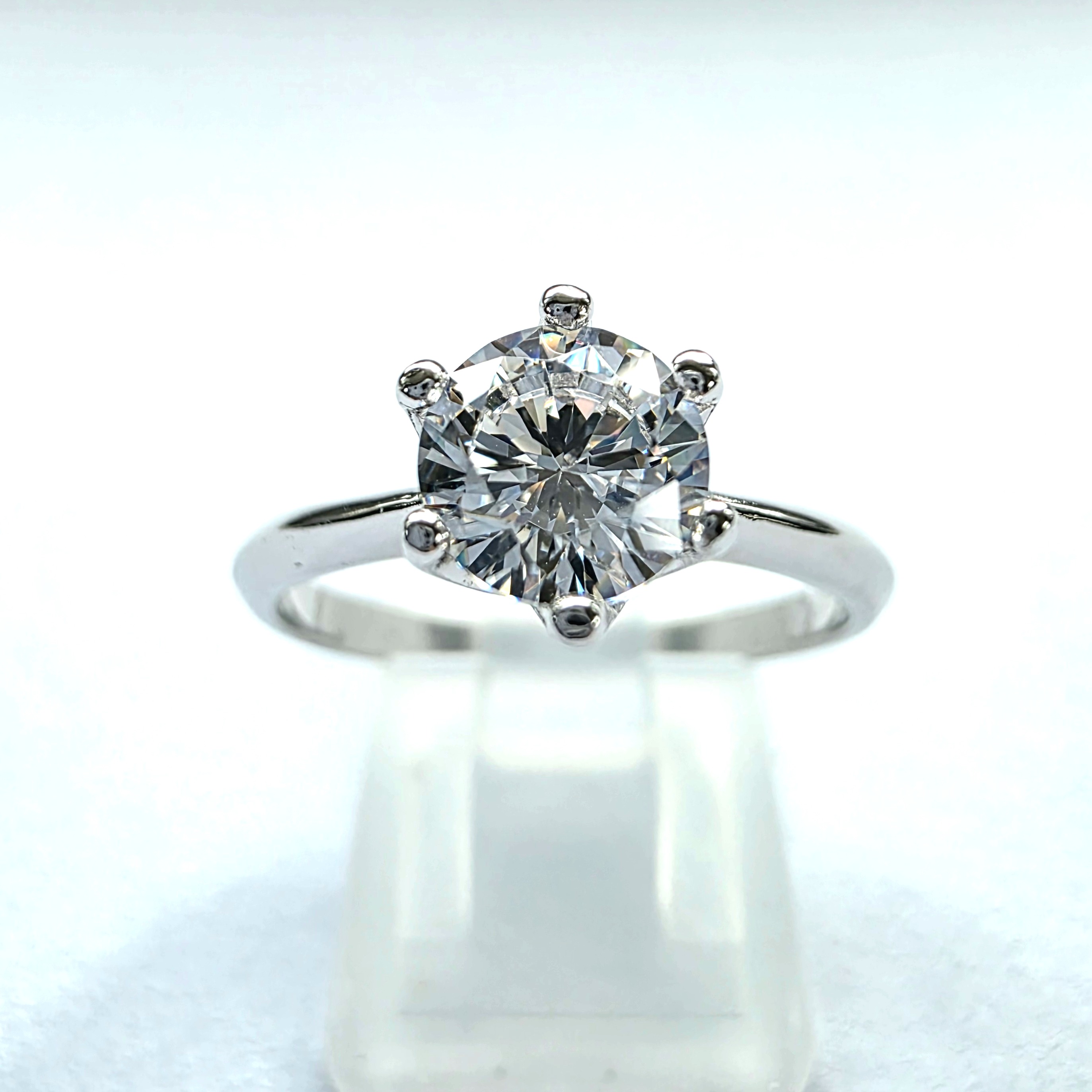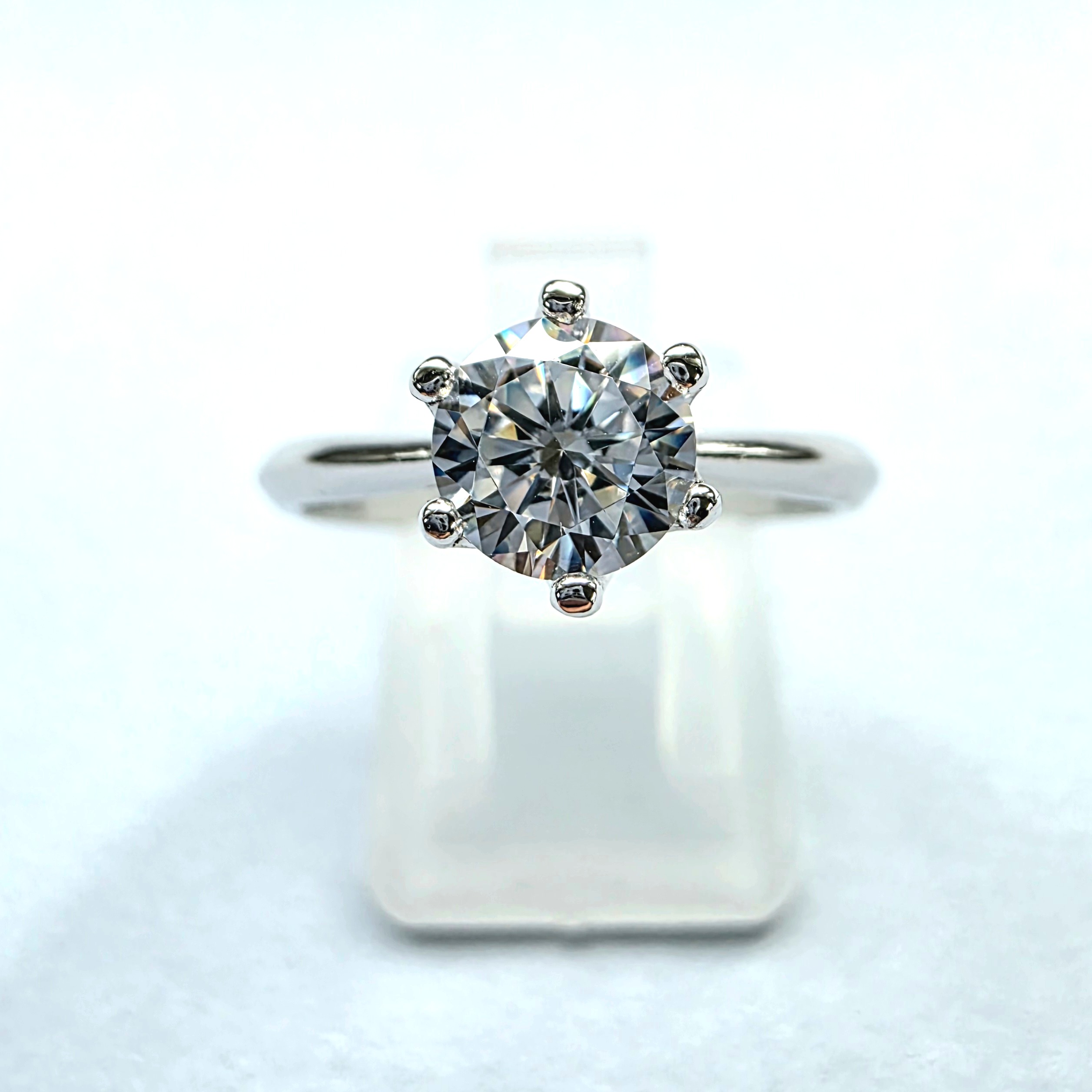 Ponadczasowy, solidny pierścionek wykonany z białego złota 585 (14K), w którego centrum osadzono moissanit brylantowy 0,80 ct o średnicy 6,0 mm. Klasyczna forma została uzupełniona o delikatnie wyeksponowaną oprawę, która unosi kamień nieco ponad linię szyny, podkreślając jego blask i pełnię optycznego efektu. W naszej pracowni stosujemy moissanity o minimalnej czystości VS1, co gwarantuje piękną przejrzystość i intensywną grę światła.