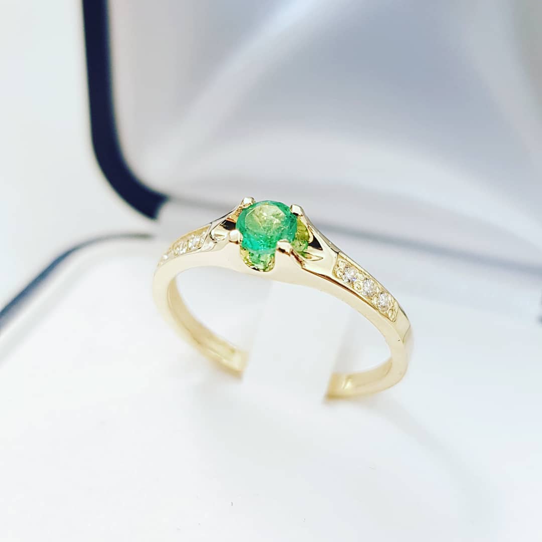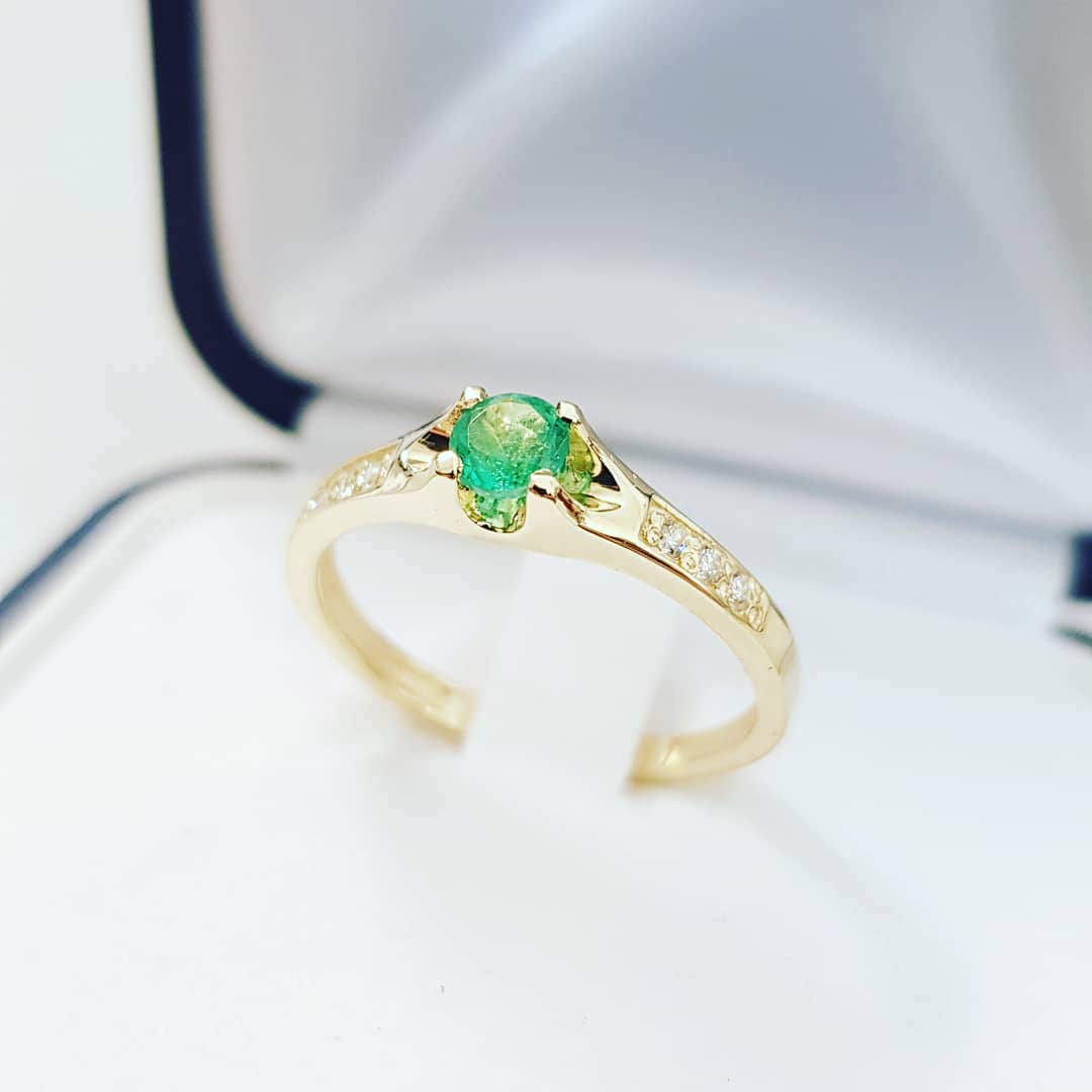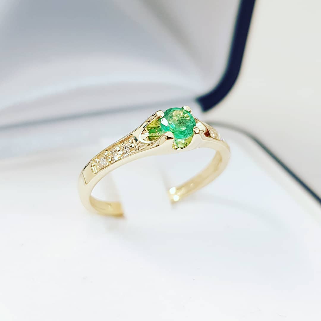 W centrum znajduje się naturalny szmaragd w okrągłym szlifie brylantowym, o średnicy około 3,70 mm i masie około 0,19 ct. Dodatkowo pierścionek zdobią diamenty o łącznej masie 0,06 ct (drobne kamienie ~1,25 mm). Całość wykonano ze złota próby 585, a masa pierścionka wynosi około 1,85 g.