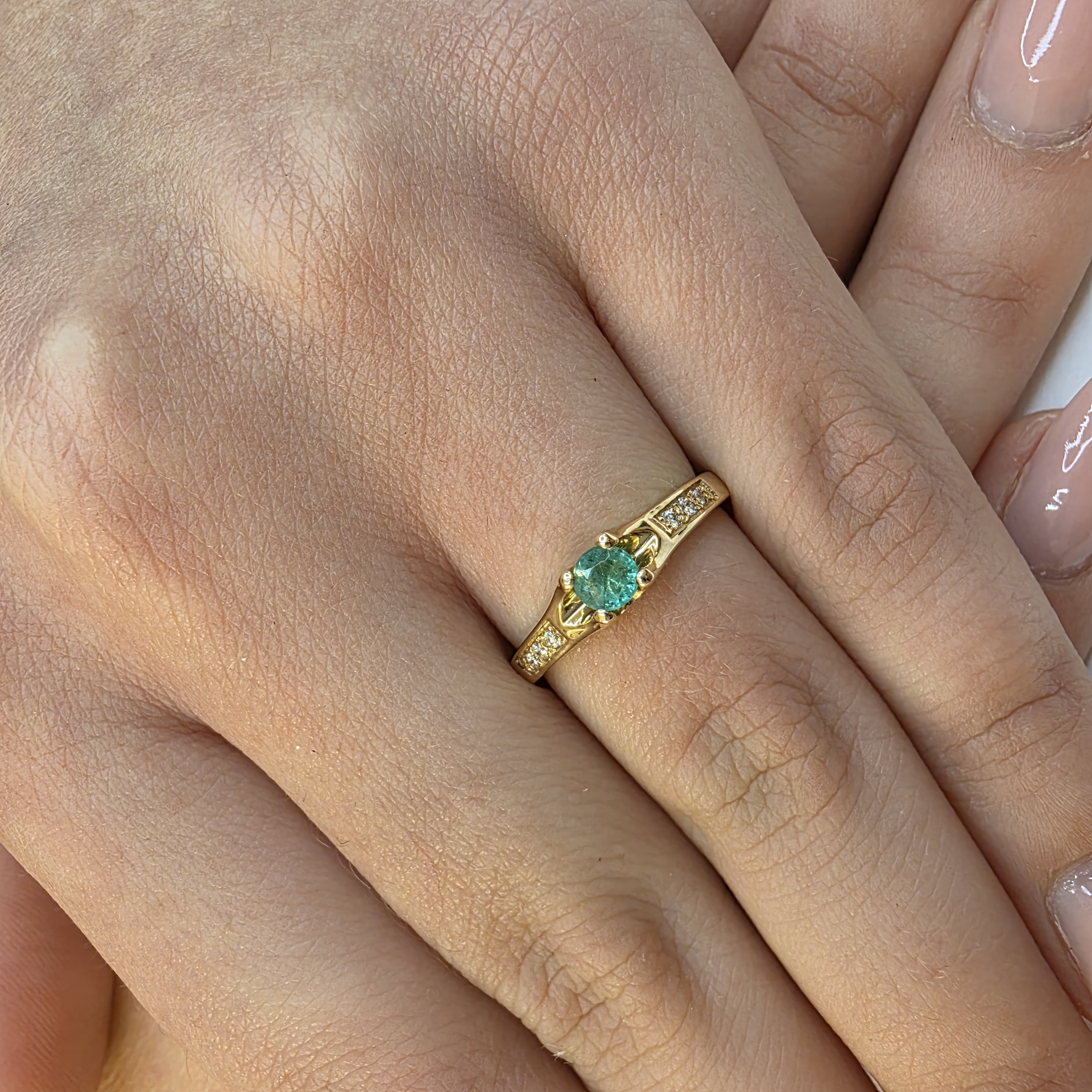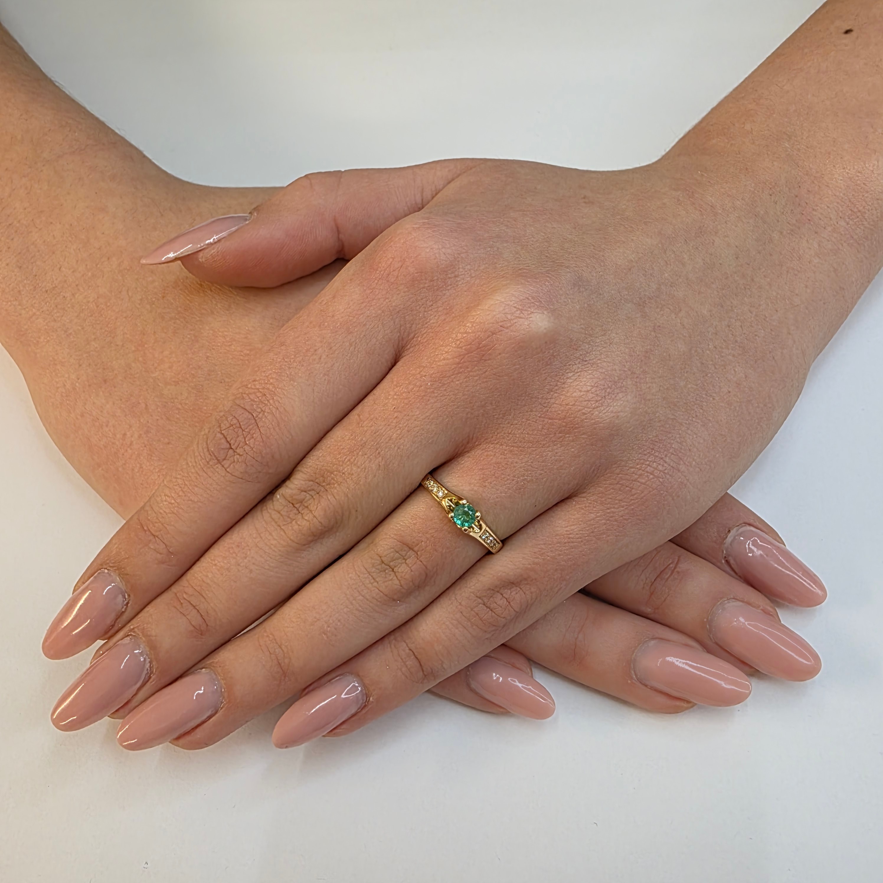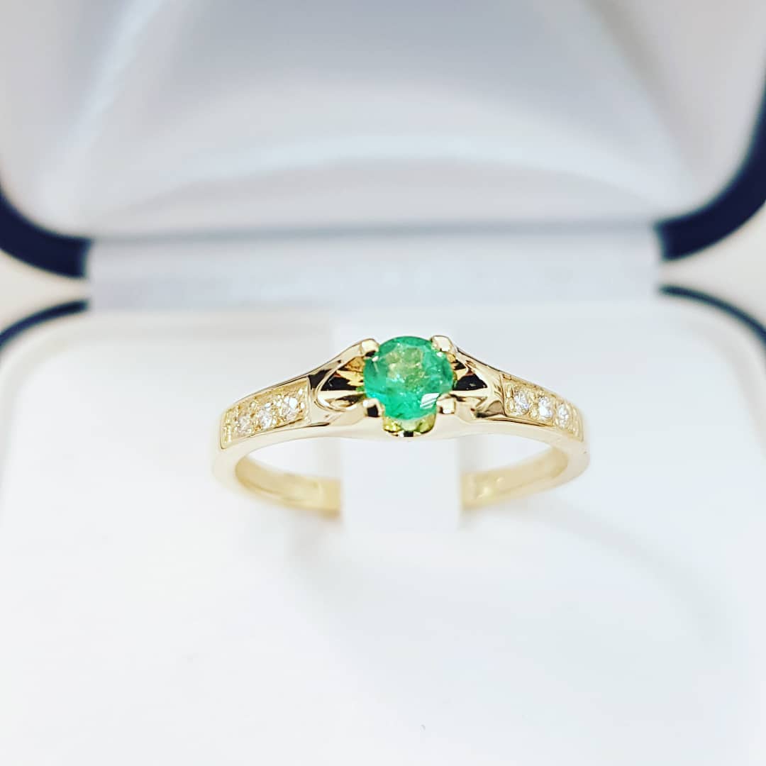W centrum znajduje się naturalny szmaragd w okrągłym szlifie brylantowym, o średnicy około 3,70 mm i masie około 0,19 ct. Dodatkowo pierścionek zdobią diamenty o łącznej masie 0,06 ct (drobne kamienie ~1,25 mm). Całość wykonano ze złota próby 585, a masa pierścionka wynosi około 1,85 g.