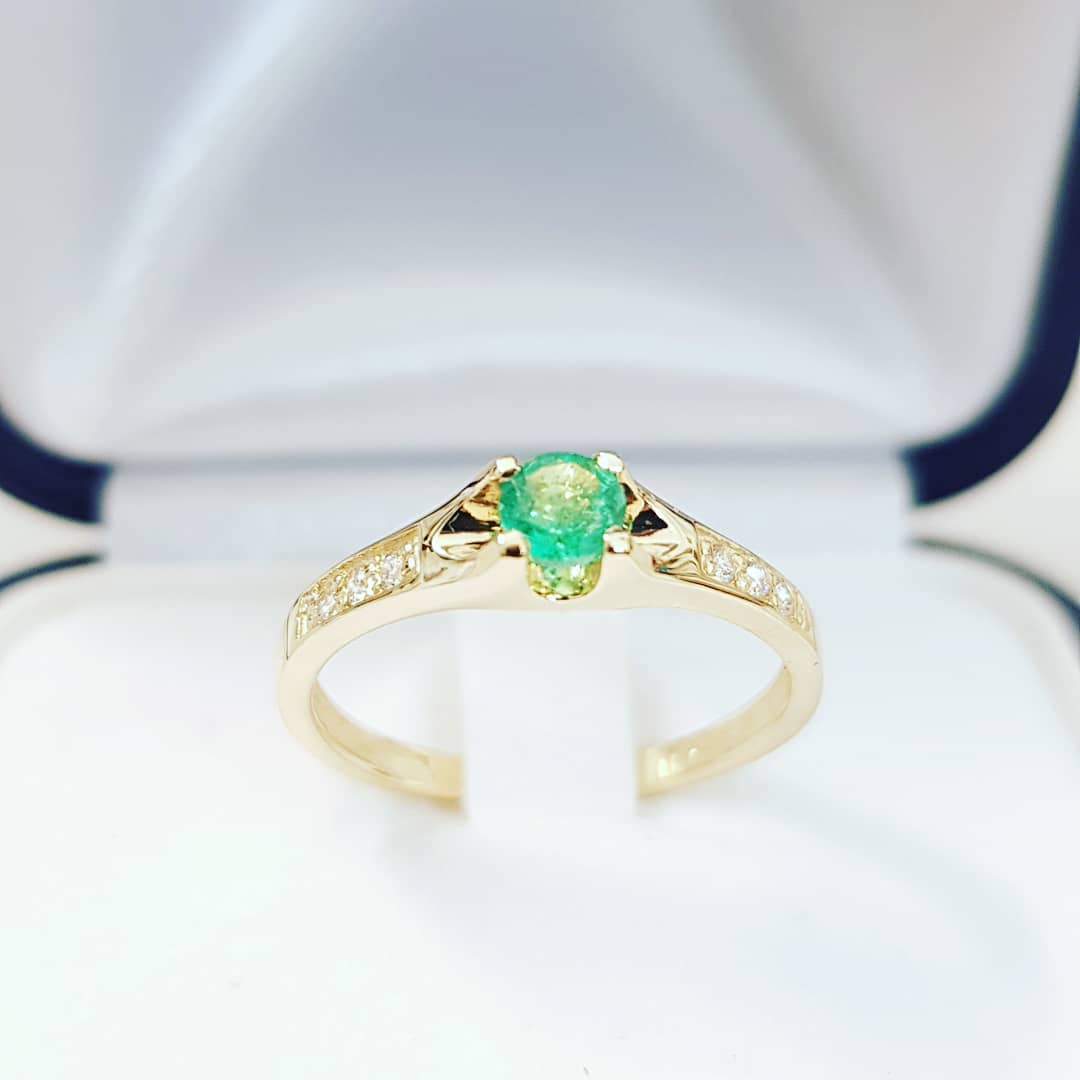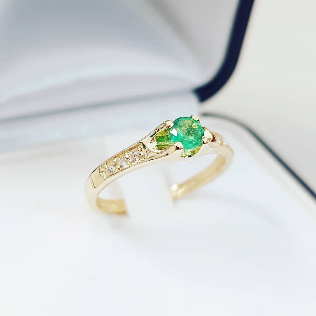 Pierścionek zaręczynowy 585 ze szmaragdem i diamentami – żółte złoto – ABgold Baczyński