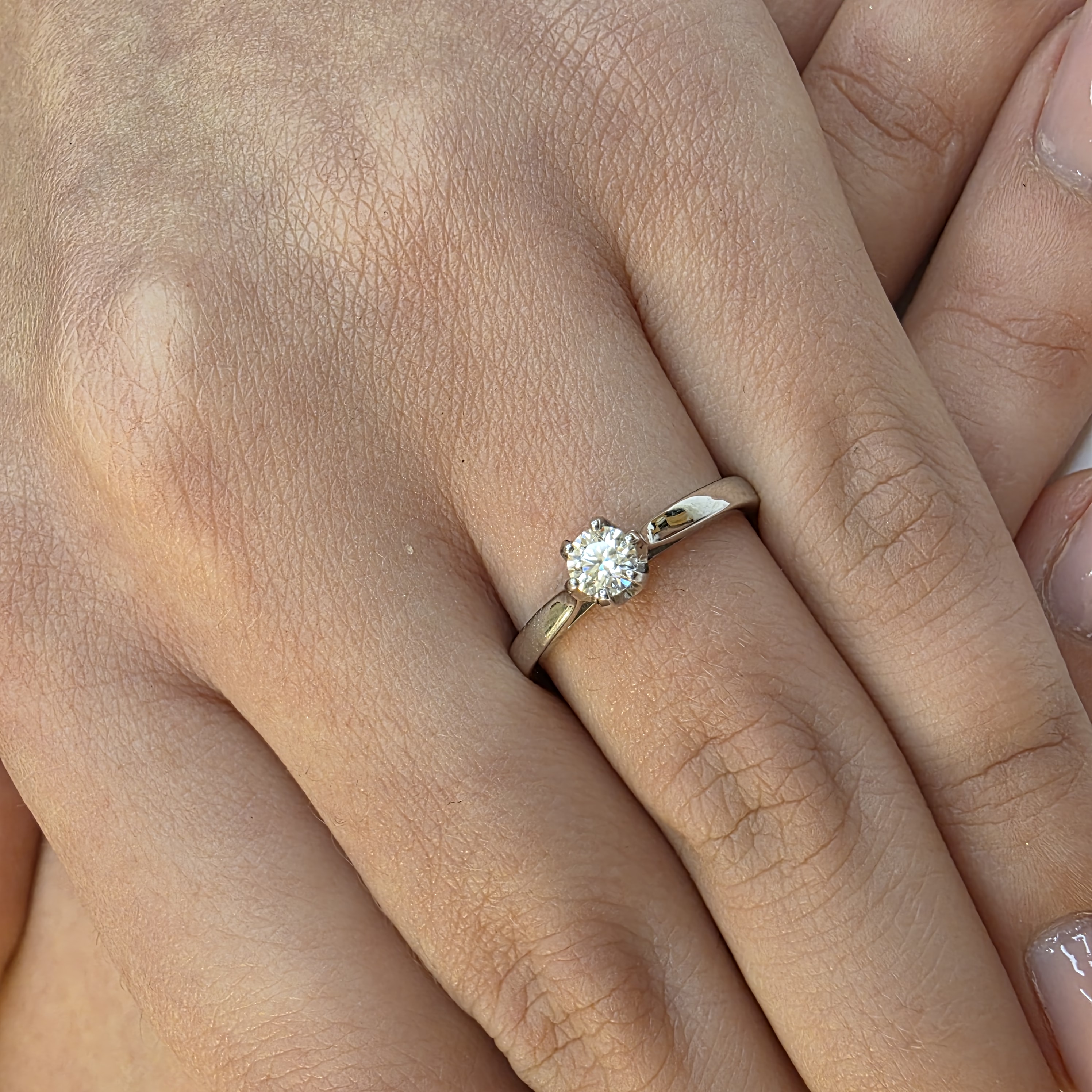 Kultowy model z naszej kolekcji – pierścionek wykonany z żółtego złota 585 (14K), ozdobiony moissanitem brylantowym 0,50 ct o średnicy 5,0 mm. Kwiatowa oprawa nadaje mu romantycznego, biżuteryjnego charakteru, który od lat czyni go jednym z najchętniej wybieranych wzorów zaręczynowych. W naszej pracowni stosujemy moissanity o minimalnej czystości VS1, co gwarantuje niezwykły blask i piękną przejrzystość.