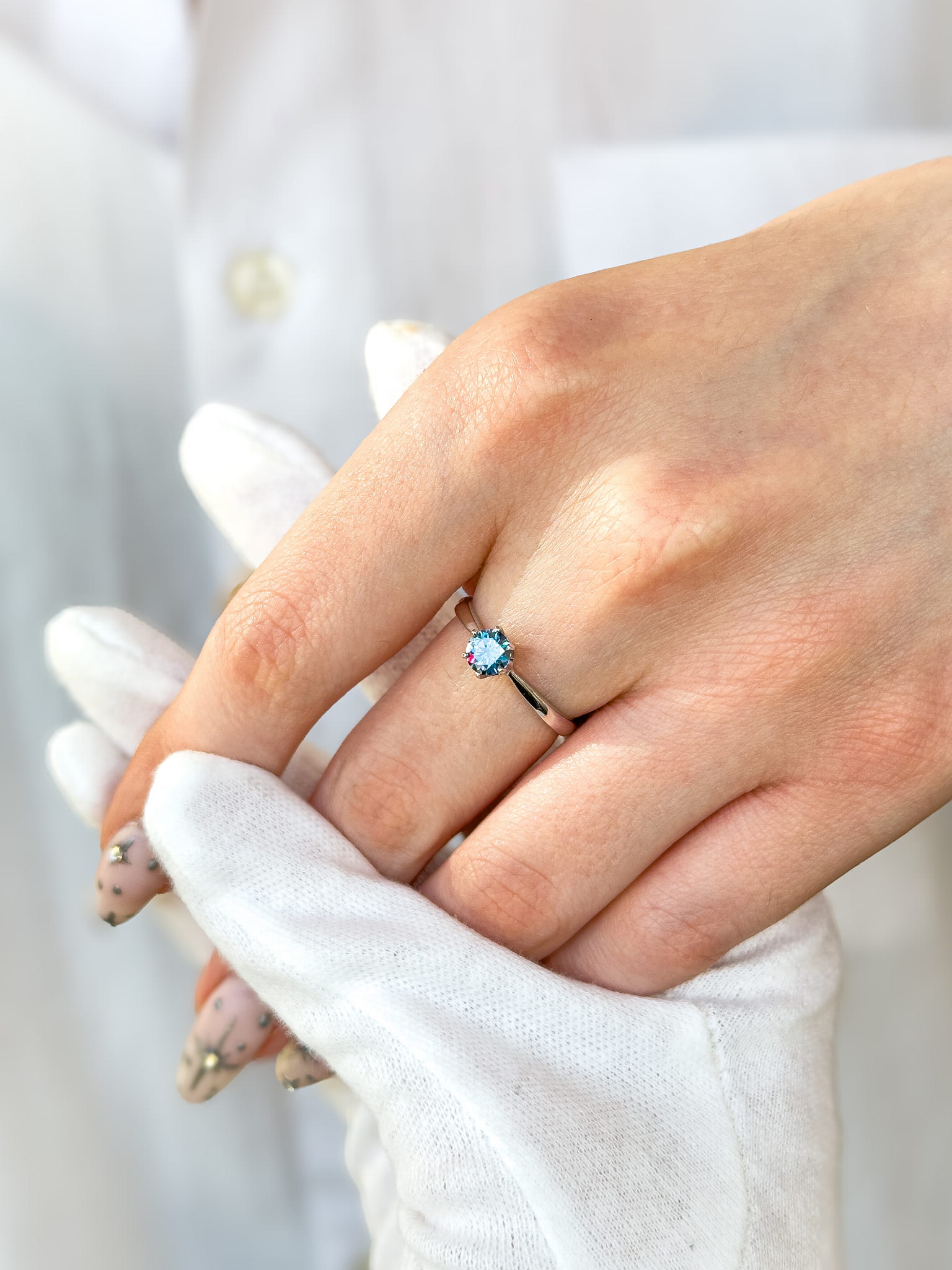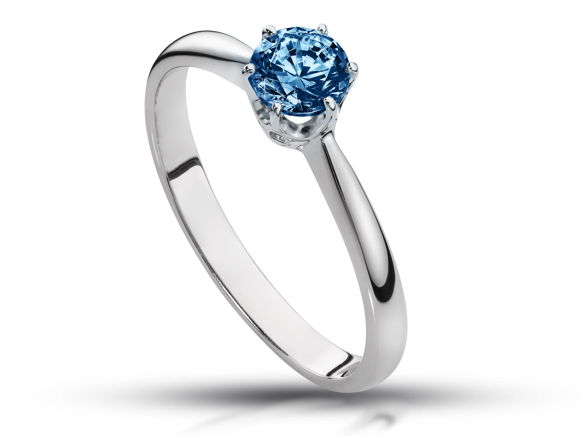 Ponadczasowy pierścionek wykonany z białego złota 585 (14K), w którego centrum osadzono niebieski moissanit w szlifie brylantowym o średnicy 5,0 mm i masie około 0,50 ct. W naszej pracowni do moissanitów stosujemy minimalną czystość VS1, co gwarantuje kamienie o wysokiej przejrzystości i doskonałych właściwościach optycznych. To klasyczny wzór, który nigdy nie wychodzi z mody – idealny na prezent, zaręczyny lub elegancki dodatek na co dzień.