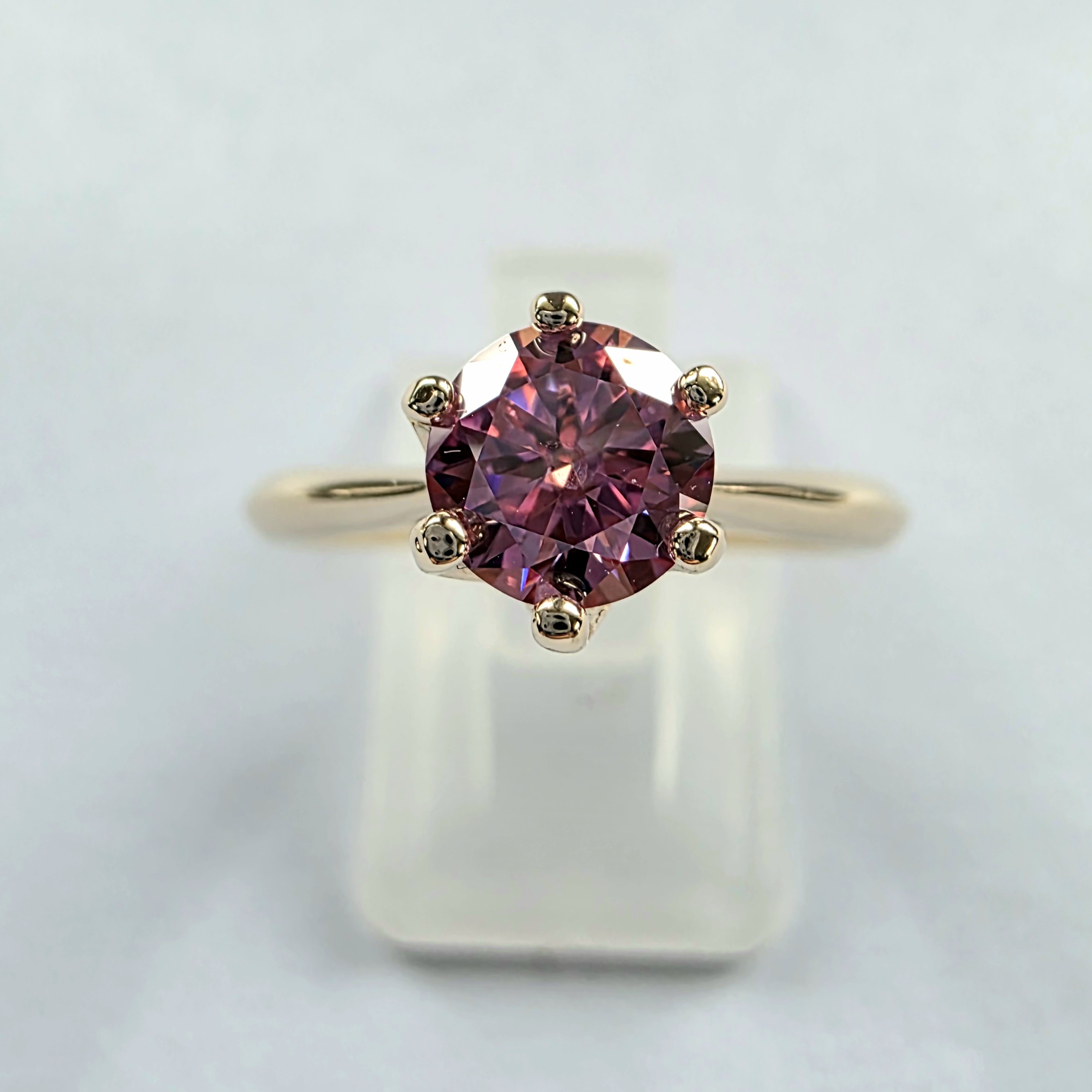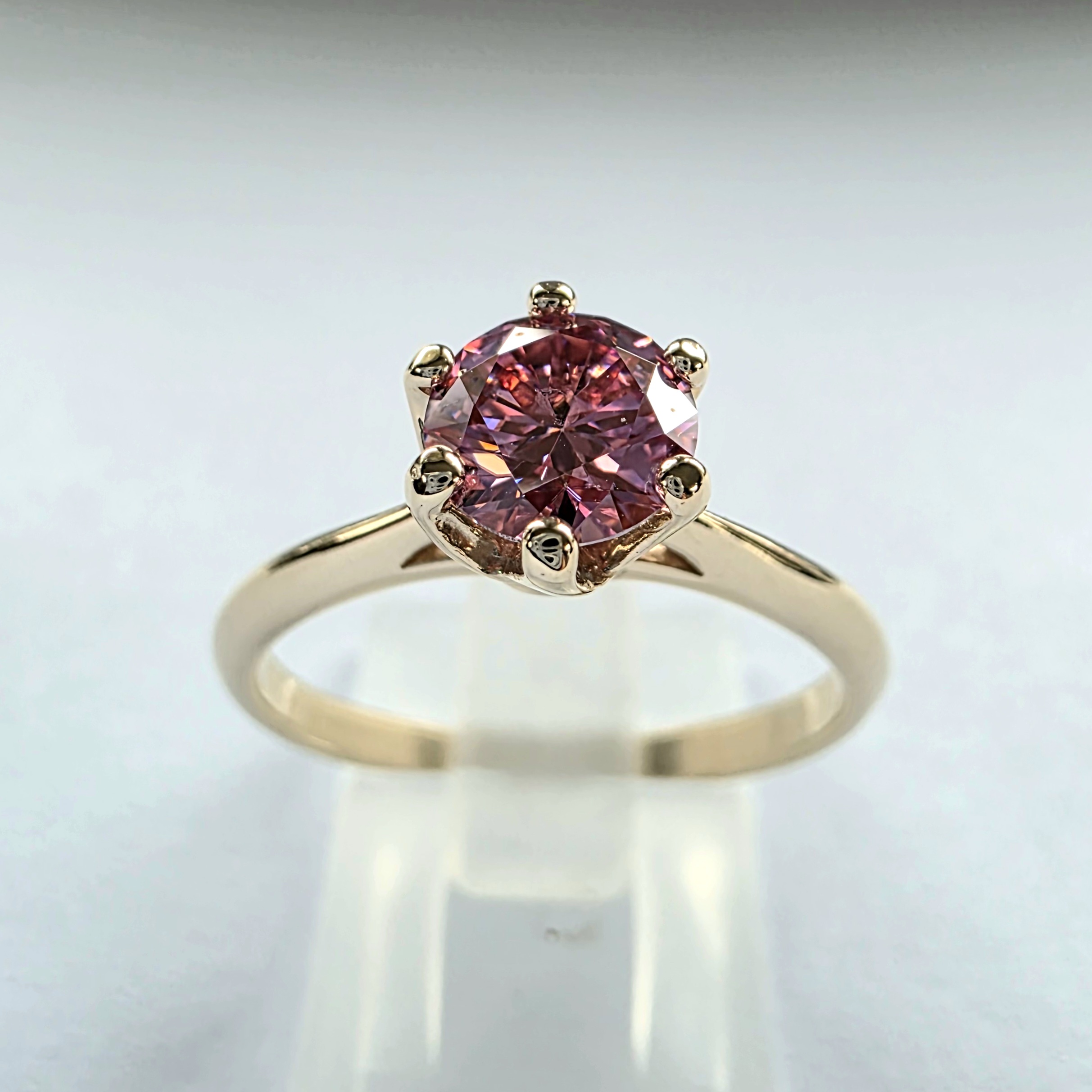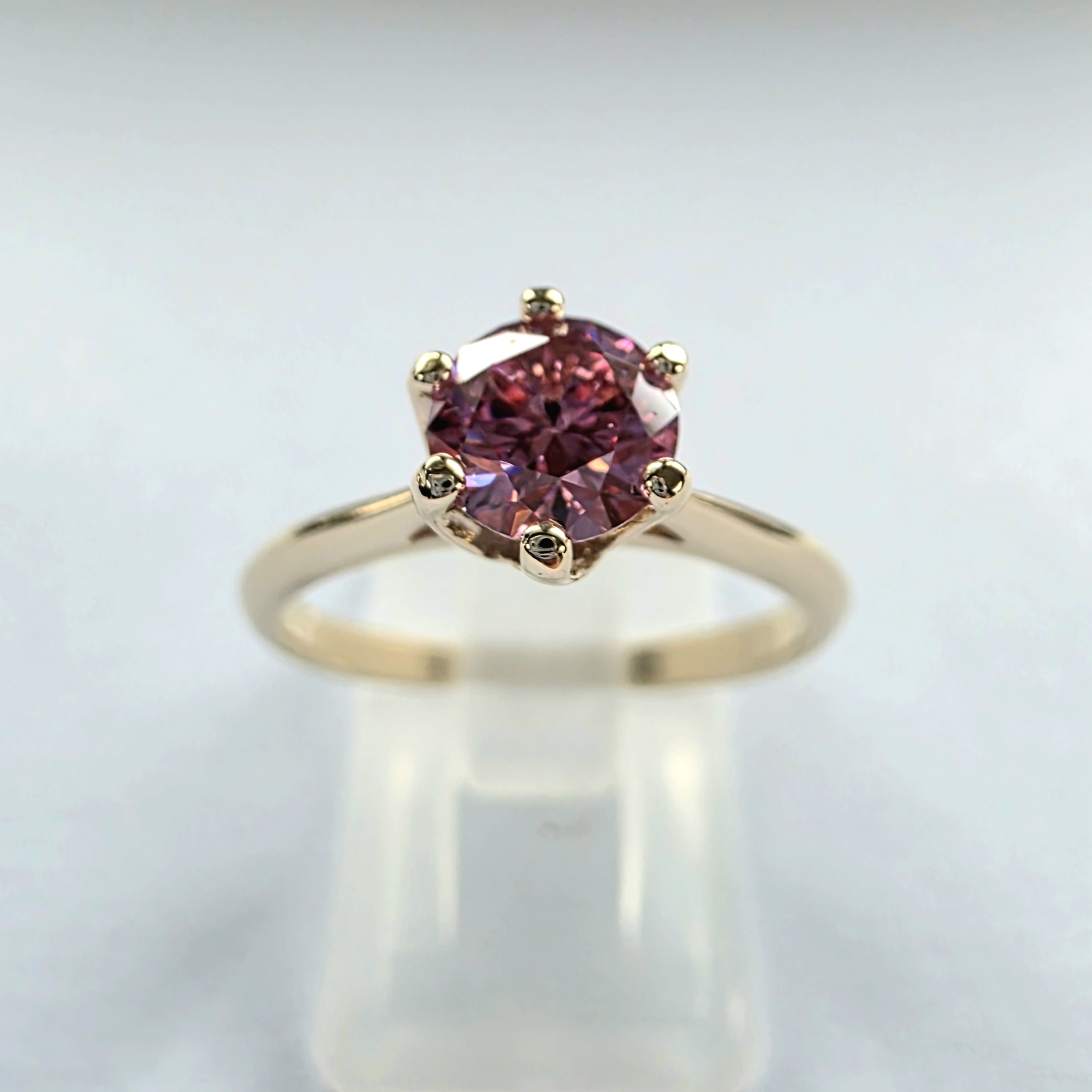 Pierścionek waży około 2,40 g i wykonany jest z żółtego złota próby 585. Centralny kamień to różowy moissanit brylantowy o masie zbliżonej do 0,80 ct i średnicy 6,0 mm. Oprawa została wyniesiona, co uwydatnia brylantowy blask kamienia, a jej okrągłe wykończenie zapewnia komfort w codziennym noszeniu.