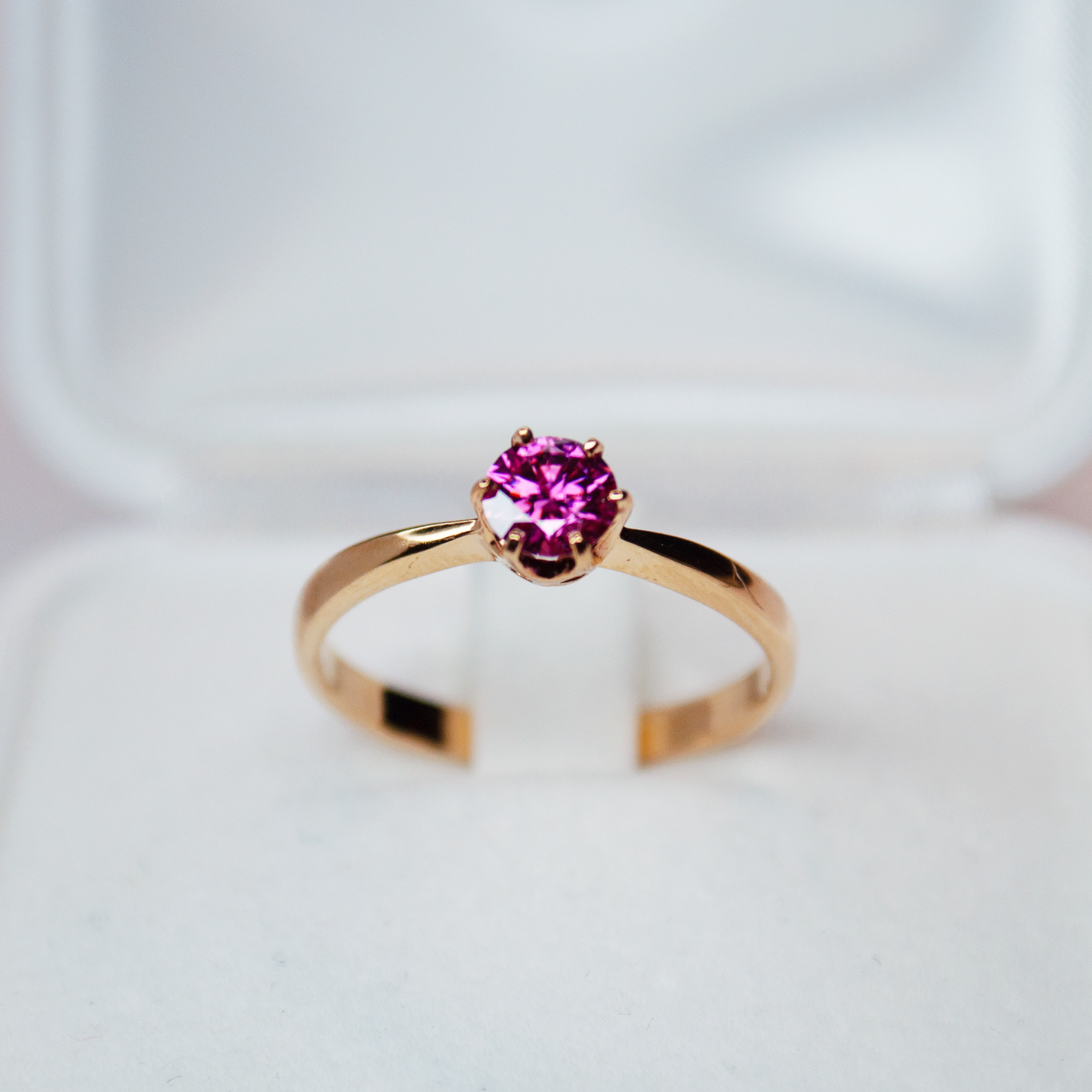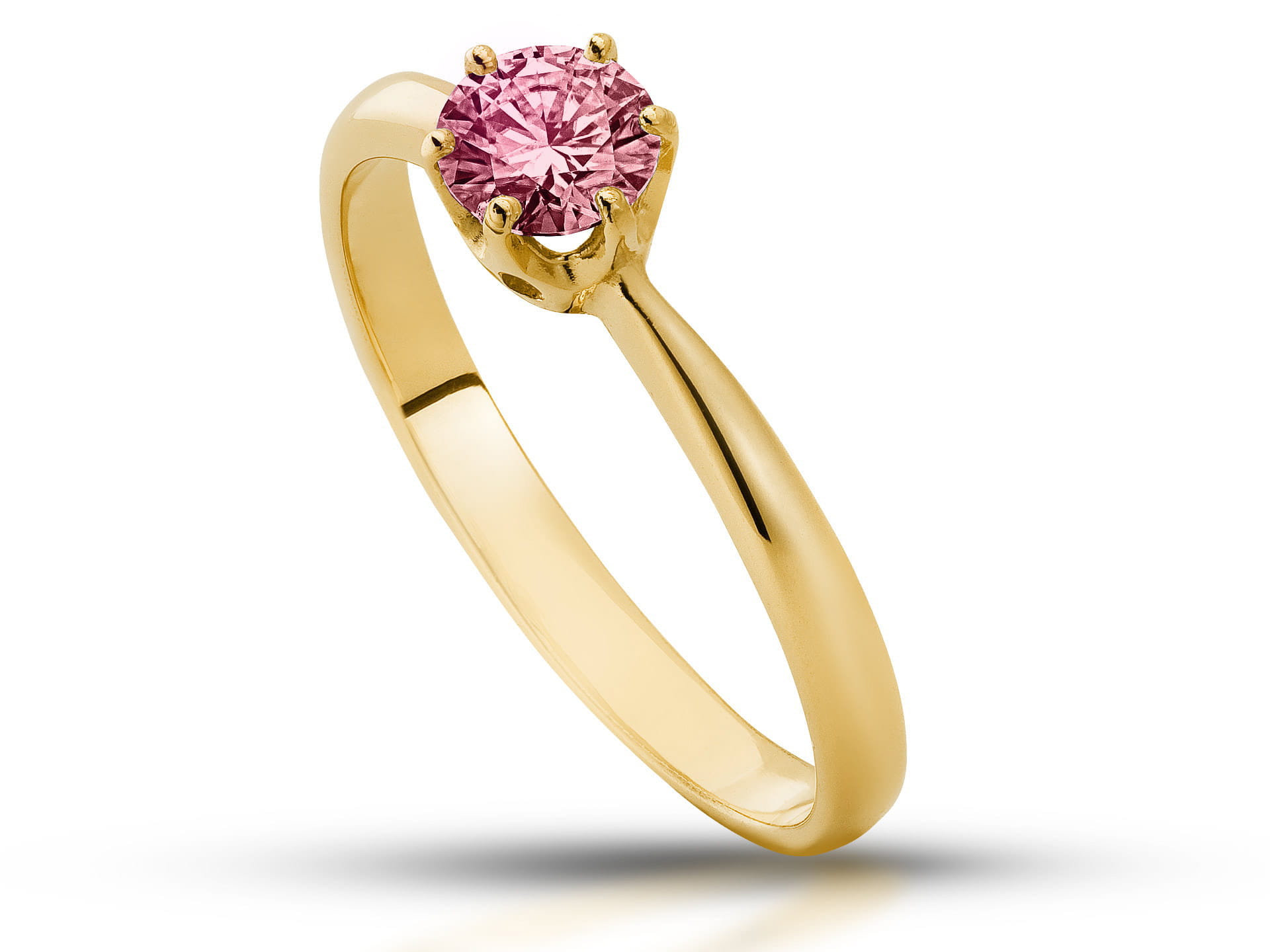 Ponadczasowy pierścionek wykonany z żółtego złota 585 (14K), ozdobiony różowym moissanitem w szlifie brylantowym o średnicy 5,0 mm i masie około 0,50 ct. Oprawa kamienia jest delikatnie wyeksponowana ponad linię szyny, co pięknie podkreśla jego kolor i brylantowy blask, a jednocześnie pozostaje wygodna i praktyczna w codziennym noszeniu. W naszej pracowni stosujemy moissanity o minimalnej czystości VS1, dzięki czemu każdy kamień prezentuje się perfekcyjnie.