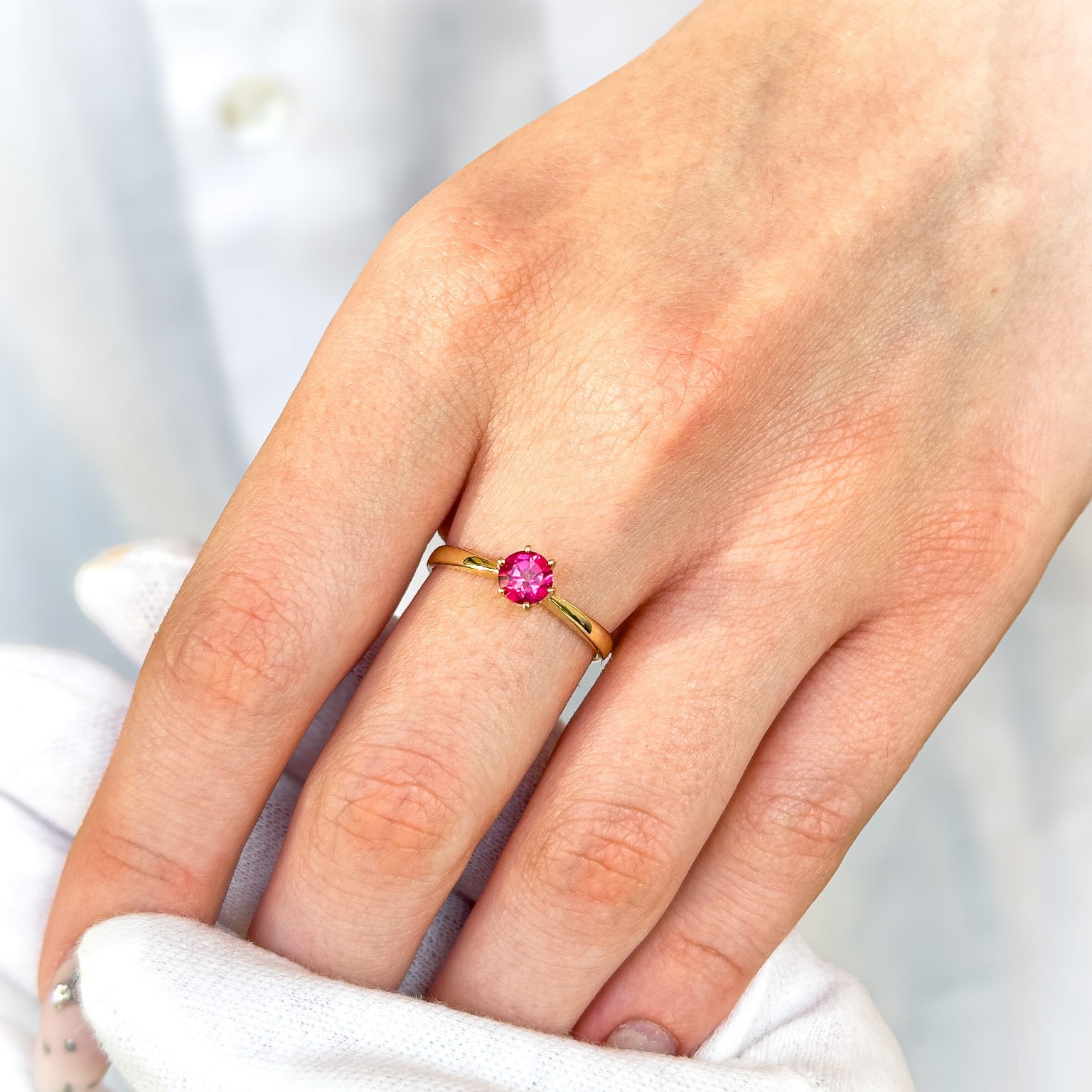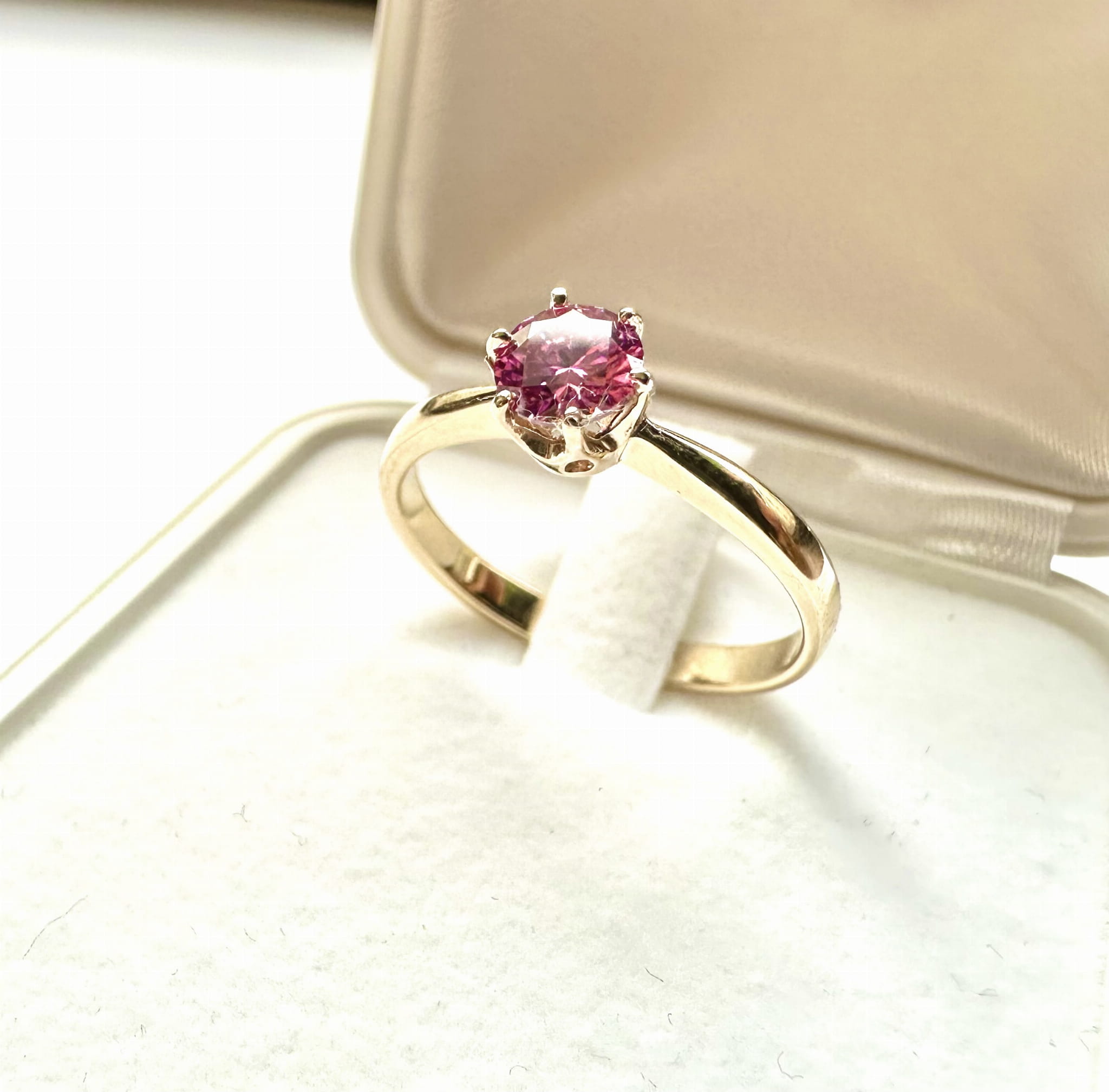 Masa pierścionka wynosi około 2,00 g, a do jego wykonania użyto żółtego złota próby 585. Centralnym elementem jest różowy moissanit o średnicy 5,0 mm i masie ok. 0,50 ct, osadzony w klasycznej, subtelnie wyniesionej oprawie. Konstrukcja pozostaje stabilna, smukła i elegancka — idealna na zaręczyny, prezent lub biżuterię codzienną.