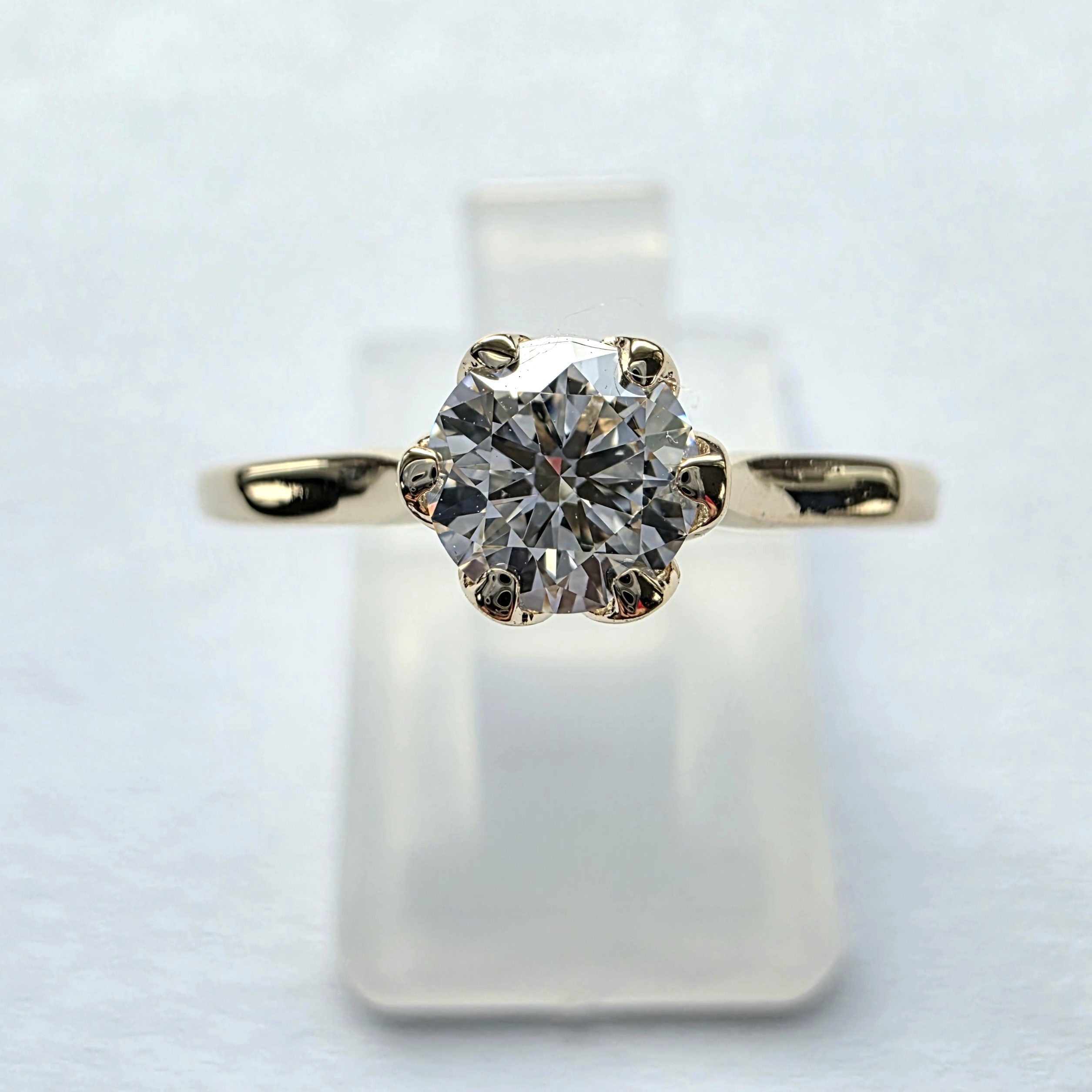 Szlif brylantowy wydobywa z diamentu pełnię światła, podkreślając jego ogień i elegancję. Dzięki wysokiej czystości VS1 oraz barwie E, kamień lśni intensywnie i prezentuje się wyjątkowo szlachetnie zarówno w świetle dziennym, jak i sztucznym.