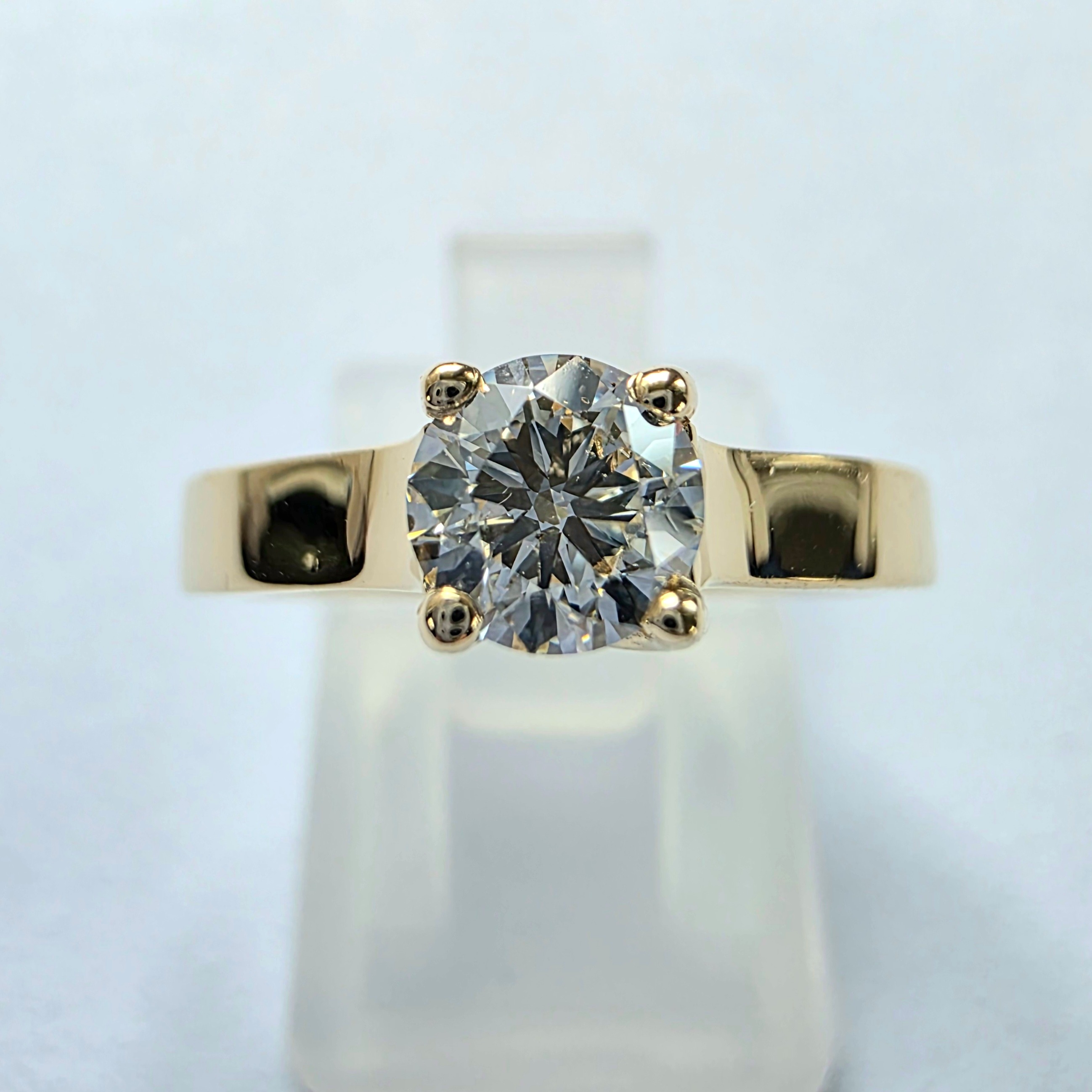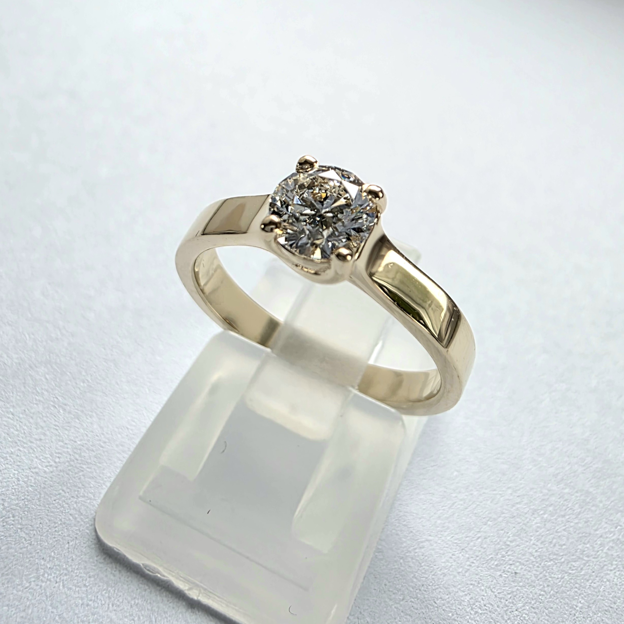 Wyrazisty i elegancki pierścionek wykonany z żółtego złota 585 (14K), osadzony z brylantowym moissanitem VS1/E o średnicy około 5,0 mm i masie ok. 0,50 ct. Model ten charakteryzuje się szeroką obrączką na całej długości szyny, tworząc solidną, masywną formę i wyraźną przewagę złota nad kamieniem. Idealny wybór na zaręczyny dla osób, które cenią mocną, złotą biżuterię o wyrazistej obecności na dłoni.