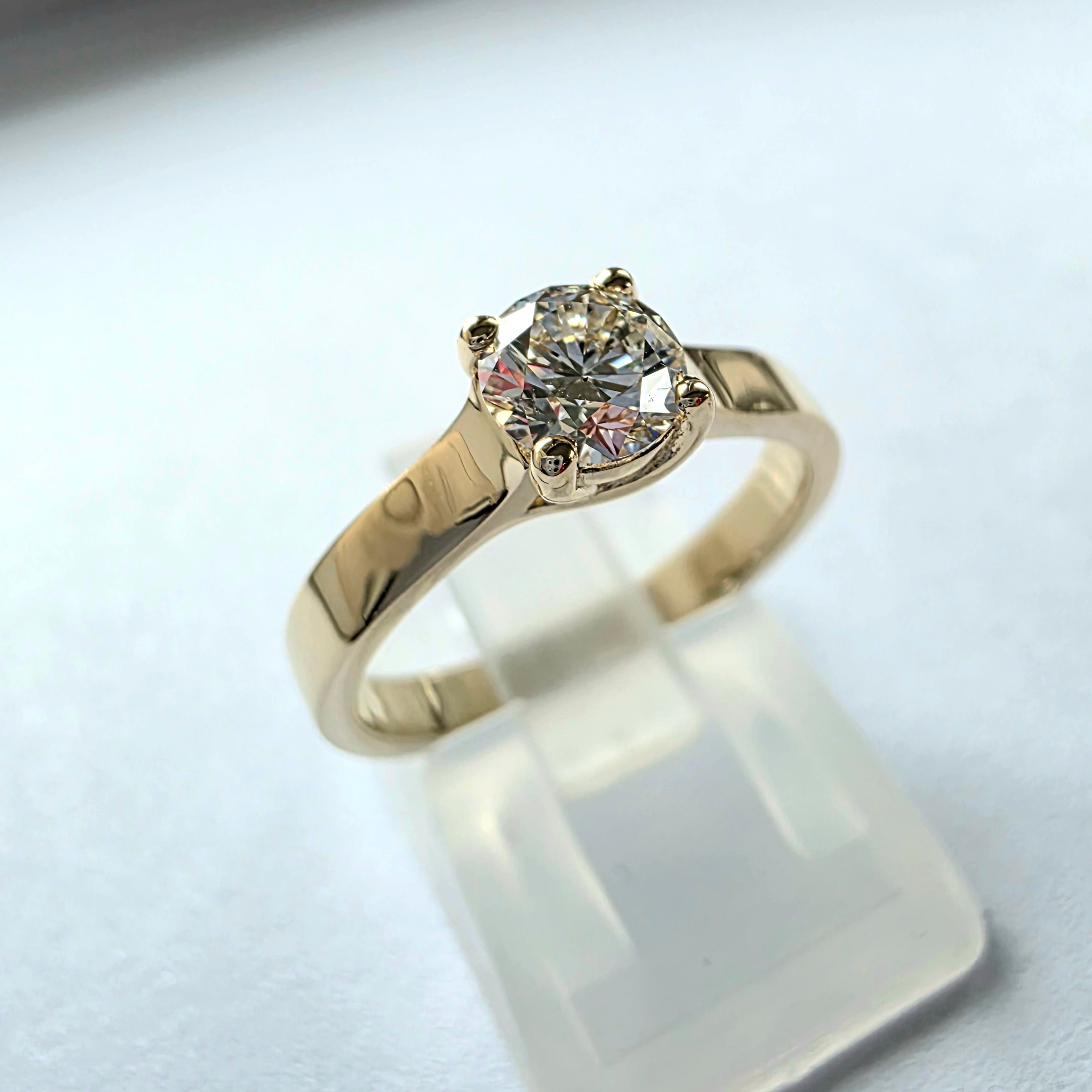 W naszej pracowni stosujemy moissanity o minimalnych parametrach VS1/E, które zapewniają piękną przejrzystość i intensywną grę światła. Szlif brylantowy wydobywa charakterystyczny ogień kamienia, tworząc efektowny kontrast z szeroką powierzchnią złota.