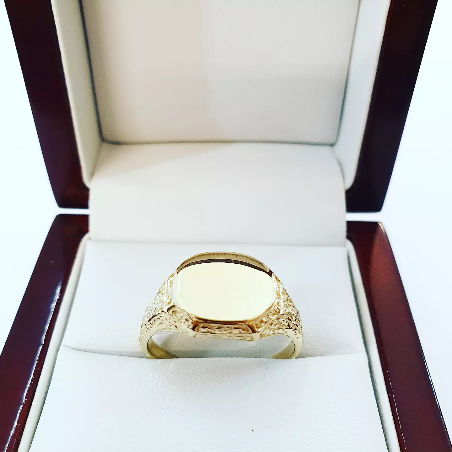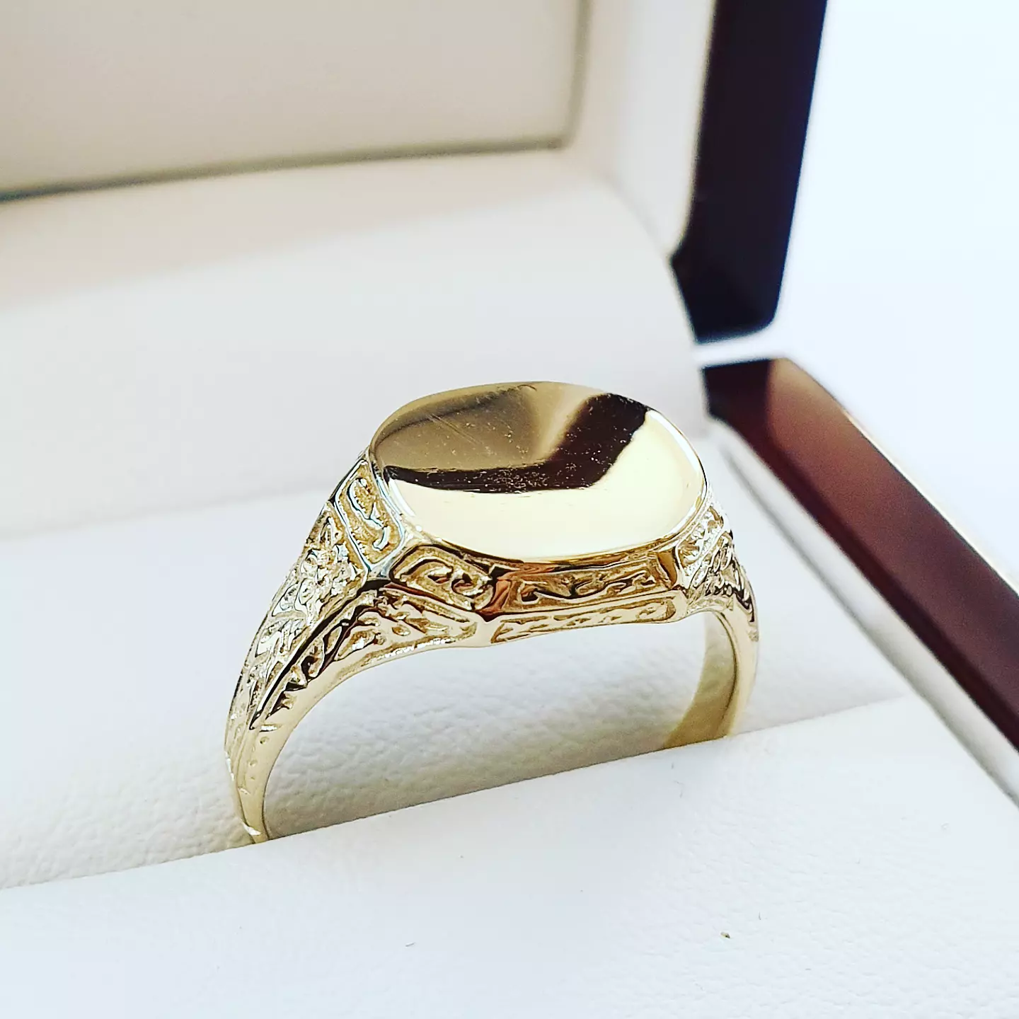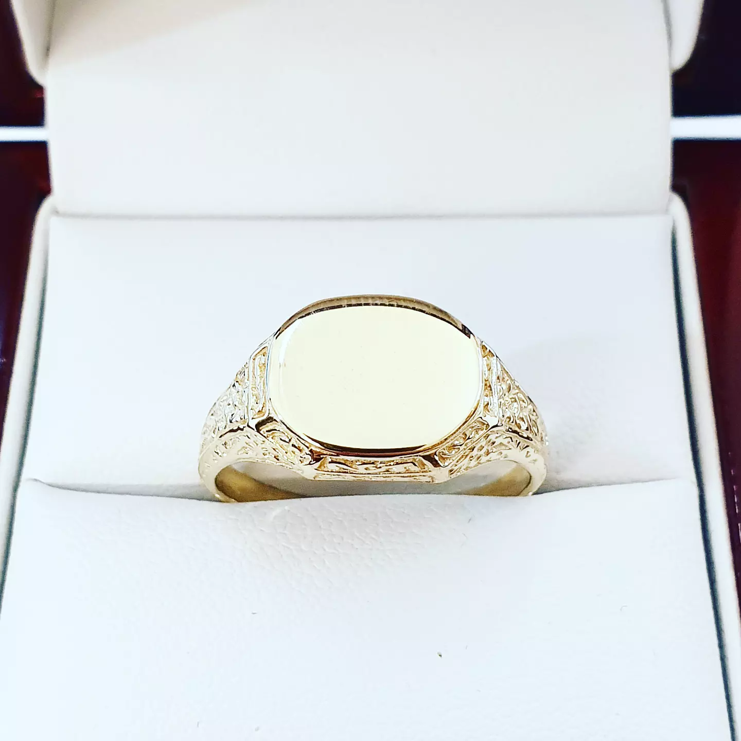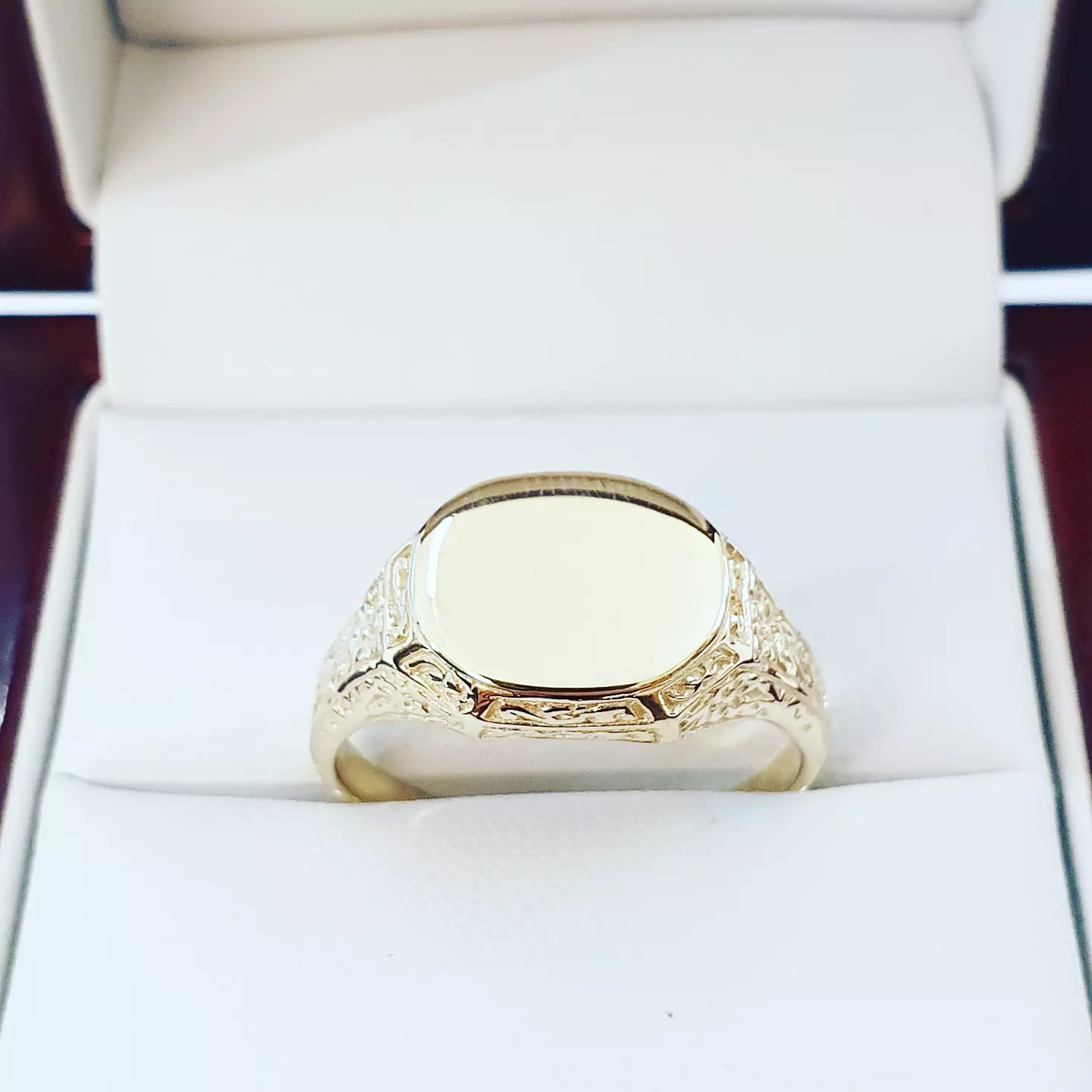 Model wyróżnia się wyważoną bryłą oraz ozdobnymi detalami na bokach, które dodają mu charakteru, nie odbierając elegancji. Gładka tarcza stanowi mocny, minimalistyczny akcent i świetnie nadaje się do personalizacji. To sygnet, który wygląda dobrze solo i pasuje do różnych stylów.