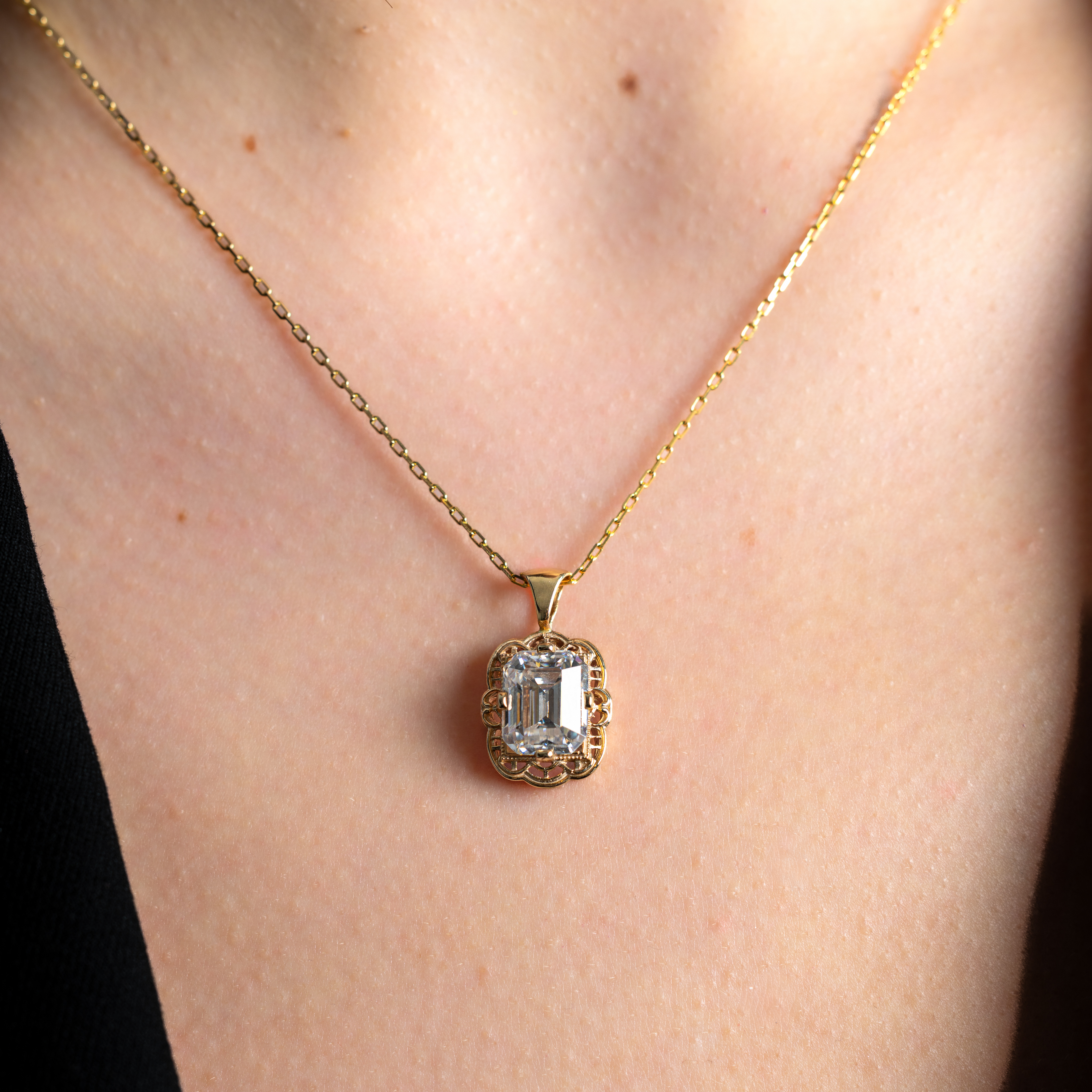 Elegancka zawieszka w stylu vintage / retro art déco, wykonana z żółtego złota próby 585 (14K). Centralnym elementem projektu jest imponujący moissanit o masie około 3,00 ct w absolutnie najwyższych parametrach VVS1/D, osadzony w dekoracyjnej, geometrycznej oprawie inspirowanej klasycznym wzornictwem art déco. Biżuteria została wykonana w naszej rodzinnej pracowni ABgold | Baczyński, z dbałością o detale, proporcje oraz trwałość formy.