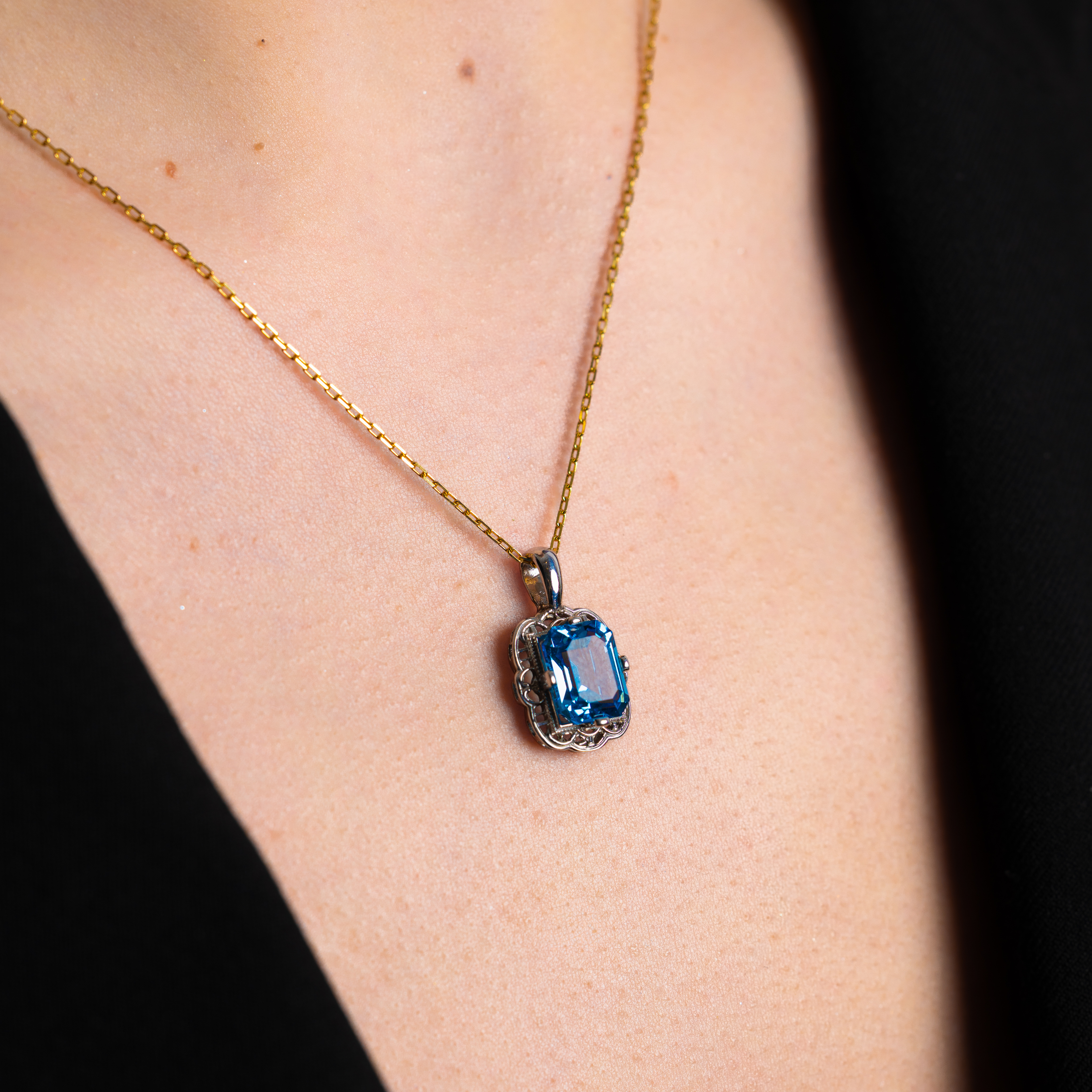 Masa całkowita wyrobu wynosi około 2,87 g. Zawieszka wykonana jest z żółtego złota próby 585. Centralny kamień to topaz Swiss o masie około 4,00 ct, w szlifie szmaragdowym (emerald), o wymiarach około 10 × 7,5 mm. Całość dopełnia elegancka oprawa, która podkreśla kamień i nadaje kompozycji wyjątkowego stylu.