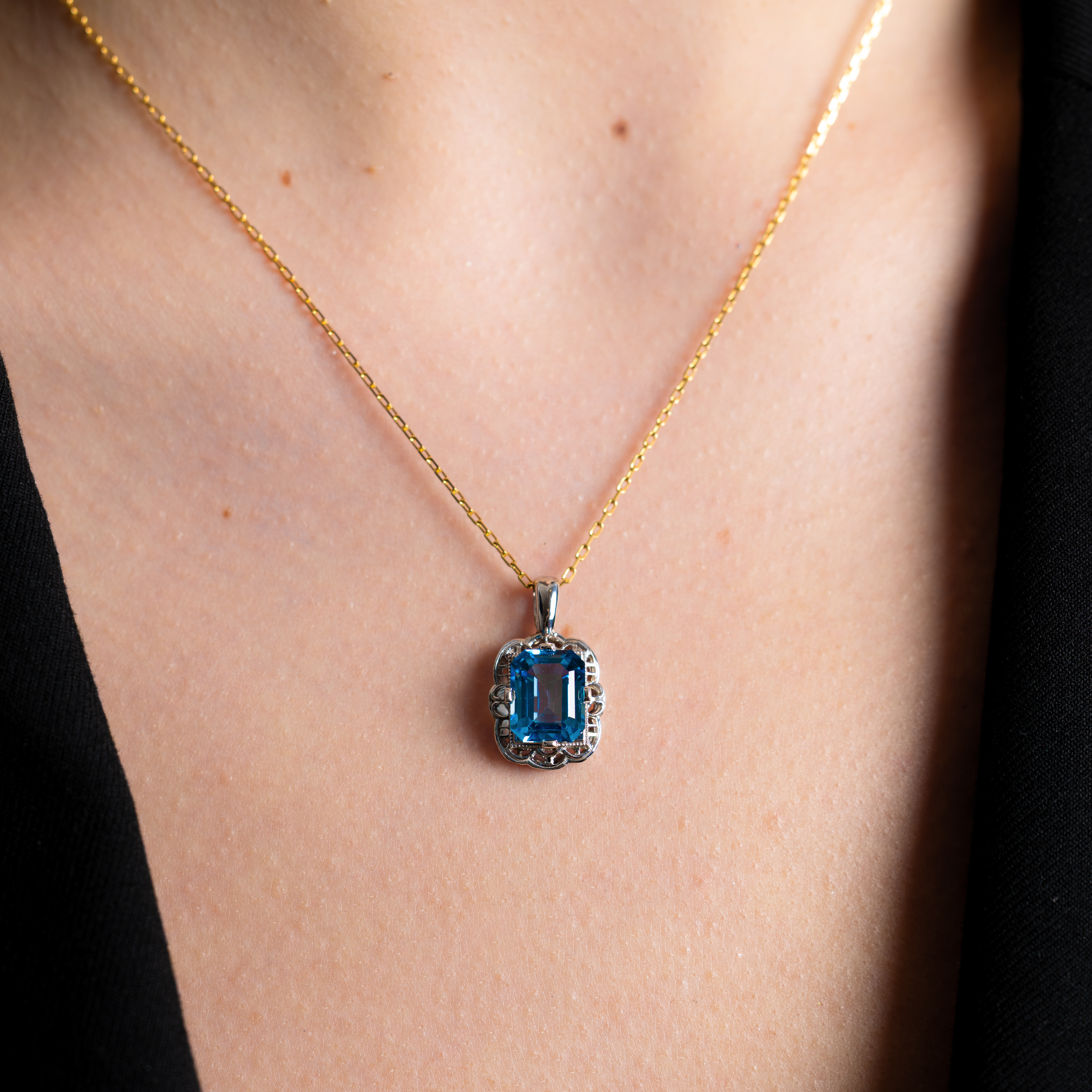 Elegancka zawieszka, ręcznie wykonana z żółtego złota próby 585 (14K), ozdobiona topazem Swiss o masie około 4,00 ct. Kamień w szlifie emerald (szmaragdowym) o wymiarach około 10 × 7,5 mm podkreśla geometrię formy i nadaje biżuterii wyrazisty, luksusowy charakter.